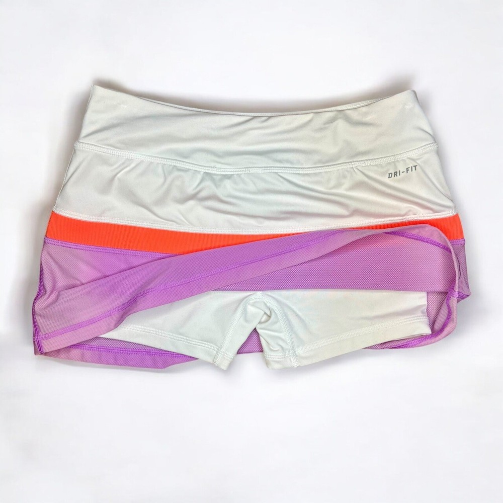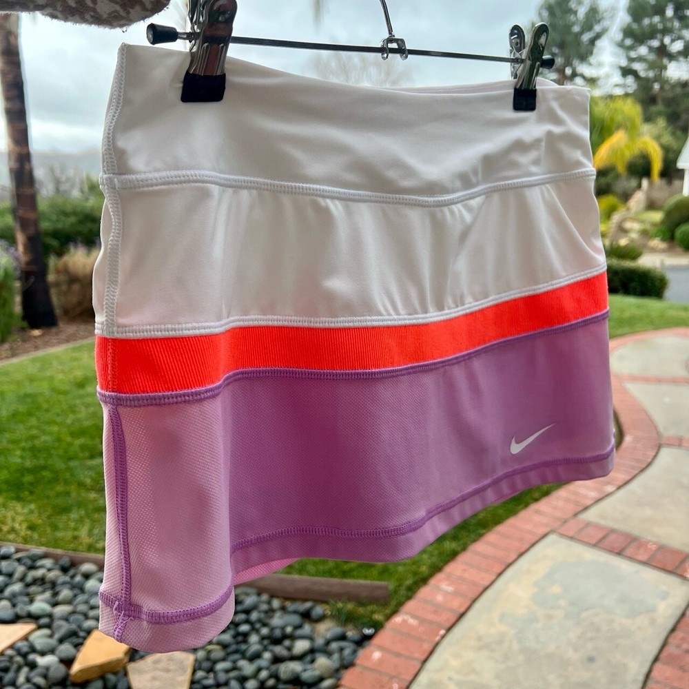 Nike Nike Dri-Fit Tennis Skirt / Skort Women’s Size Small in White, Peach and Purple Condition: Good preloved, no major callouts Details: Built in liner Designed for athletic court use Color block design Dri-Fit technology fabric, with stretch 100% Polyester Approximate measurements: 28” Waist, 35” with Stretch, 36” Hips, 11.5” Length All orders ship the same or next day! Tags: Golf, Sports, Colorblock, Drifit, Sporty, Athletic, Preppy, Activewear, Casual, Workout, Athleisure