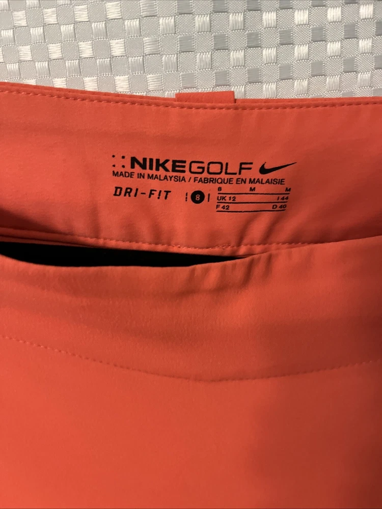This Nike Dri-Fit Skort is perfect for any active woman. With a beautiful orange color and Nike logo accents, it's a stylish addition to any sportswear collection. The skort is made of polyester blended fabric and features a flat front and zip closure. It's designed to be athletic and comfortable, with a mid-rise and belted features that provide a perfect fit. The skort is machine washable and perfect for any occasion, whether it's for activewear or casual wear. It's a great choice for golfers and other athletes who want to look good while feeling comfortable.