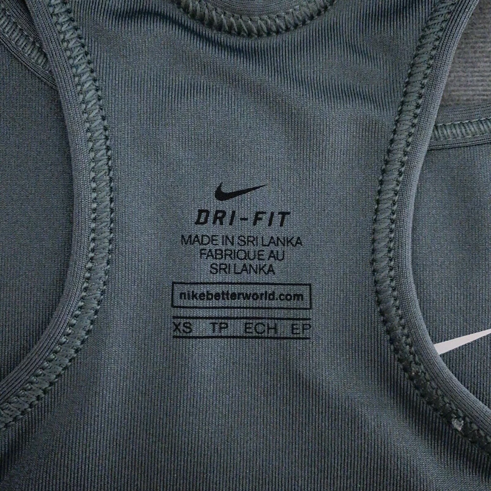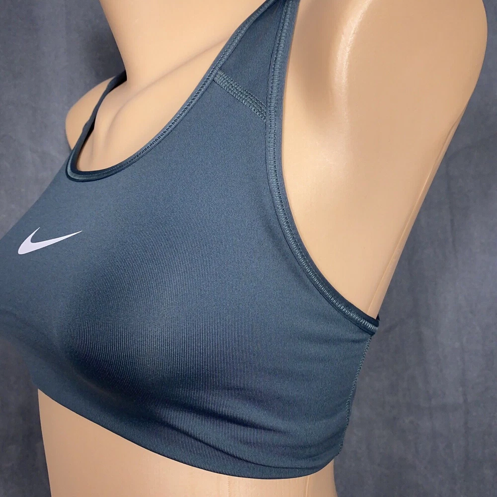 Size: XS Style: Sports Bra Pattern: Solid Accents: Logo Strap Type: Racerback Personalize: No Occasion: Activewear Closure: Pullover Type: Bra Color: dark sage green Theme: Sports Cup Coverage: Full Product Line: Nike Dri-FIT Brand: Nike Band Size: XS Size Type: Regular Department: Women Performance/Activity: Any Performance/Activity Features: logo Cup Size: One Size Underwire Type: Wireless Country/Region of Manufacture: Sri Lanka Support Level: Medium Fabric Type: Blended Fabric