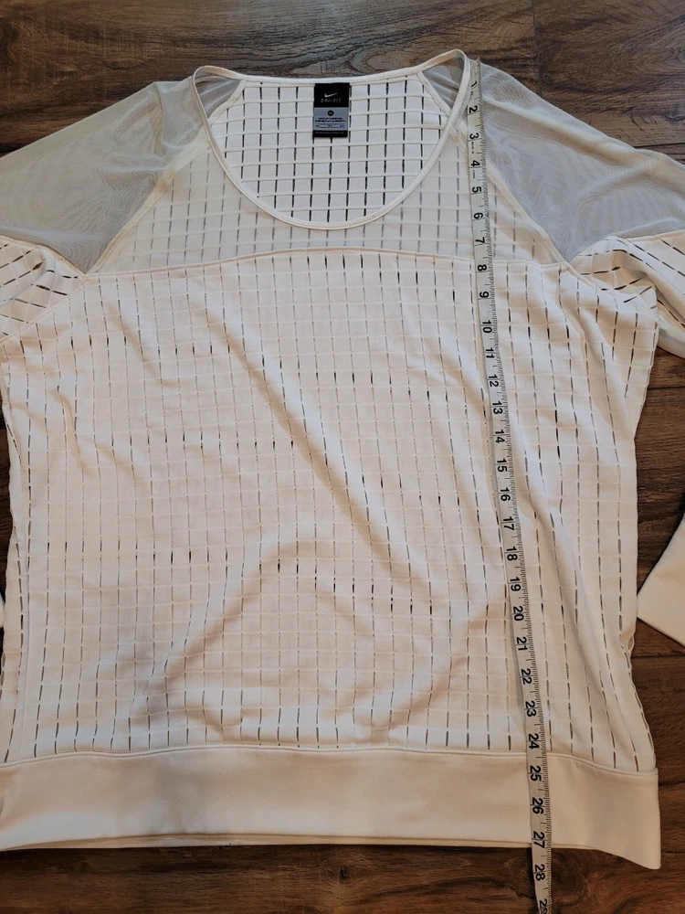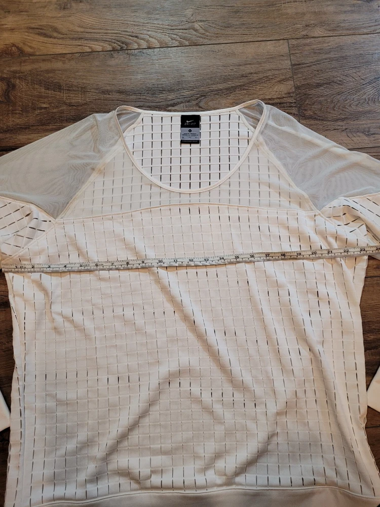 This Nike Dri-Fit sweatshirt top is perfect for active women who want to stay comfortable while working out. The top features a scoop neck and long sleeves with a solid pattern and ivory color. It is made of a nylon blend mesh fabric that allows for ventilation and breathability during intense workouts. The sweatshirt also has the Nike logo on it, making it a stylish choice for athletic women. The women's sweatshirt is a size XL and has a regular fit, making it a great choice for women who want a comfortable and relaxed fit. It is designed for athletic activities and can be worn for a variety of workouts. This Nike Dri-Fit sweatshirt is a must-have for women who want to stay comfortable and stylish while working out. K