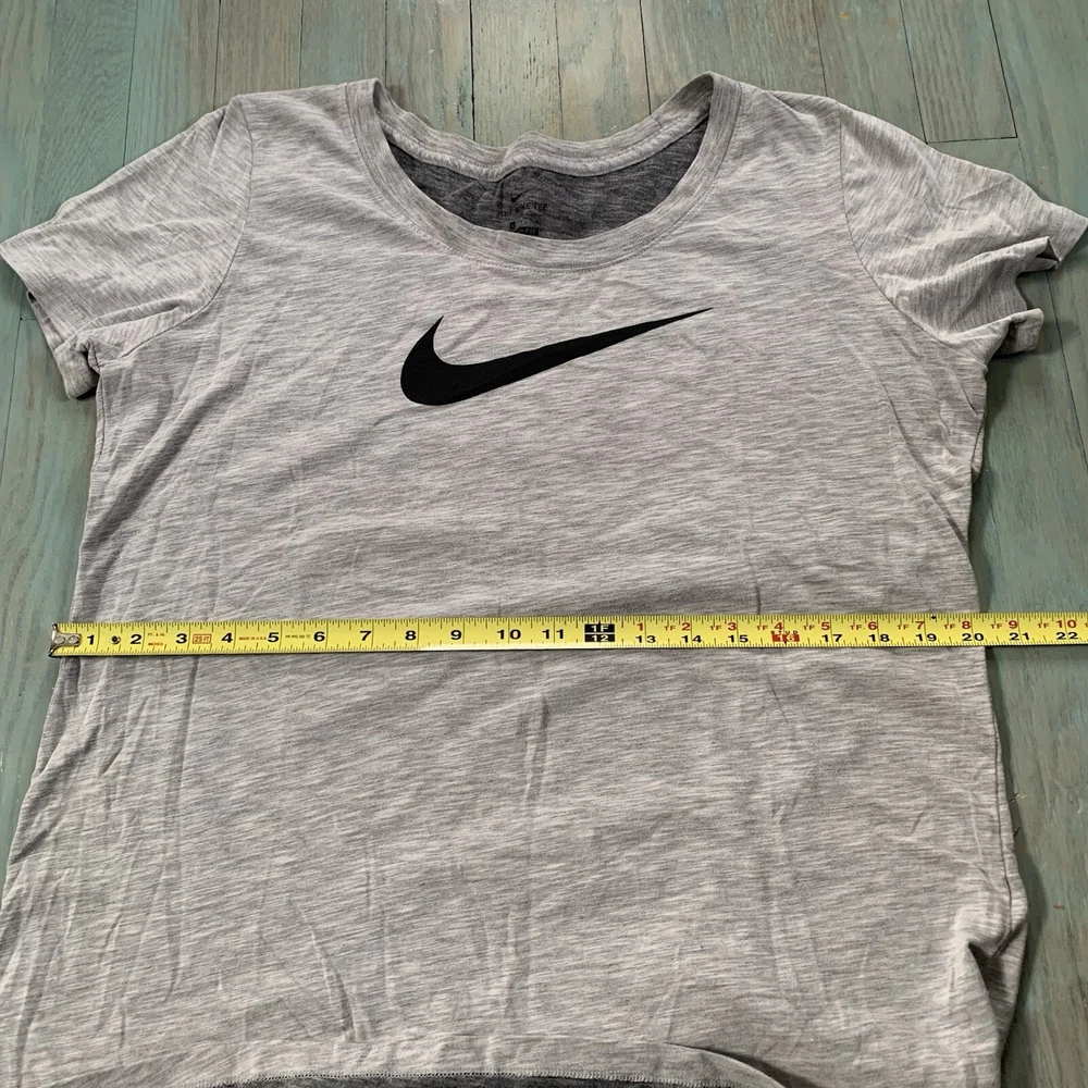This Nike Dri-Fit Women Gray Crop Athletic Tee in size L features a Crew Neck neckline and Short Sleeve design, making it ideal for activewear. Made of lightweight and breathable cotton material, it offers easy care and can be worn in all seasons. The solid color adds a touch of style to the cropped tee, which showcases the Nike logo and "Just Do It" theme. Perfect for gym workouts, running, or everyday leisure activities, this top is a comfortable and functional addition to any athletic wardrobe. Measurements in photos