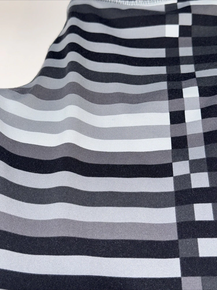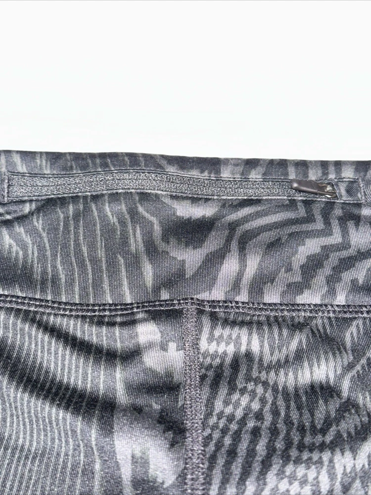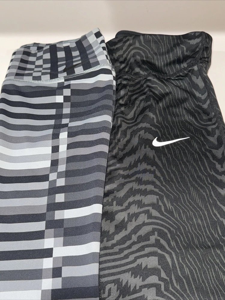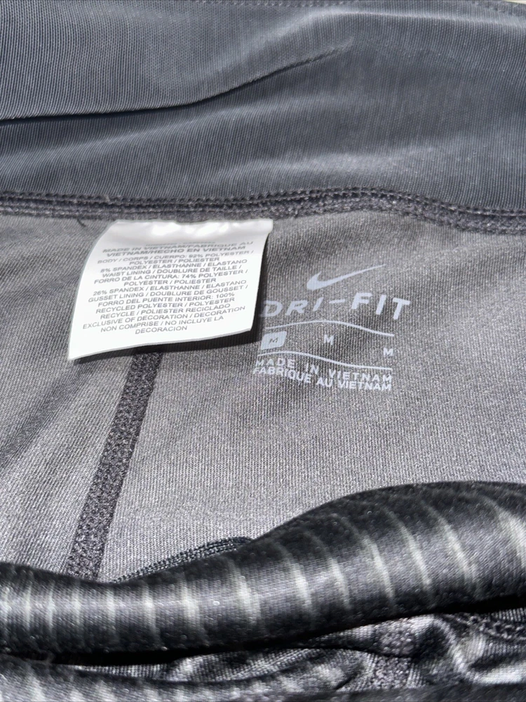 Elevate your activewear game with these Nike Dri-Fit leggings capris. The black and grey colorway with white accents is perfect for any athleisure outfit. Made with a blend of polyester and spandex, these leggings are machine washable and have an elastic waist for a comfortable fit. Ideal for gym and training, cross training, dance, CrossFit, yoga, and bodybuilding, these leggings have a mid-rise and are available in size M with a waist size of 24 inches. The Nike Dri-Fit technology wicks away sweat, keeping you cool and dry during your workouts. Show off your love for sports and fitness with these stylish leggings capris.