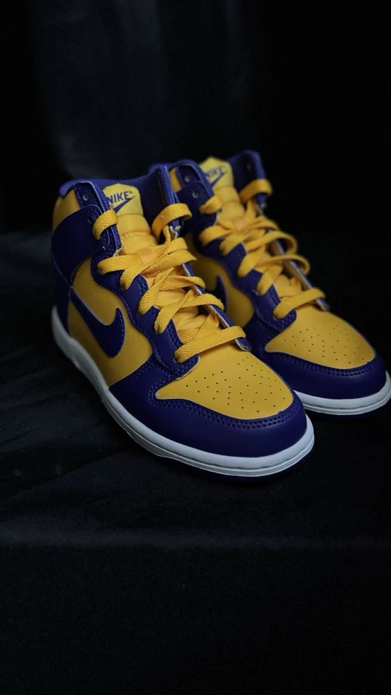 Step up your game with the Nike Dunk High Kids Size 1Y in the iconic Yellow Court Purple colorway, inspired by the legendary Lakers team. These stylish and comfortable high-top sneakers feature a premium design, perfect for young athletes and sneaker enthusiasts alike. Whether on the court or out on the streets, these shoes provide both performance and bold, standout style. Key Features: • Premium Materials: Crafted with high-quality leather and durable synthetic overlays for a smooth, premium feel. • Bold Colorway: Vibrant Yellow and Court Purple combination pays tribute to the Lakers’ iconic colors. • Classic Dunk High Design: High-top silhouette provides ankle support and a timeless, athletic look. • Comfortable Fit: Cushioned midsole for comfort and support throughout the day. • Durable Outsole: Rubber outsole with a classic herringbone pattern ensures excellent traction for both indoor and outdoor activities. • Perfect for Kids: Designed with young feet in mind for a comfortable, secure fit with easy-on laces. Specifications: • Model: Nike Dunk High • Size: 1Y (Youth) • Colorway: Yellow Court Purple • Style Code: DZ4455-500 • Condition: Brand New Condition: These Nike Dunk High shoes are brand new, unworn, and come in their original box. The shoes are in perfect condition with no signs of wear or damage. Give your young one a boost in both style and comfort with these Nike Dunk High Lakers-inspired high-top sneakers. Perfect for daily wear, sports, or as a standout addition to any sneaker collection!
