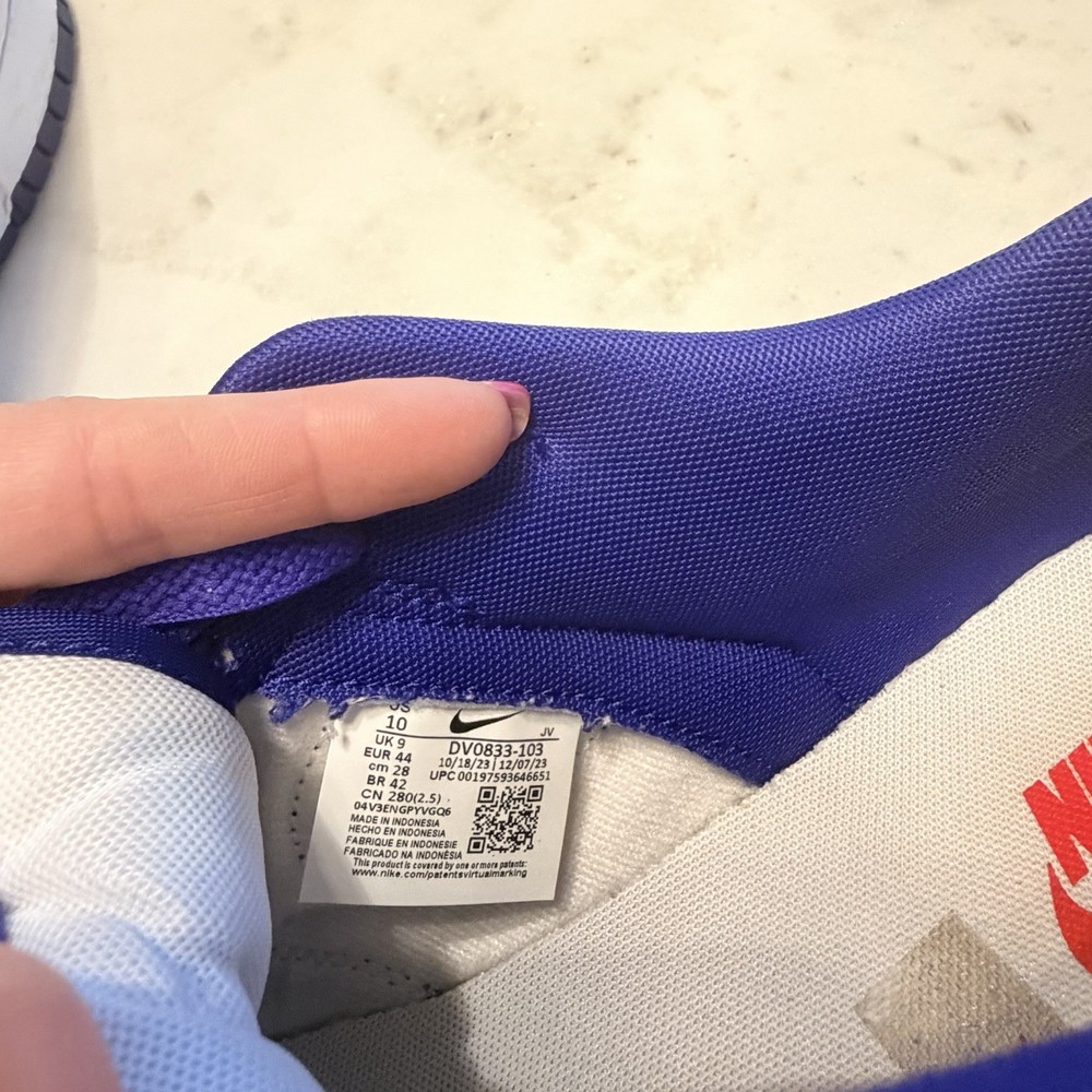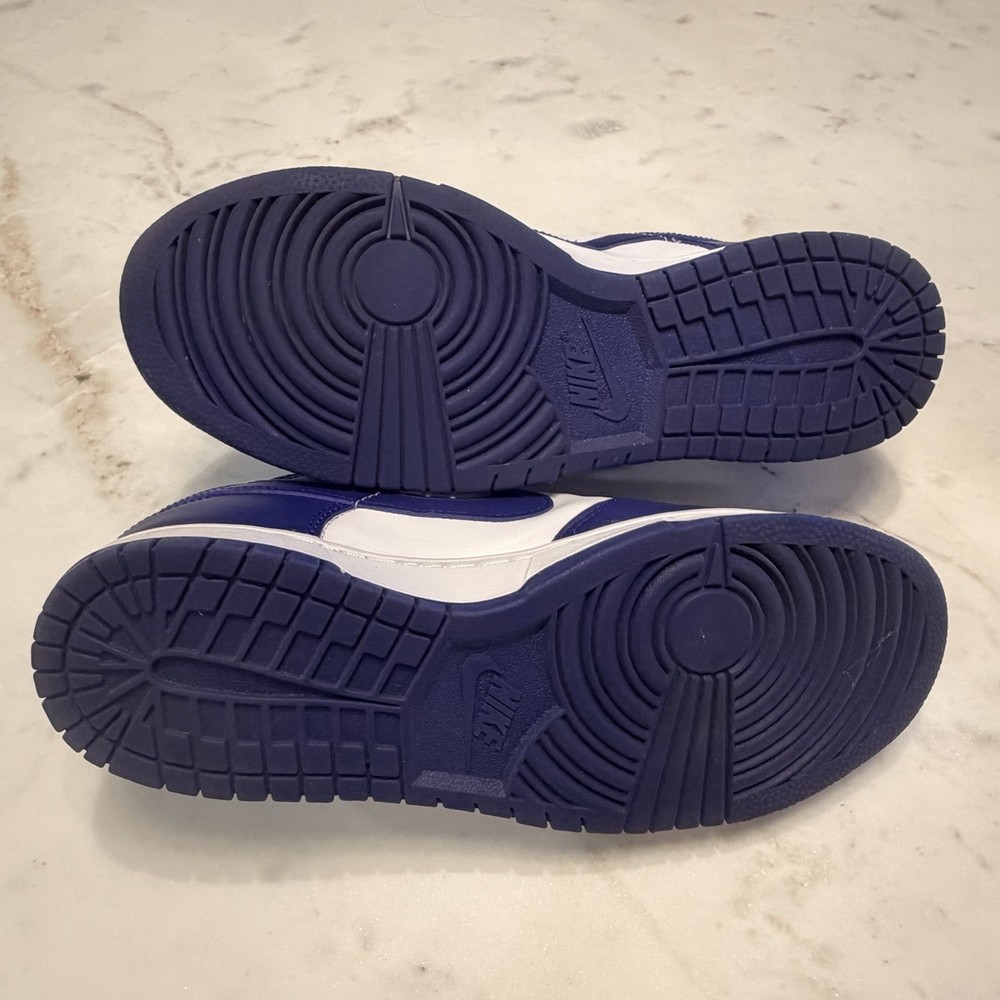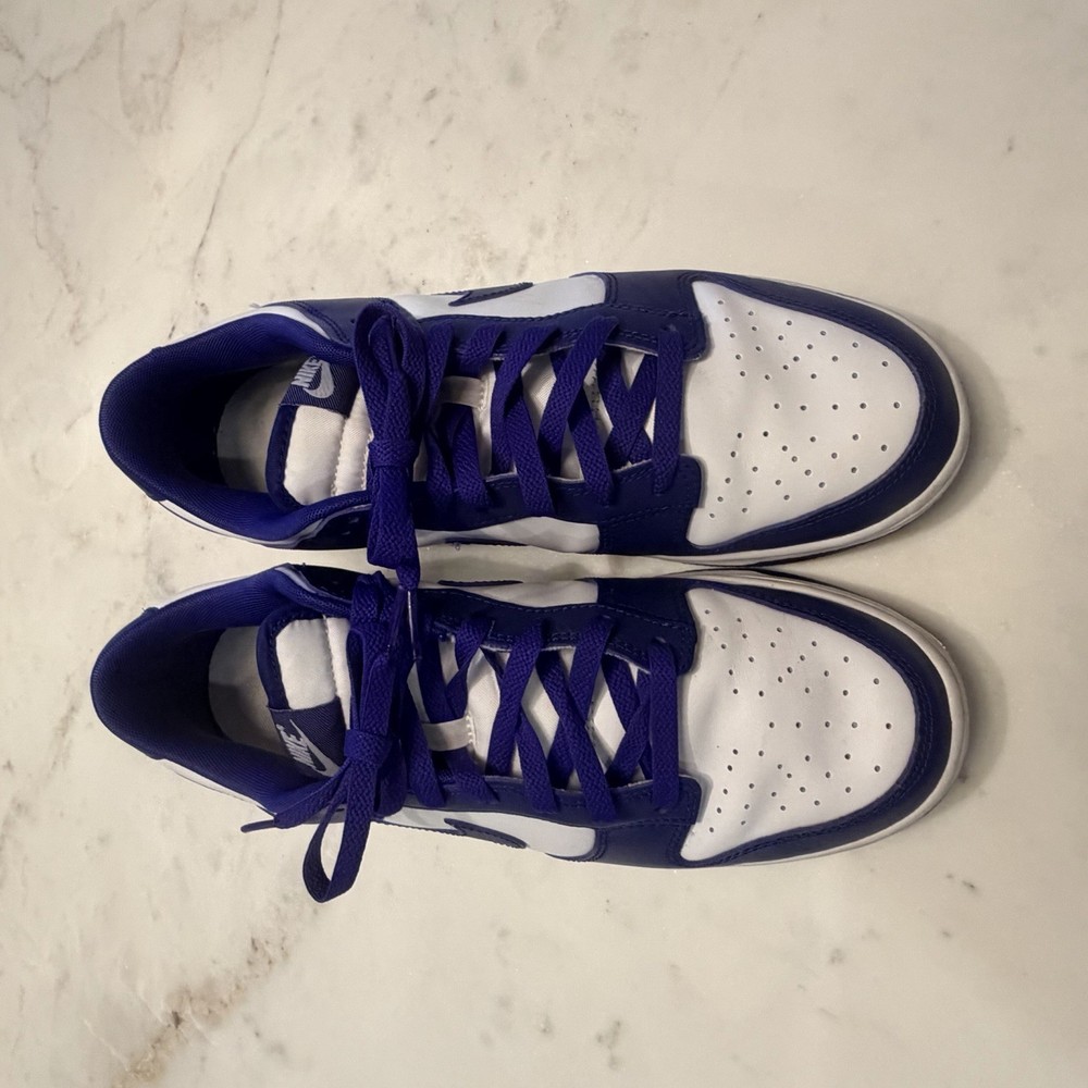The Nike Dunk Low Concord Royal Blue and White DV0833-103 Leather Upper Low Top sneakers are stylish athletic shoes for men. Excellent, used condition. Featuring a lace-up closure, leather upper, rubber outsole, and a low-top silhouette, these sneakers are perfect for activewear and casual occasions. With a solid blue color and white accents, these Nike Dunks have a sporty theme and are designed for performance activities like gym training, walking, and even schoolwear. The standard shoe width and comfortable design make them a versatile option for the modern man looking for both style and functionality in their footwear.