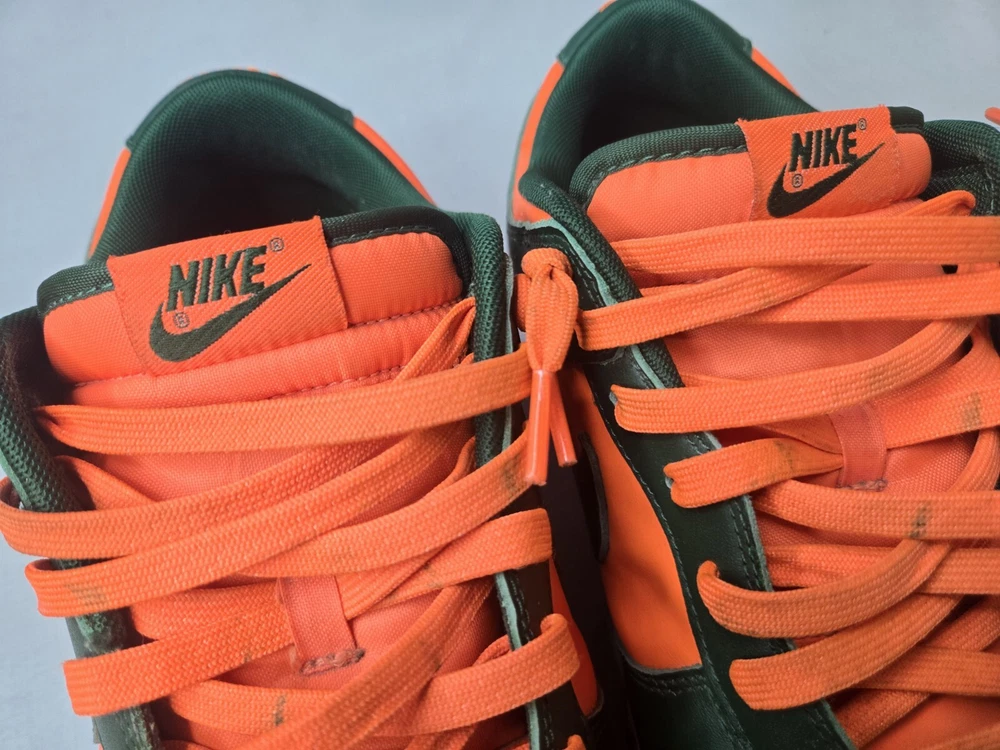 Elevate your sneaker game with these Nike Dunk Low Miami Hurricanes Gorge Green Orange Sneakers. The lace-up closure ensures a secure fit while the rubber outsole provides traction and durability. Made with breathable leather upper material and synthetic lining material, these sneakers are perfect for summer, fall, and spring seasons. The Nike Dunk Low sneakers are a must-have for any sneakerhead, whether you're going to school, skateboarding, or playing basketball. The colorblock pattern adds a touch of retro and university-themed design, with characters like Astro Boy, Boba Fett, and Steph Curry. These standard-width sneakers come in US shoe size 12 and UK shoe size 11, with an EU shoe size of 46. Get your hands on these Nike Dunk Low Miami Hurricanes Gorge Green Orange Sneakers now!