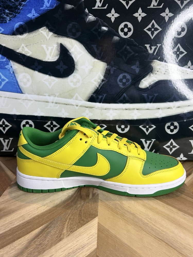 Step up your sneaker game with these limited edition Nike Dunk Low Reverse Brazil Premium Oregon Ducks DV0833 300 sneakers. Designed for men, these athletic shoes are perfect for walking, skateboarding, or basketball. The sleek green color with yellow strike-white accents and apple green/yellow strike-white manufacturer color make for a stylish addition to any outfit. Crafted from high-quality leather, these sneakers are both lightweight and comfortable, featuring a standard shoe width and a low-top shoe shaft style. The Nike Dunk Low sneakers are perfect for college and NCAA fans, with a nod to the Mighty Ducks theme. Don't miss out on the chance to own these rare, sold-out sneakers, a must-have for any sneakerhead collection.