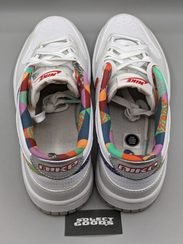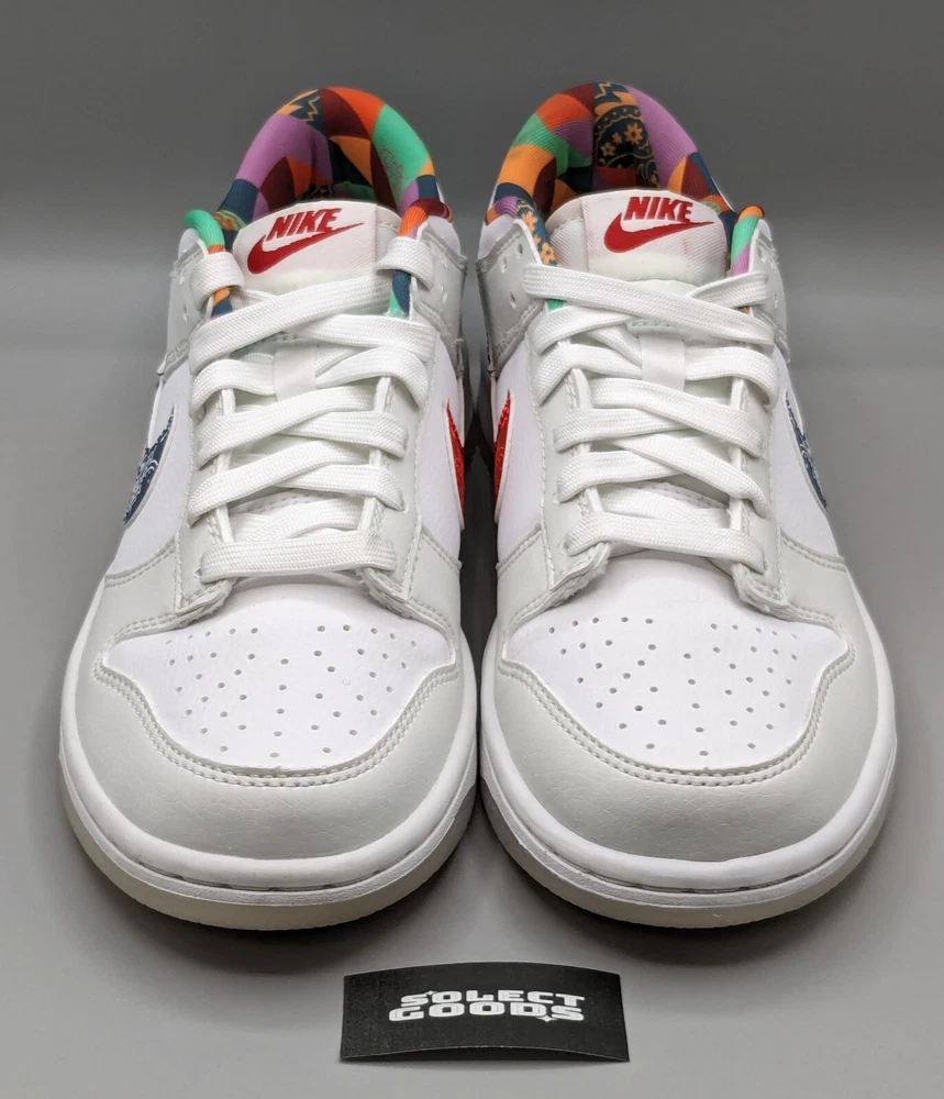 Nike Dunk Low Sneakers. Style code: FN8913-141. Pre-owned but in great condition! Light wear as shown on soles. Comes in White, Multi-Color Paisley and Size 4.5Y or Women's Size 6 (shoe tag will show 4.5y). Complete with the original box. The shoe box has some damage as shown in the photos.