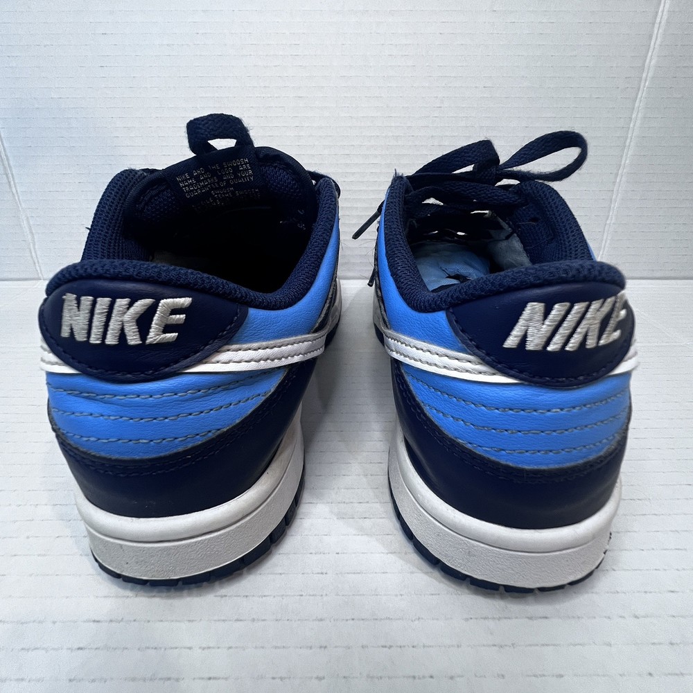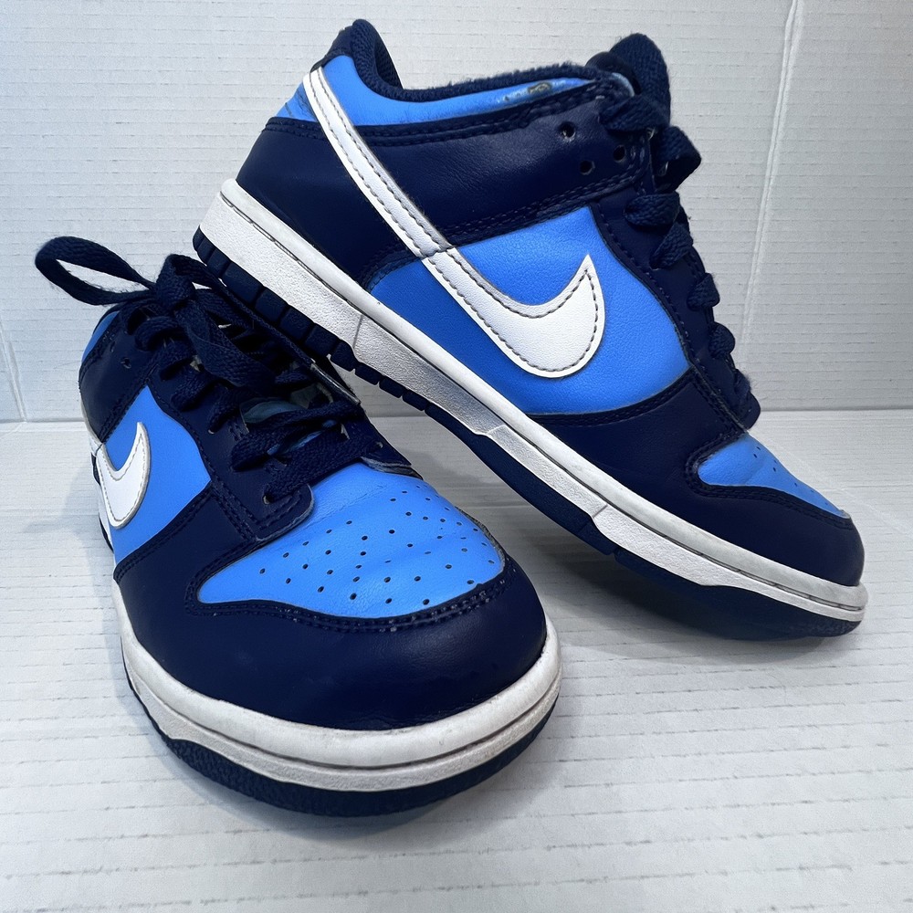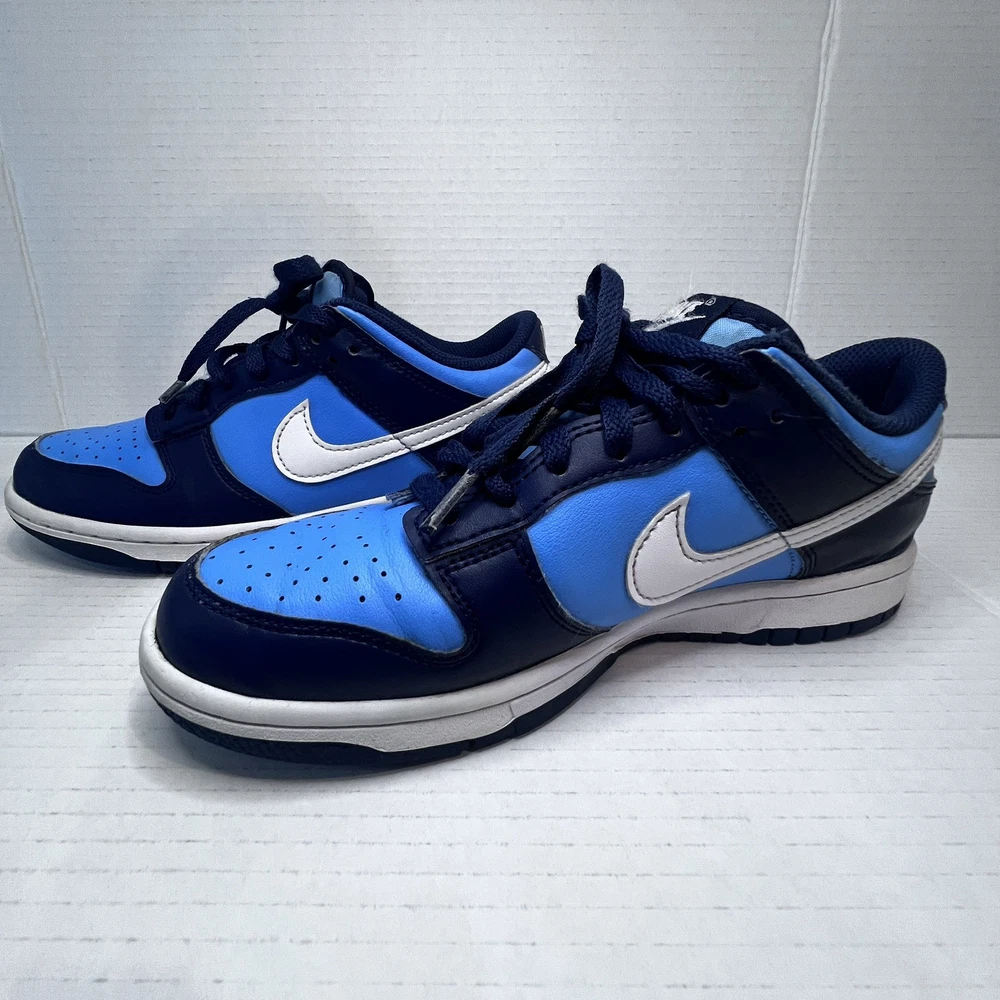 The Nike Dunk Low Shoes in Youth Size 5.5Y are a stylish and comfortable choice for active kids. Featuring a colorblock pattern in University Blue and Navy, with a lace-up closure for a secure fit, these sneakers are perfect for basketball or everyday wear. Made with leather uppers and a foam insole, these athletic shoes offer both durability and cushioning for all-day comfort. The Nike Dunk Low model combines classic sneaker style with the iconic Nike brand, making them a popular choice for fashion-conscious kids. Footwear are in good shape cleaned and sanitized,may show some signs of lite surface wear.Look at the pictures ,they represent the description. Color tones may differ lightly due to the lighting and angles of the camera. 787_Sneakers_N_More