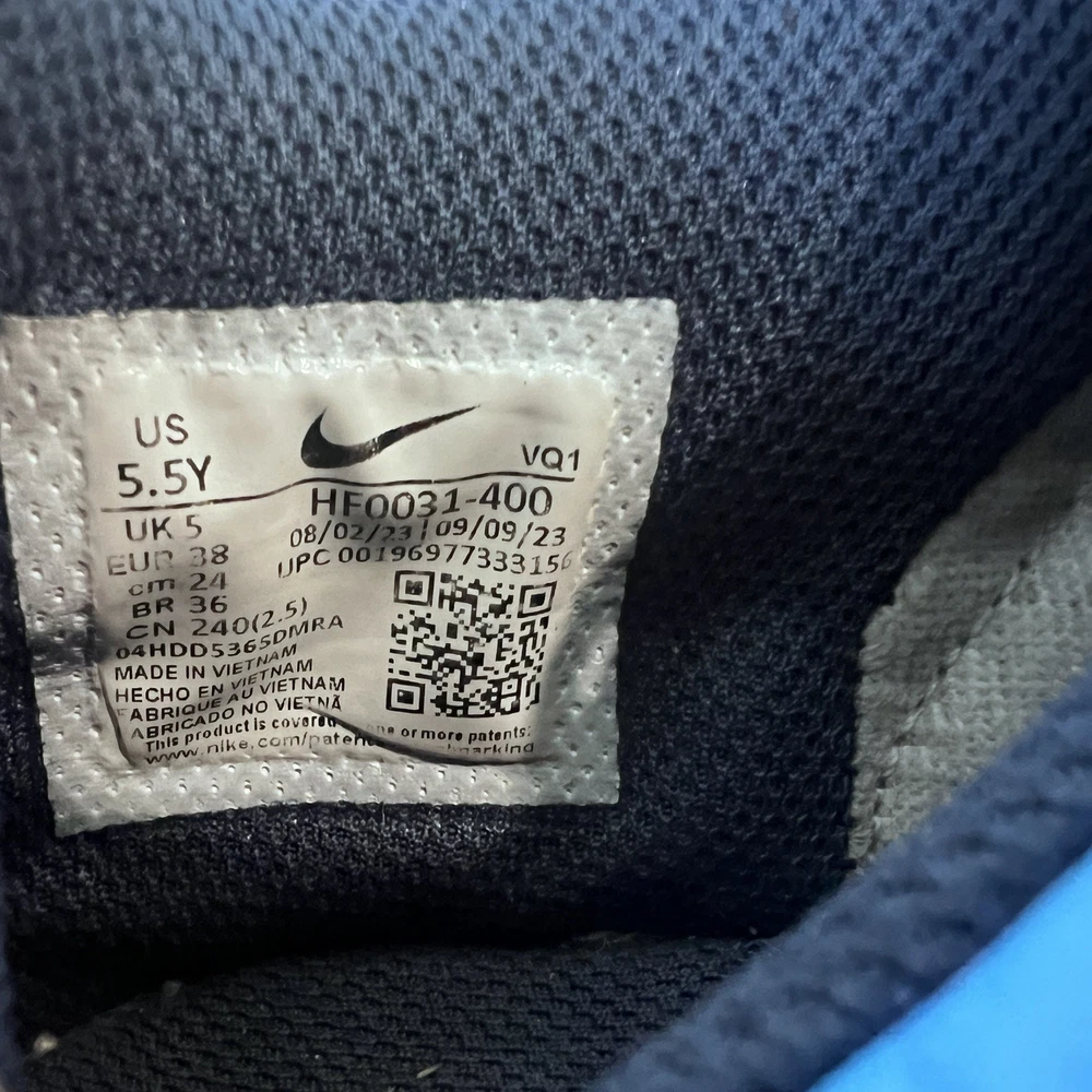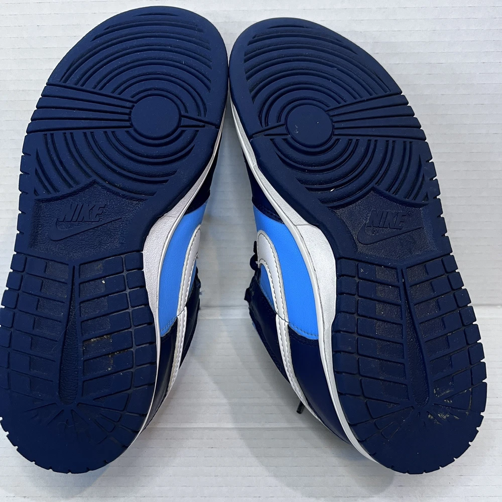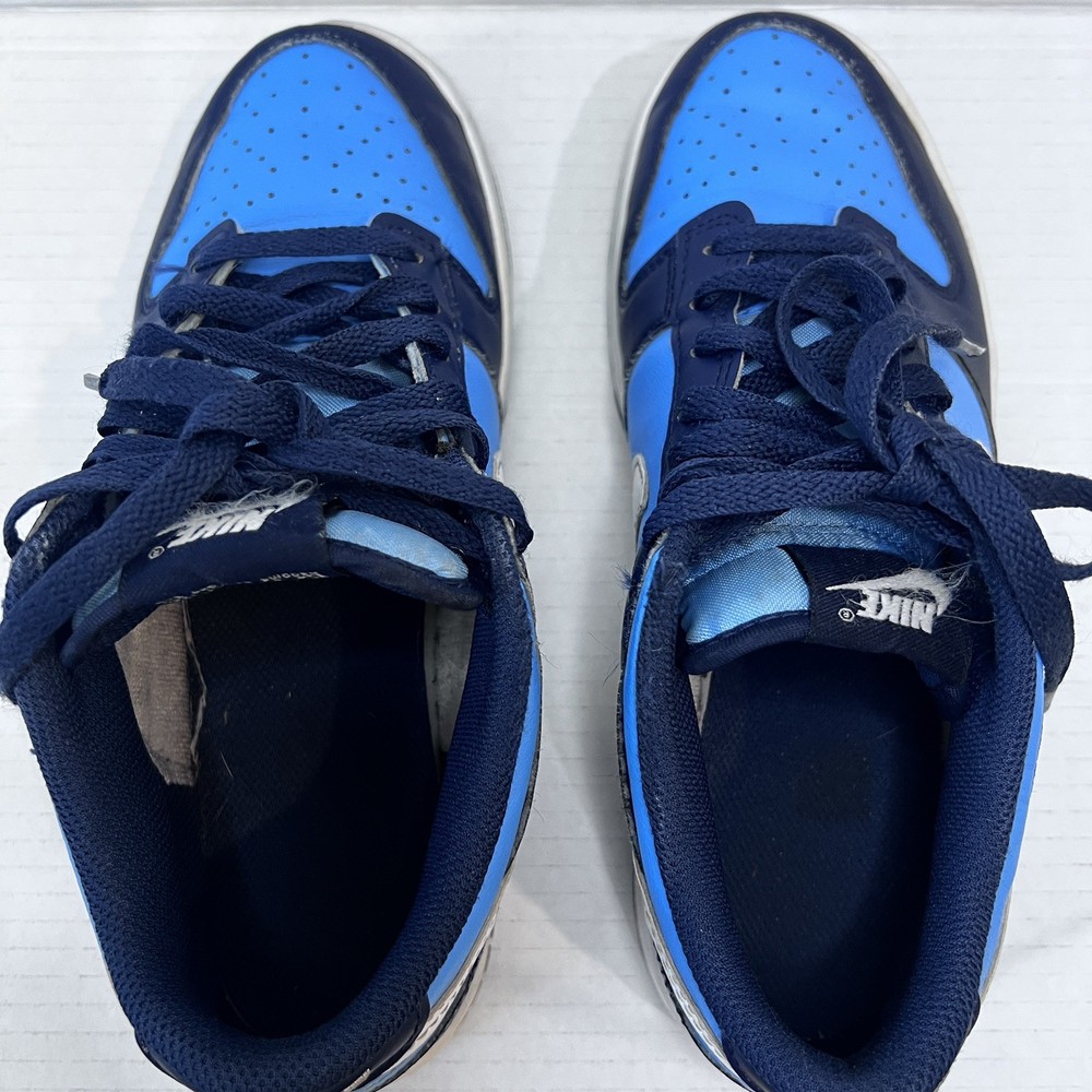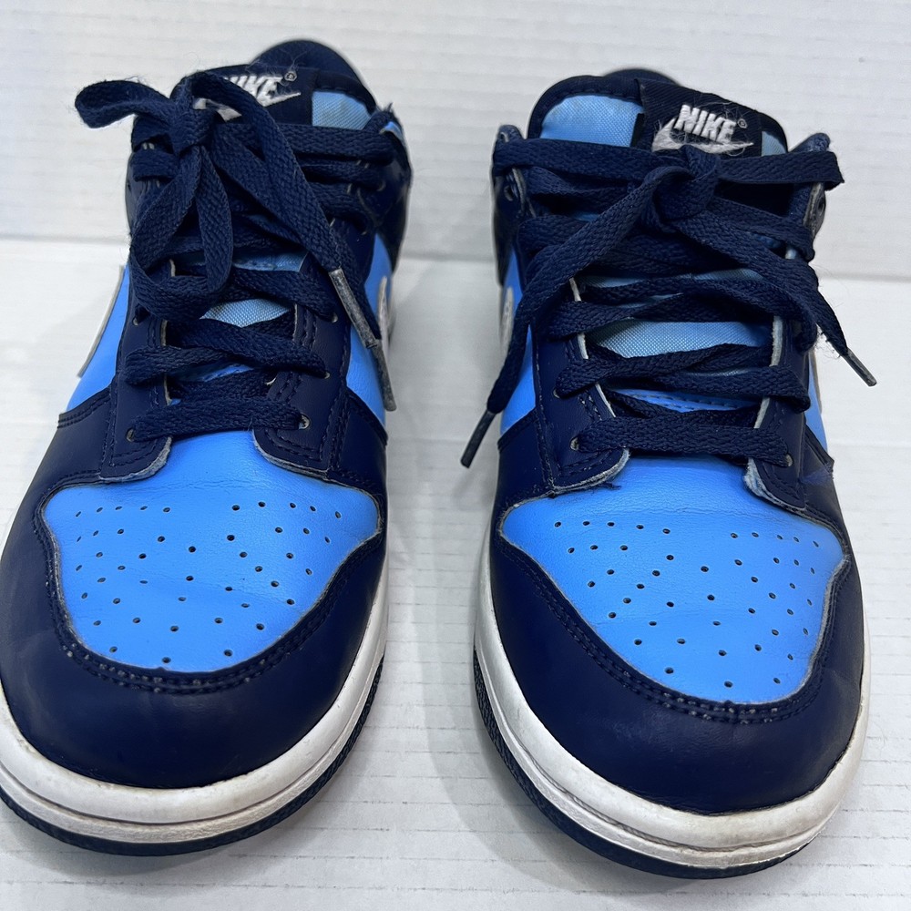 The Nike Dunk Low Shoes in Youth Size 5.5Y are a stylish and comfortable choice for active kids. Featuring a colorblock pattern in University Blue and Navy, with a lace-up closure for a secure fit, these sneakers are perfect for basketball or everyday wear. Made with leather uppers and a foam insole, these athletic shoes offer both durability and cushioning for all-day comfort. The Nike Dunk Low model combines classic sneaker style with the iconic Nike brand, making them a popular choice for fashion-conscious kids. Footwear are in good shape cleaned and sanitized,may show some signs of lite surface wear.Look at the pictures ,they represent the description. Color tones may differ lightly due to the lighting and angles of the camera. 787_Sneakers_N_More