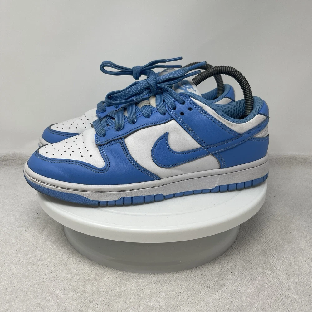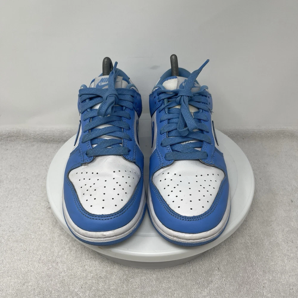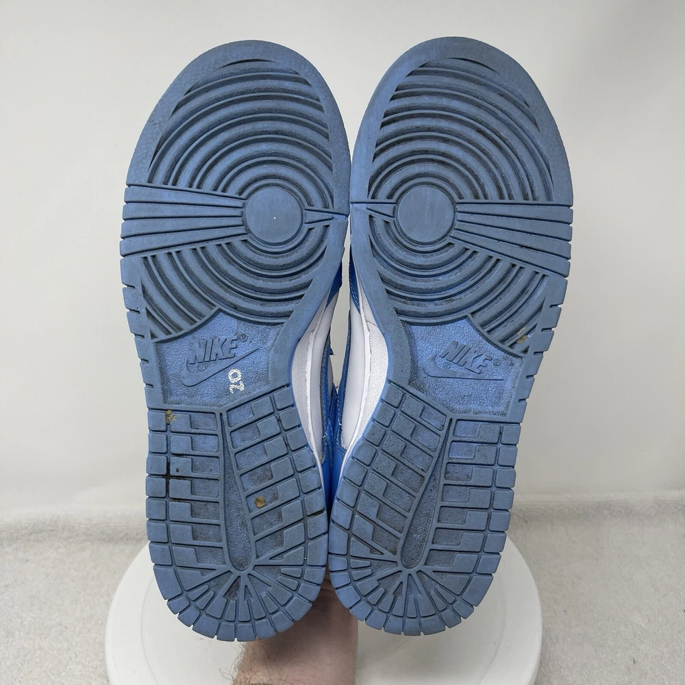 The Nike Dunk Low UNC University Blue Shoes are unisex sneakers featuring a low-top design in a solid blue color with the iconic Nike logo accents. These athletic shoes have a lace-up closure and are crafted with leather uppers and fabric lining for comfort. They are designed for various activities such as boxing, CrossFit, and basketball, offering arch support, cushioning, and a rubber outsole for enhanced performance. The sneakers are part of the Nike Dunk product line and have a stylish university theme, making them a colorful and versatile choice for both men and women. MENS 6.5 / WOMENS 8