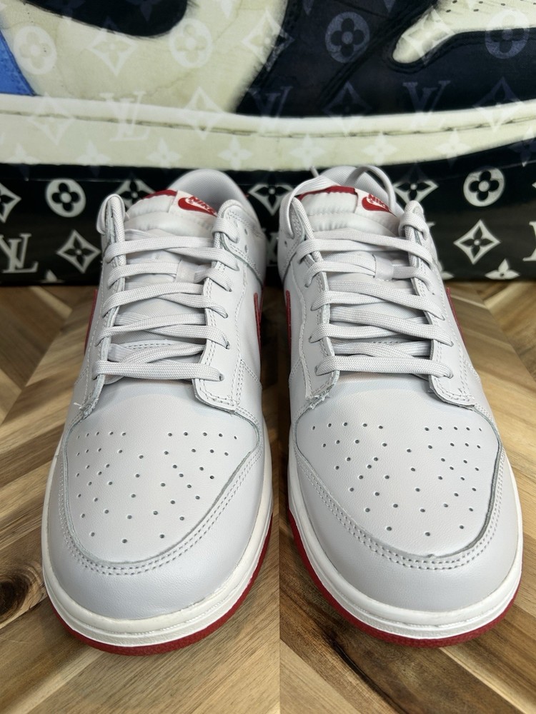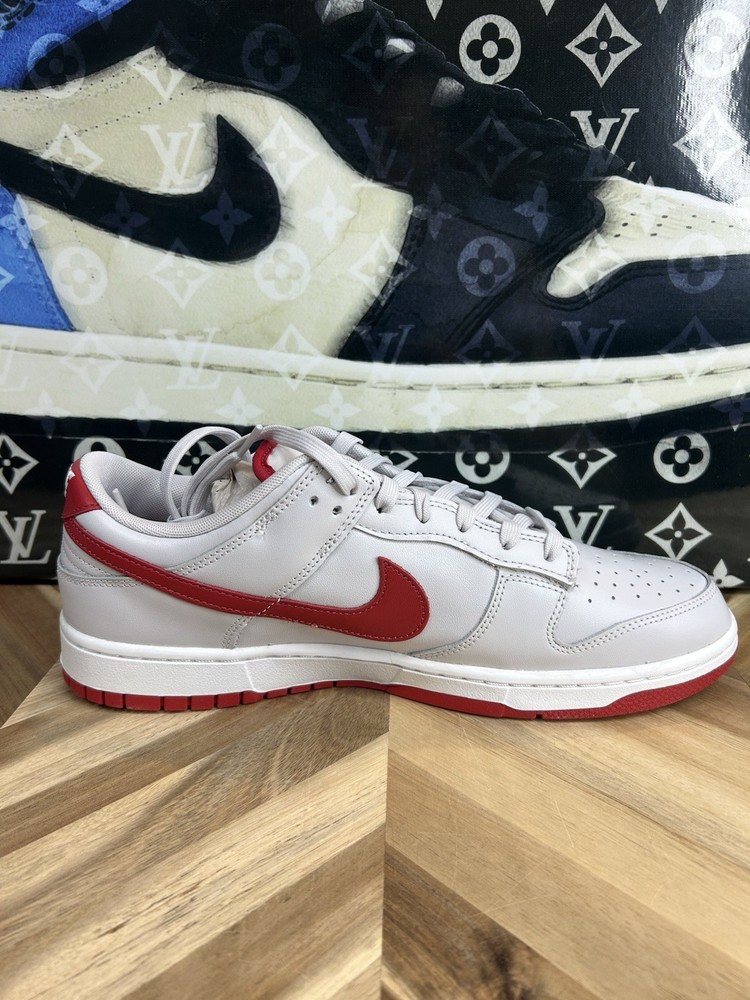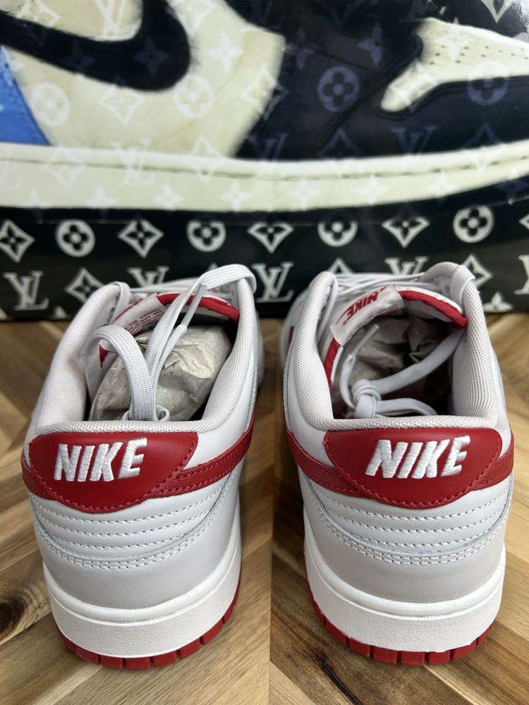 Step up your sneaker game with these brand new Nike Dunk Low shoes. Featuring a stylish colorblock design in varsity red and white, these shoes are perfect for any fan of basketball or skateboarding. The low top style and standard shoe width make them comfortable and easy to wear for any activity. Crafted with a cushioned and breathable foam insole and a durable rubber outsole, these Nike Dunk Low shoes are perfect for walking, skateboarding, or basketball. The lace-up closure ensures a secure fit, while the synthetic lining material and leather upper material provide a comfortable feel. These shoes are a rare find and a must-have for any sneaker collector.