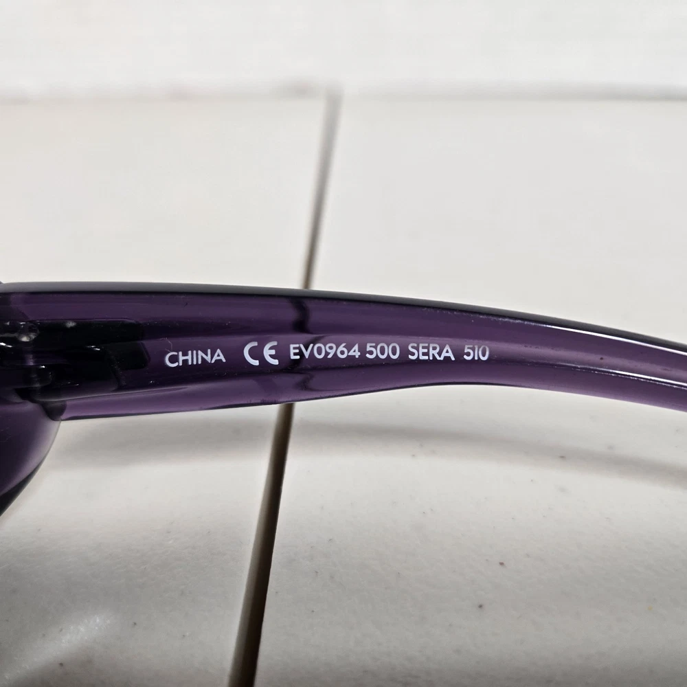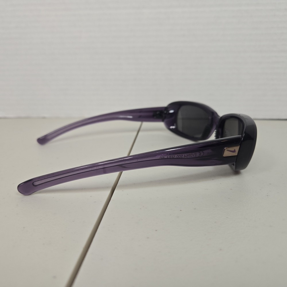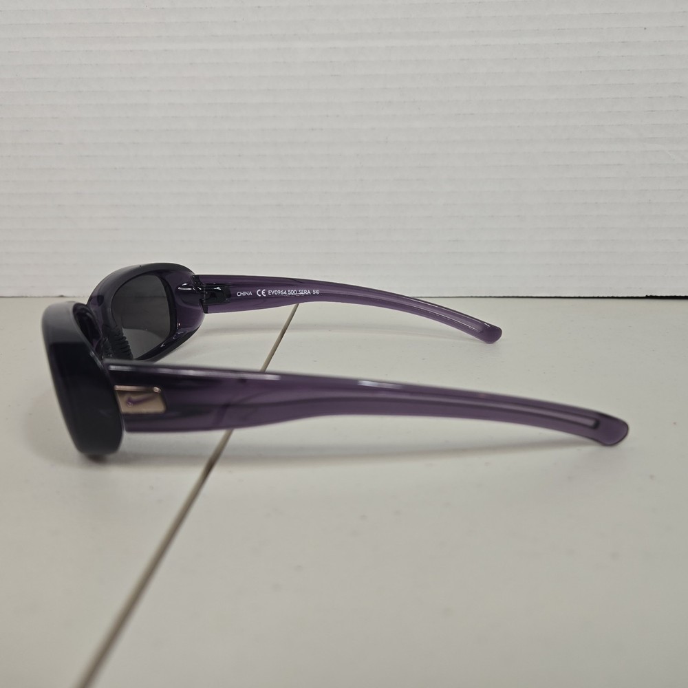 The Nike EVO964 500 Sera 510 sunglasses are a stylish and functional accessory for both men and women. Featuring a clear wrap frame and polarized black lenses, these sunglasses offer a modern and sleek look. Made in China, these Nike sunglasses combine fashion and practicality, making them suitable for everyday wear. The purple transparent accents on the frame add a touch of uniqueness to the design, making these sunglasses a versatile choice for any outdoor activity. *Please inspect all photos of item(s) before purchasing. If you have any questions, please feel free to ask.