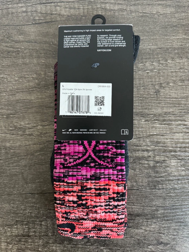Size: L Size Type: Regular Sock Length: Crew Color: Pink Material: Polyester Occasion: Basketball Personalize: No Country/Region of Manufacture: China Theme: Kay Yow Edition Toe Style: Full Toe Type: Socks Garment Care: Machine Washable Style: Crew Socks Handmade: No Pattern: Kay Yow Edition Department: Unisex Adults Season: Fall, Spring, Summer, Winter Performance/Activity: Basketball, Bodybuilding, CrossFit, Cross Training, Cycling, Dance, Football, Golf, Gym & Training, Hiking, Hunting, Lacrosse, Pilates, Racing, Riding, Rugby, Running & Jogging, Skateboarding, Squash, Tennis, Track & Field, Volleyball, Walking, Weightlifting, Wrestling, Yoga UPC: 196147076784 Brand: Nike gtin13: 196147076784 Number in Pack: 1 Pair Character: None Features: Arch Support