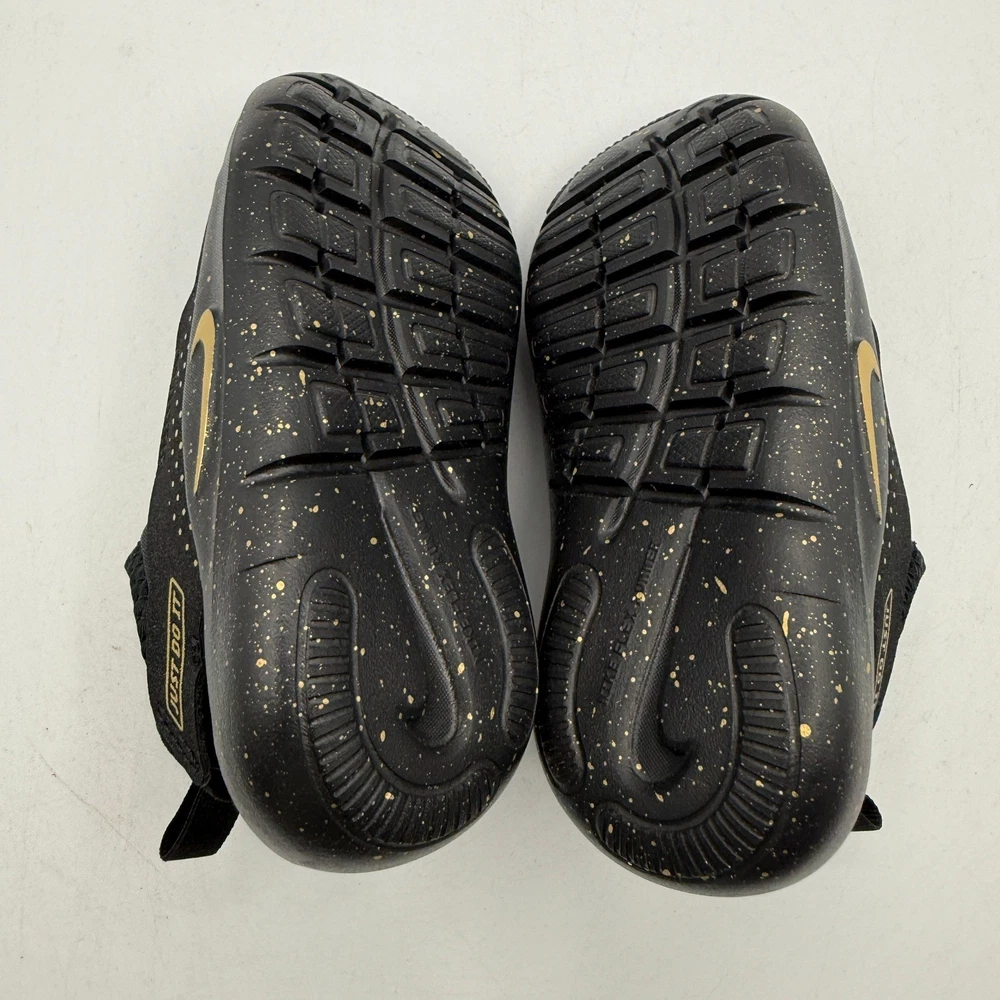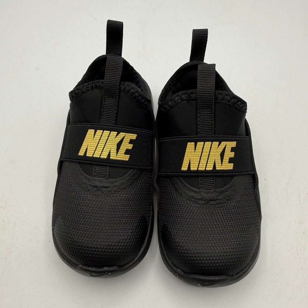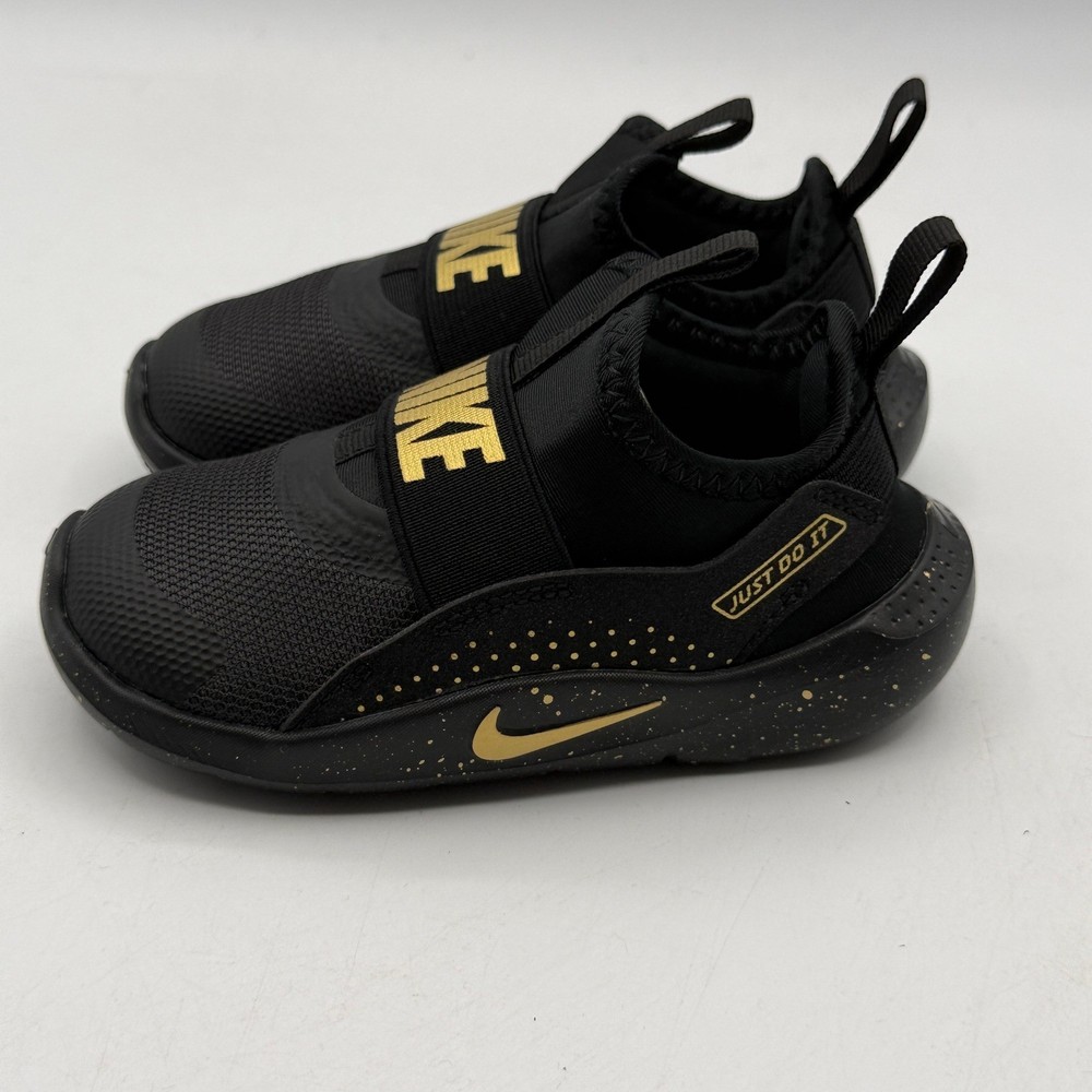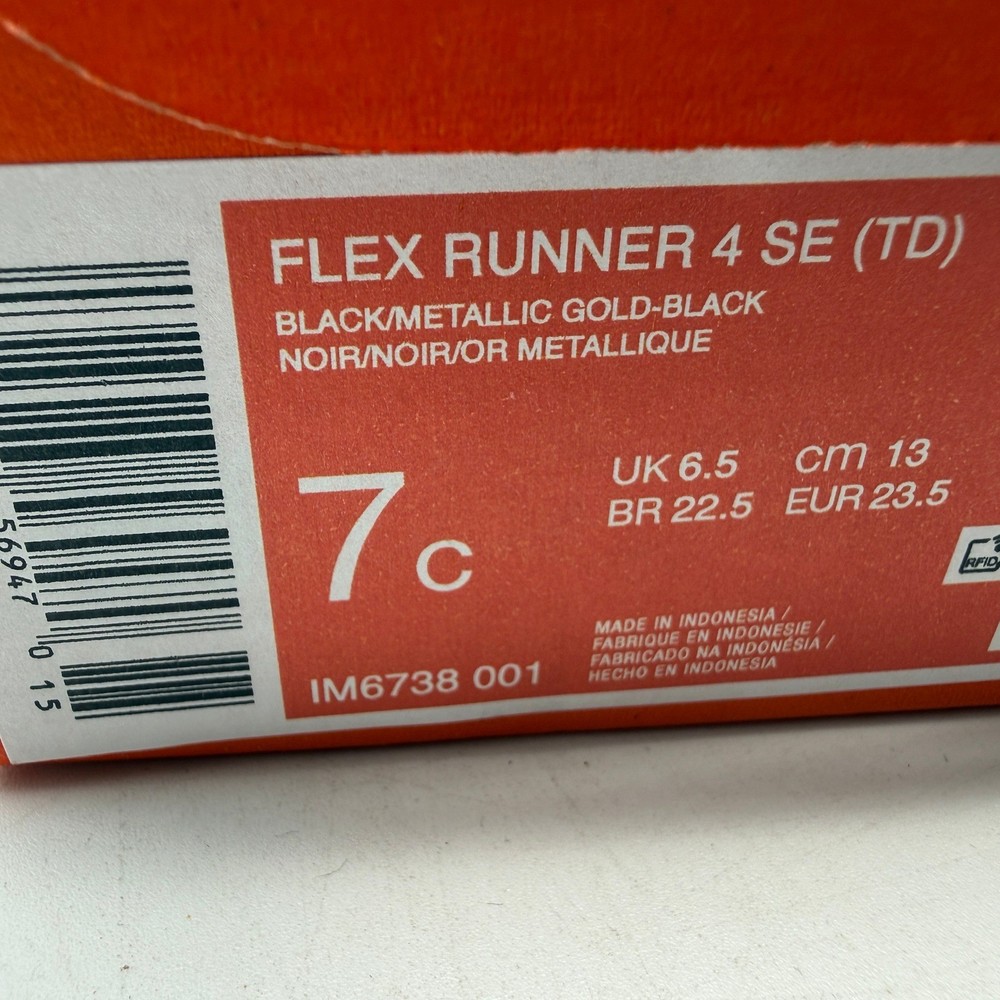 Flex Runner 4 SE (TD) slip-on sneakers provide a lightweight and flexible fit perfect for active toddlers. These athletic shoes feature a breathable mesh upper with a supportive elastic strap for easy on-and-off access. The sleek black design is elevated by metallic gold accents, including a speckled midsole and the iconic "Just Do It" branding. Designed with a durable foam sole that doubles as an outsole, they offer natural movement and traction for all-day play. Brand: Nike Model: Flex Runner 4 SE (TD) Style Code: IM6738-001 Color: Black/Metallic Gold Size: 7C Closure: Slip-on with elastic strap Upper Material: Mesh and synthetic Outsole: Foam Feature: Speckled midsole Feature: Pull tabs for easy entry Gender: Toddler Boys/Girls (Unisex) Keywords: Toddler Sneakers, Athletic Shoes, Slip On, Metallic Gold, Speckled, Running, Gym, Casual, Lightweight, Flexible, Sporty, Activewear, Kids Fashion If you have any additional questions, please don't hesitate to contact me directly.