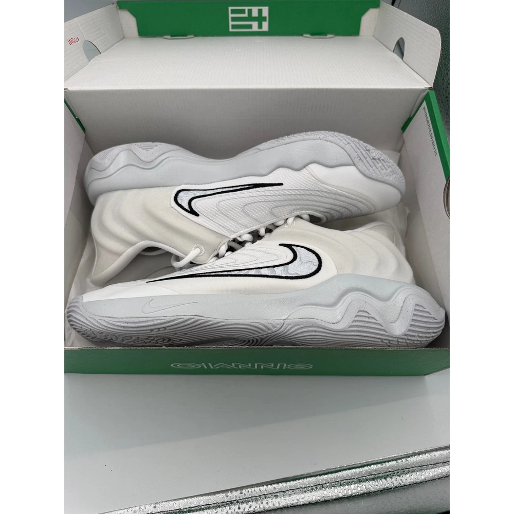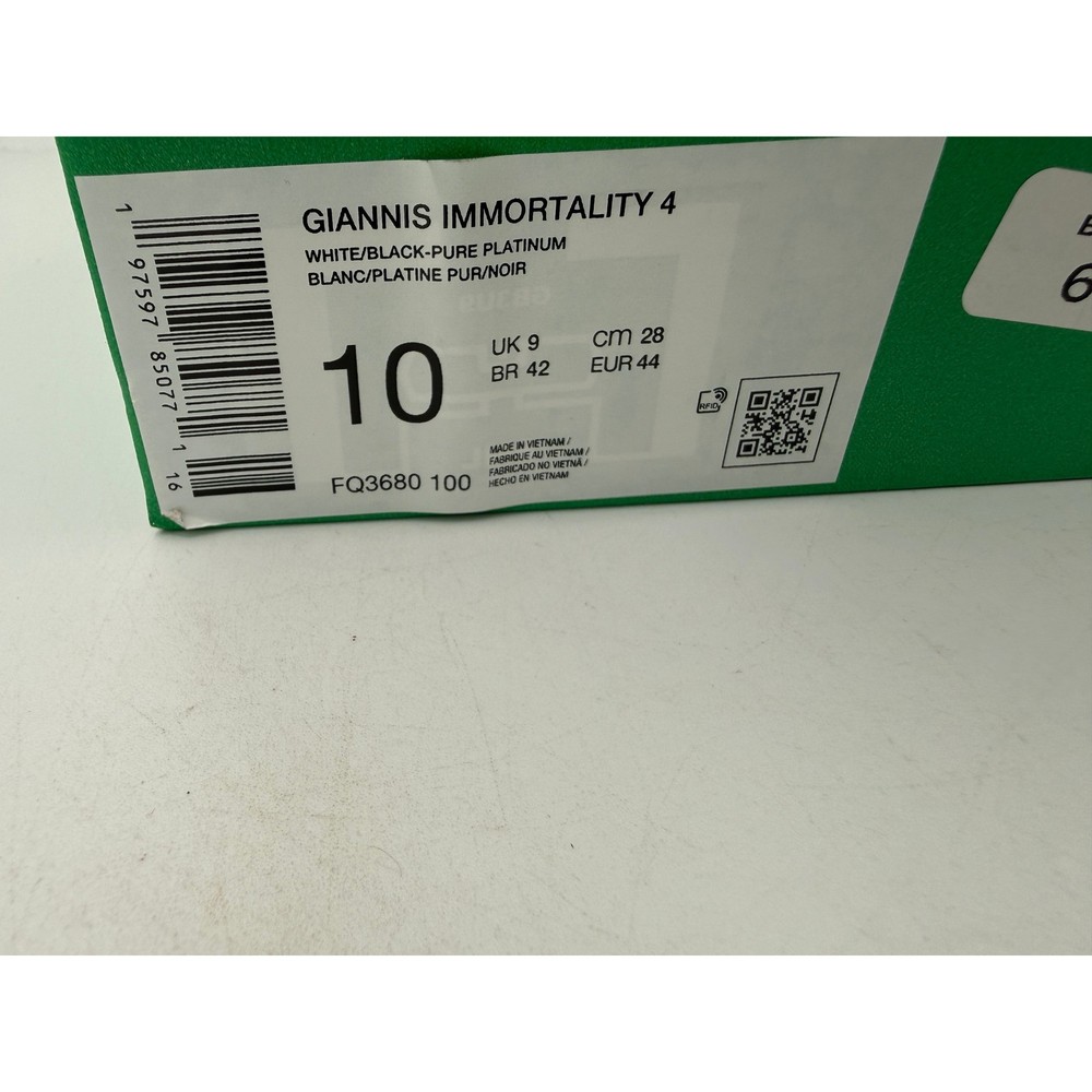 Giannis Antetokounmpo signature basketball shoes offer a sleek, low-profile design engineered for speed and agility on the court. The upper features a breathable mesh construction with wavy synthetic overlays and a padded collar for a secure fit. A large embroidered Swoosh adds a bold visual element, while the multidirectional traction pattern on the outsole provides exceptional grip for quick cuts and transitions. Brand: Nike Model: Giannis Immortality 4 Style Code: FQ3680-100 Colorway: White/Black-Pure Platinum Gender: Mens Size: 10 Closure: Lace Up Upper Material: Synthetic/Mesh Type: Athletic Performance: Basketball Arch Support: Standard Toe Shape: Round Toe Outsole: Rubber Keywords: Greek Freak, Hoops, Court, Sportswear, Active, Training, Gym, Low Top, Athleisure, Minimalist, Neutral, Performance Sneaker If you have any additional questions, please don't hesitate to contact me direclty.
