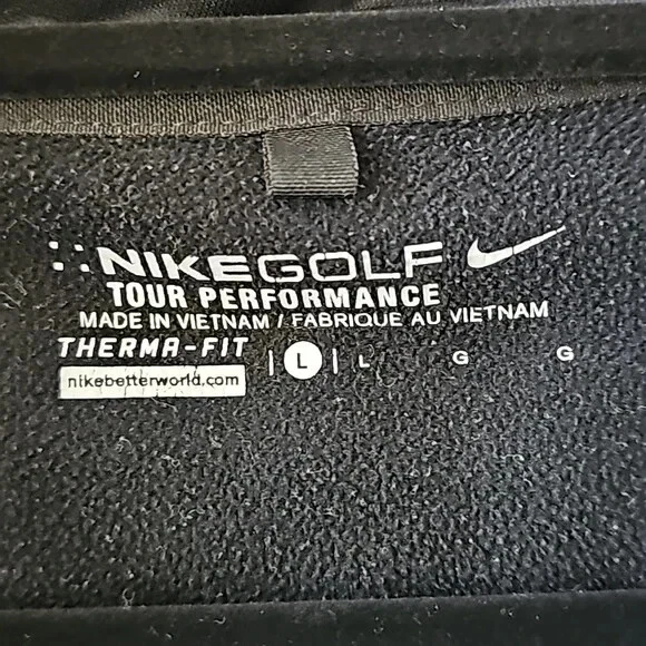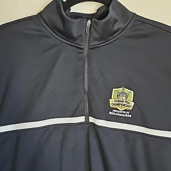 Nike Dri Fit Tour Performance Quarter-Zip Pullover Shirt Senior PGA Championship Presented by Kitchen Aid Black Size Large APPROXIMATE MEASUREMENTS Length: 27" Sleeves: 24" PTP: 22" Size Large No holes, tears, or stains. Overall great condition. Tags: Golf, outdoor, tennis, sports, sporty, jacket, top, shirt, sweatshirt, pullover