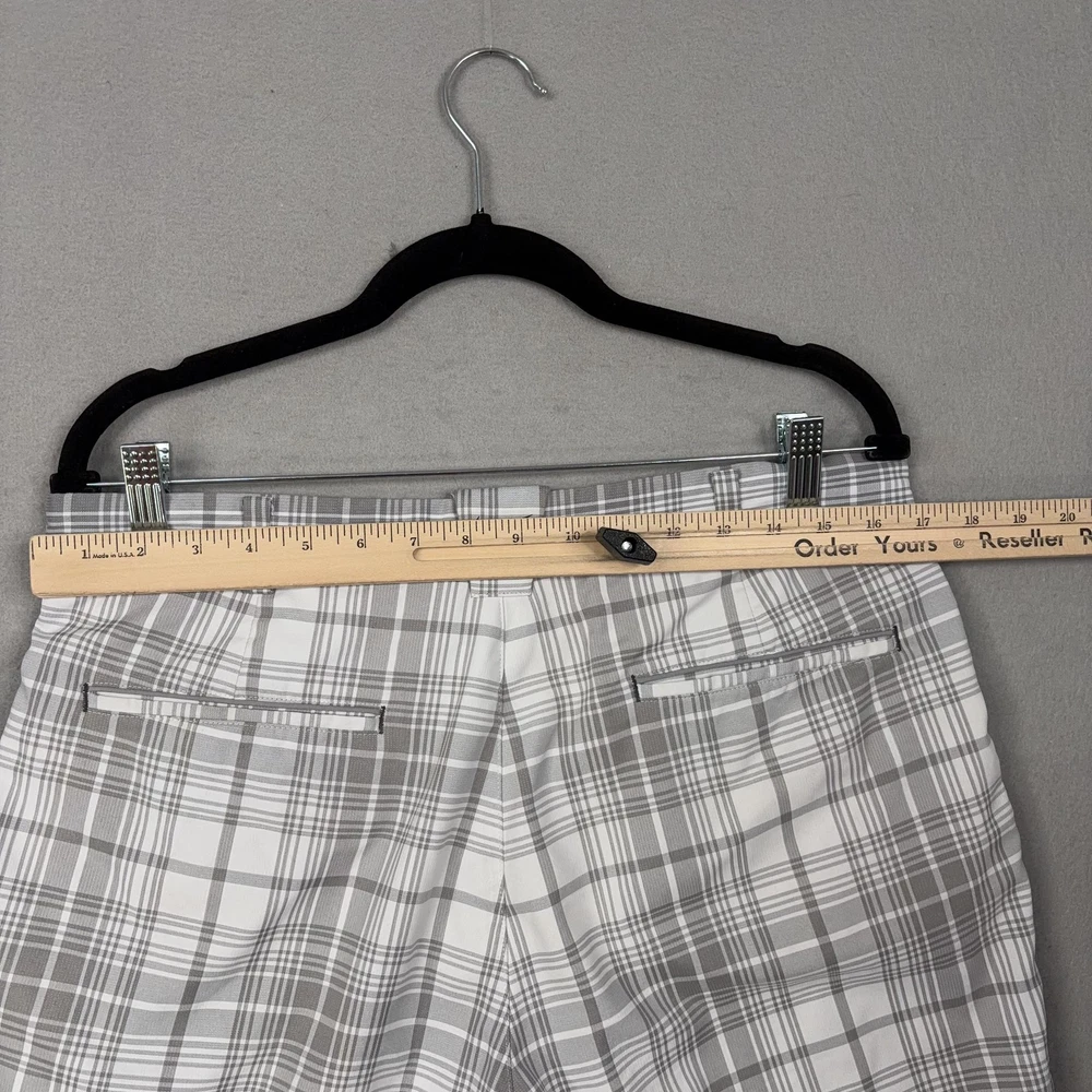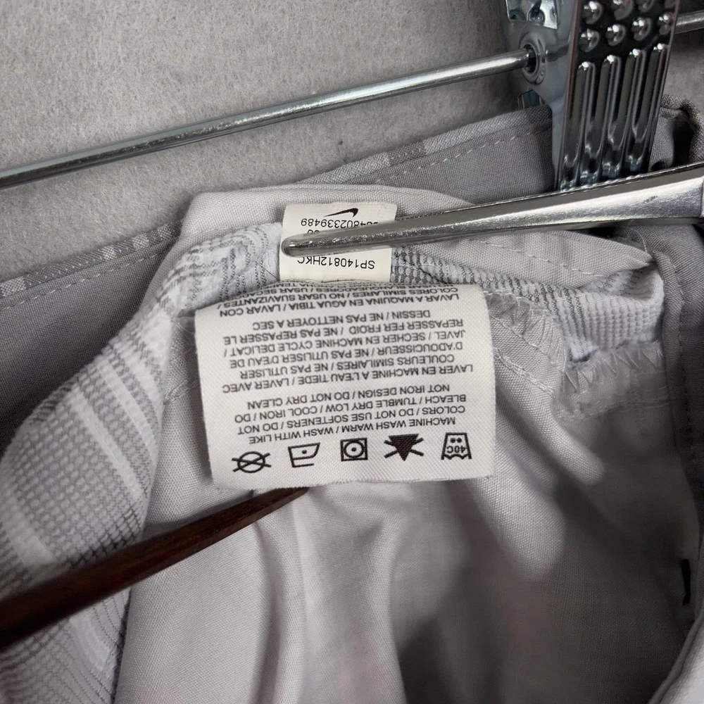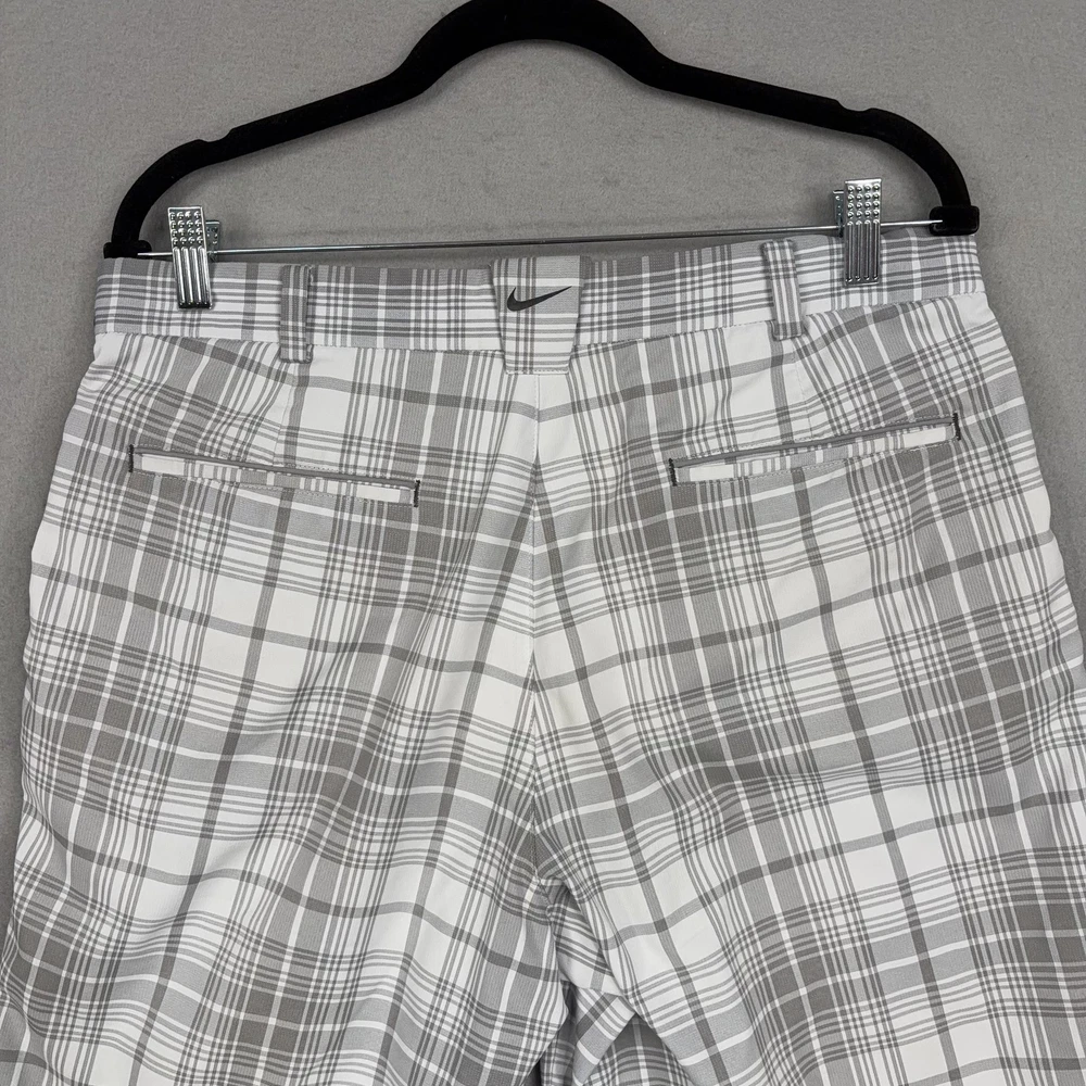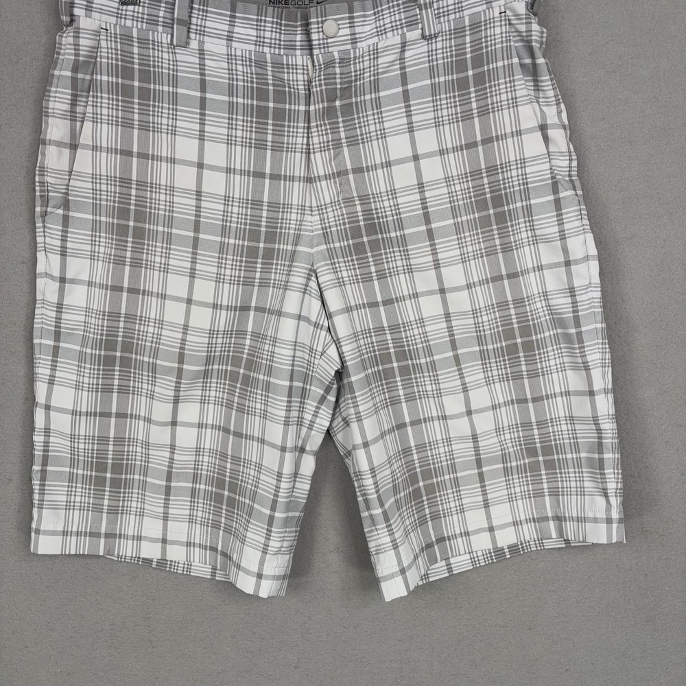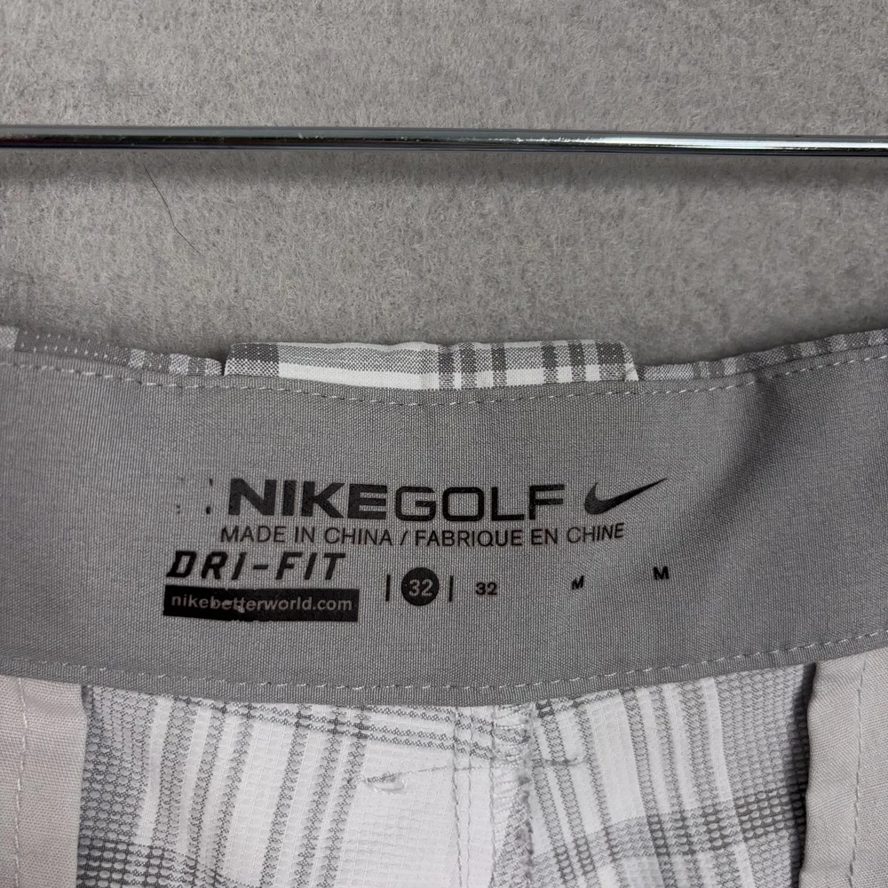 Nike Golf Shorts Mens 32 Gray Plaid Dri-FIT Performance Golf Stretch Chino Small spot on front. Lightly worn Nike Golf shorts with crisp plaid pattern. No holes, or snags; zipper, button, and pockets all functional. Inner care tags present; original retail tags not included. Brand: Nike Golf Style: Mens athletic golf shorts with gray and white plaid pattern and flat-front design. Color: Gray and white plaid; department: Men. Materials: 96% polyester, 4% spandex Dri-FIT moisture-wicking stretch fabric; made in China. Tag size: 32 (mens regular fit). Details: Belt loops, zip fly with button closure, front slant hand pockets, back welt pockets with trim, breathable quick-dry performance fabric suitable for golf or casual wear. Branding and codes: Nike Swoosh logo at back belt loop; inner waistband printed NIKEGOLF and DRI-FIT; inner tag codes SP14 0812HKC and 643379-100; RN 56323 | CA 05553. 24130 Measurements: Previous washings may change sizing on the tag. Refer to photos above for all measurements. Compare our measurements to one of your favorite garments. Measurements are approximate. All items are bagged and sealed after being photographed, then stored in a smoke free environment. Washed per eBay standards. I carefully package and ship daily. Contact me with any questions. Thanks
