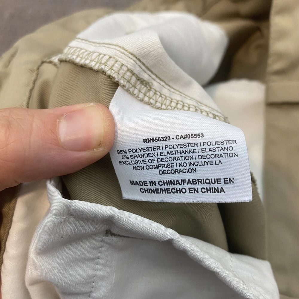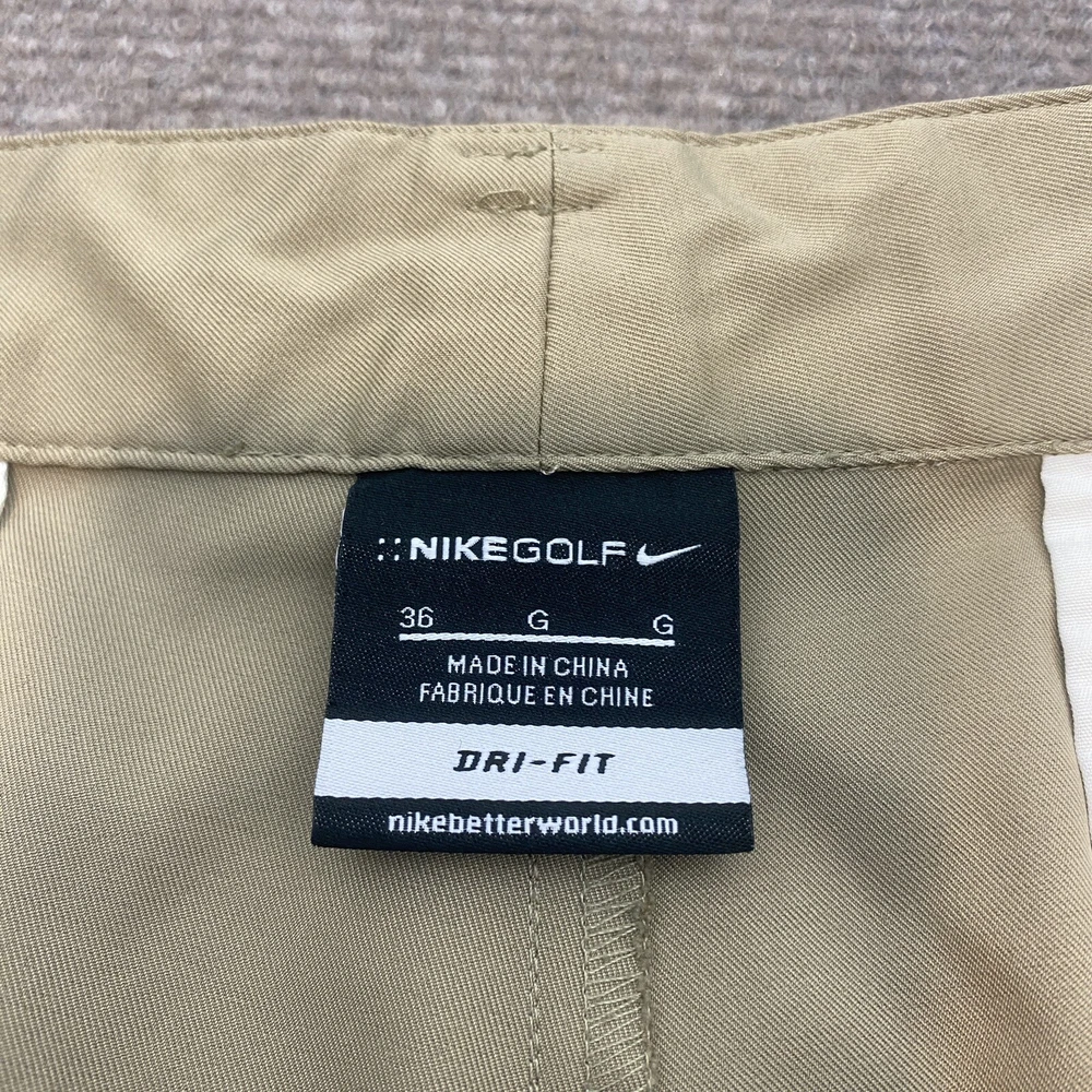 Accents: Logo Pattern: Solid Country/Region of Manufacture: China Closure: Zip Size: 36 Fit: Regular Waist Size: 36 in Fabric Wash: Dark Brand: Nike Character: Golfer Department: Men Fabric Type: Microfiber Occasion: Casual Theme: Outdoor Vintage: No Front Type: Flat Front Style: Chino Size Type: Regular Color: Beige Material: Polyester, Spandex Features: Easy Care, Lightweight, Moisture Wicking, Stretch