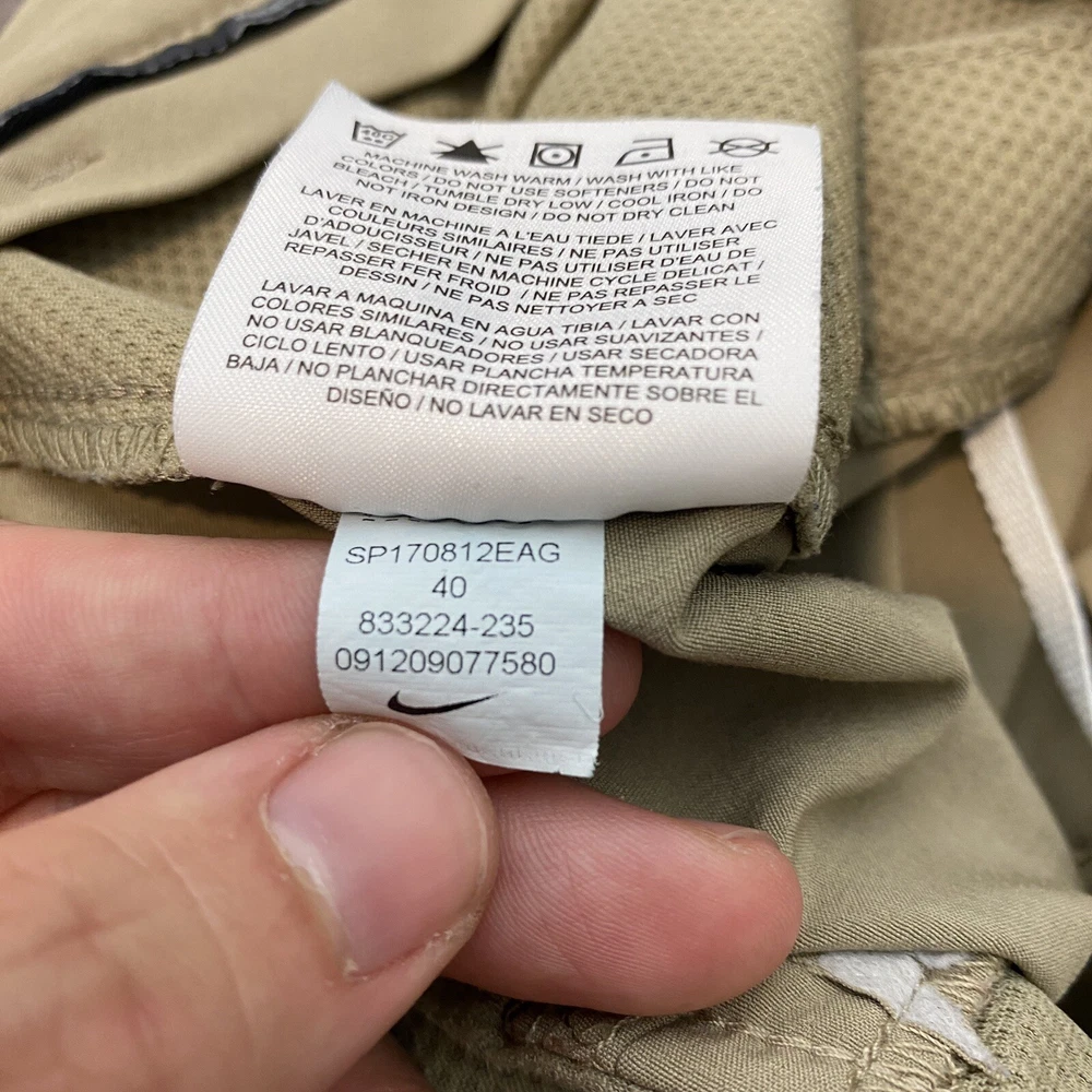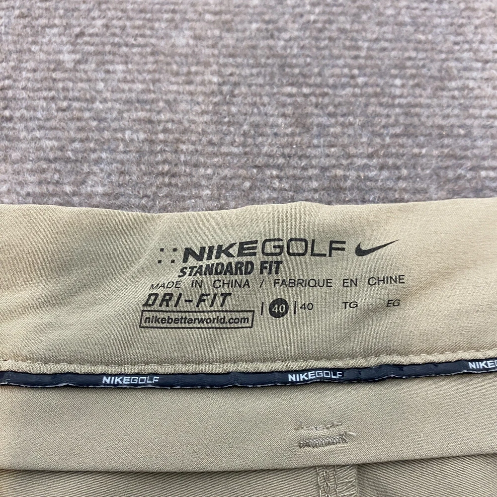 Department: Men Color: Beige Fabric Type: Microfiber Size: 40 Waist Size: 40 in Size Type: Regular Character: Golfer Front Type: Flat Front Fit: Regular Closure: Zip Style: Chino Features: Stretch Vintage: No Occasion: Casual Pattern: Solid Fabric Wash: Light Material: Polyester, Spandex Accents: Logo Theme: Outdoor Brand: Nike