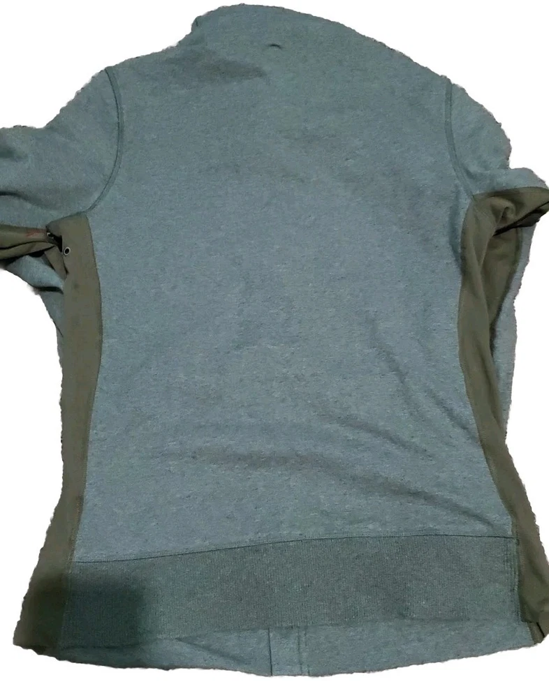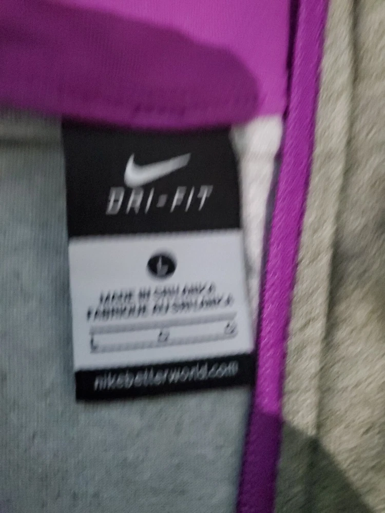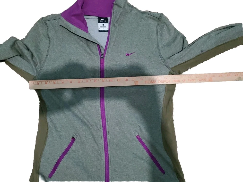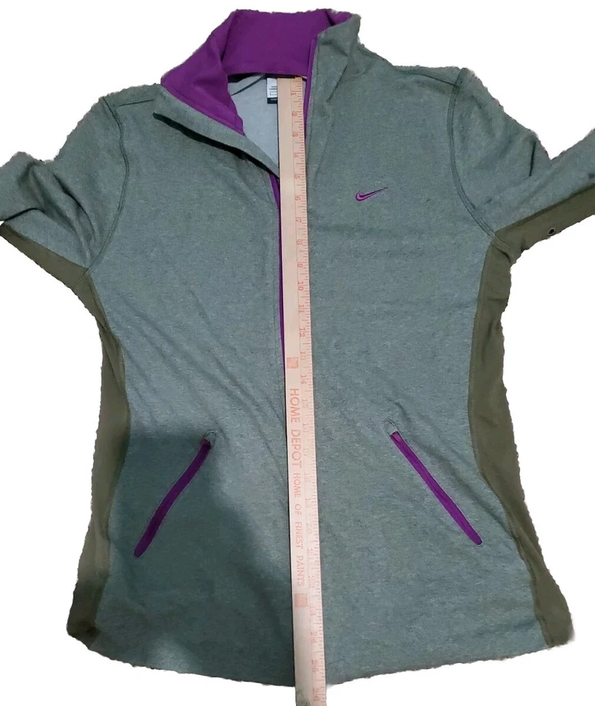 Elevate your sportswear with this Nike Golf Sport Jacket in size large. The jacket, made of a durable polyester/cotton blend, features a full zip closure and long sleeves for added warmth. The green jacket with purple stripe detailing is perfect for active occasions, such as golfing and other outdoor sports. Not only is it stylish, but this Nike Dri-Fit jacket is also highly functional. The blended fabric is machine washable for easy care and the mid-length coat provides ample coverage. Whether you're hitting the links or going for a jog, this athletic fit jacket is ideal.