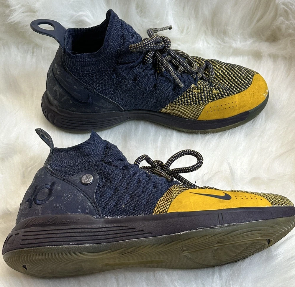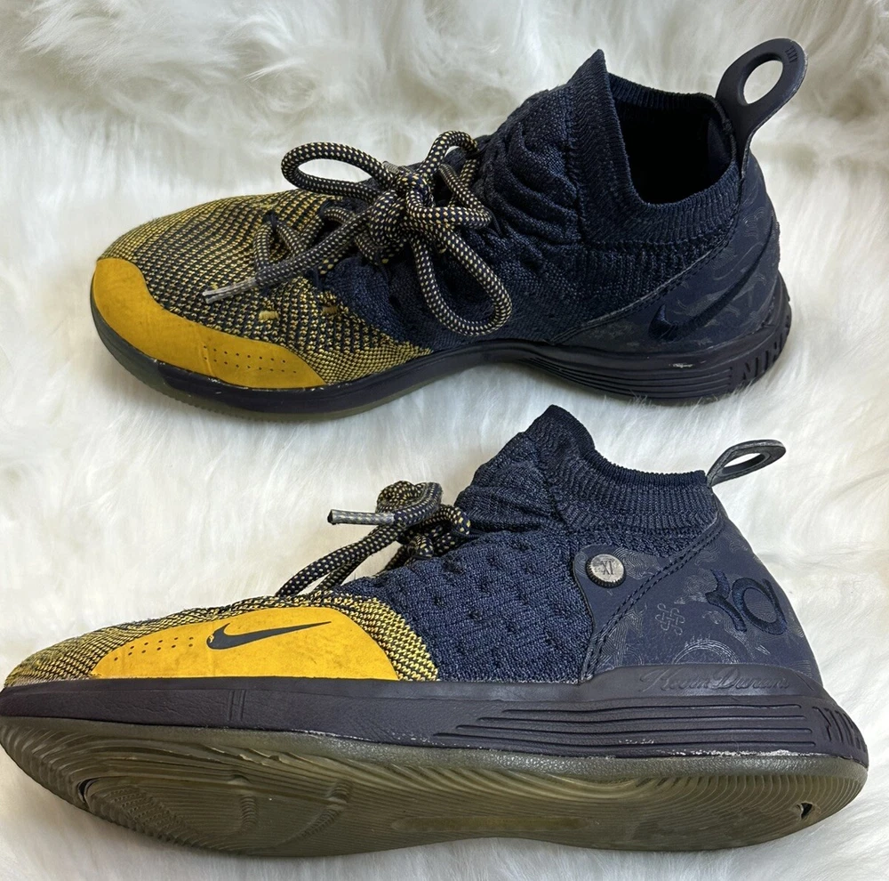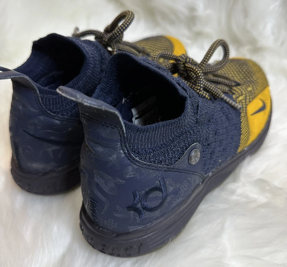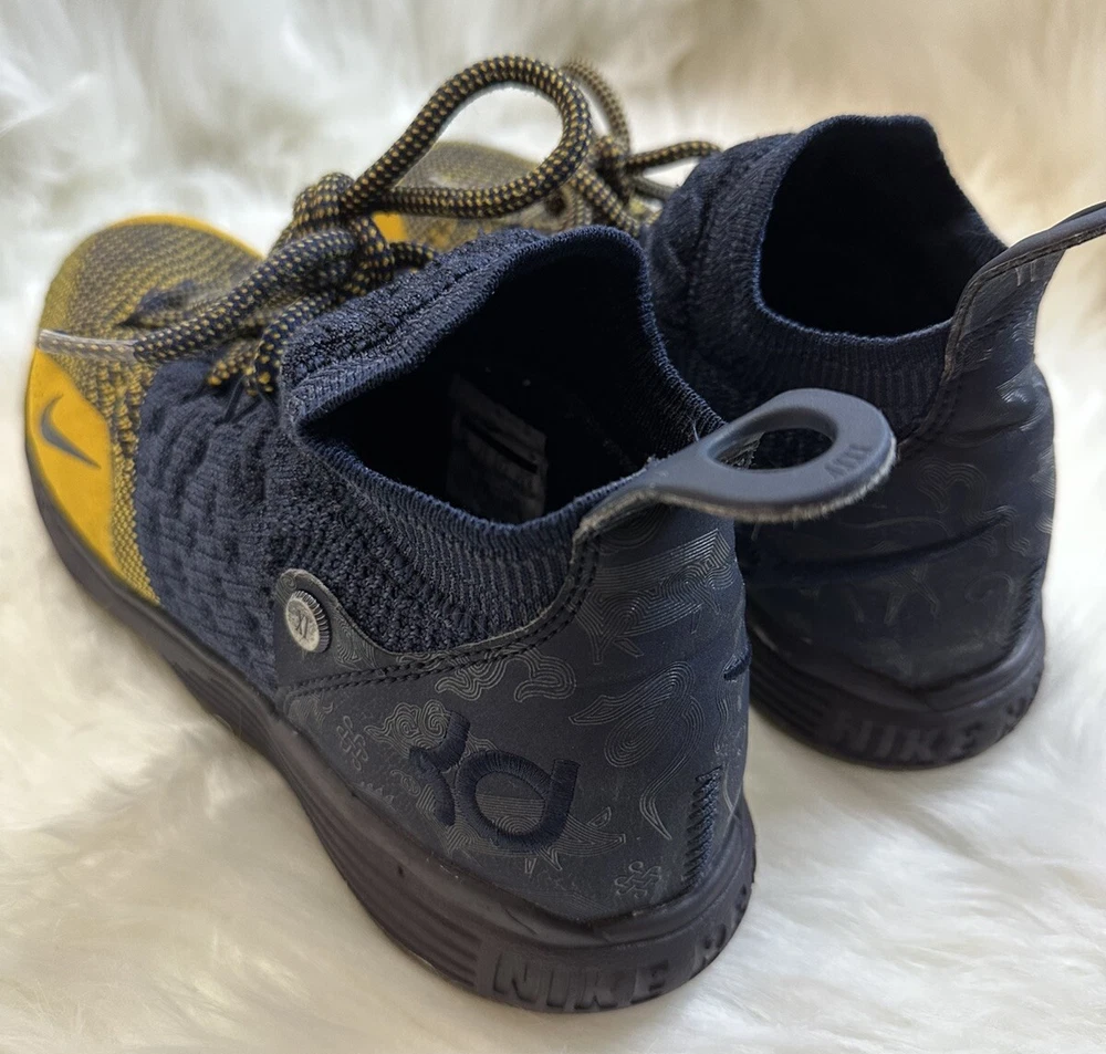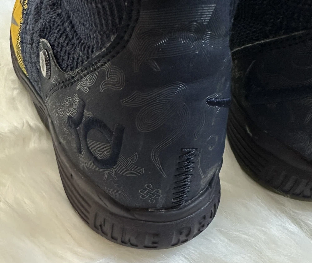 The Nike KD Kevin Durant 11 in size 5Y features a multicolor design inspired by the Chinese Zodiac, with blue and yellow hues creating a vibrant and eye-catching look. These athletic shoes are designed for boys and have a round toe shape with a lace-up closure for a secure fit. Crafted with a synthetic upper material, they offer a comfortable and durable wear for various activities, specifically suited for baseball. The Nike brand guarantees quality and performance, making these shoes a stylish and functional choice for young athletes. Pre-owned, please view photos for exact item condition Cleaned and Laundered Does not come with original box