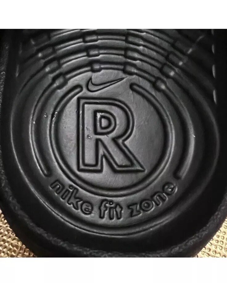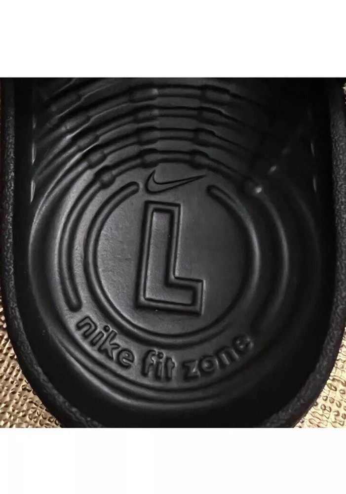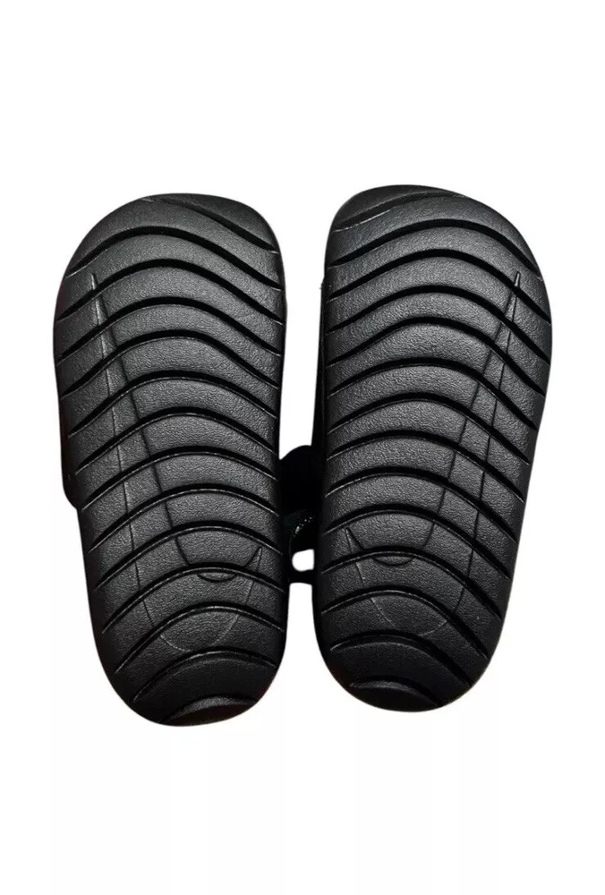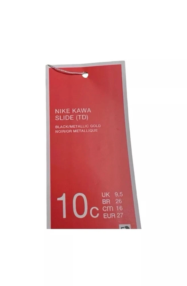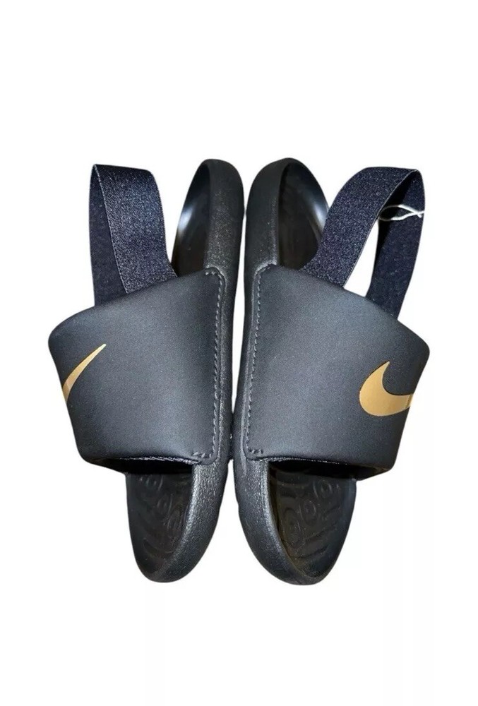 NIKE Kawa slides. Colors are black with gold swoosh/ check and gold NIKE logo on heel strap. Stretchy elastic heel strap holds shoes on securely. New with tags. Toddler size 10C. Please see pictures for details.