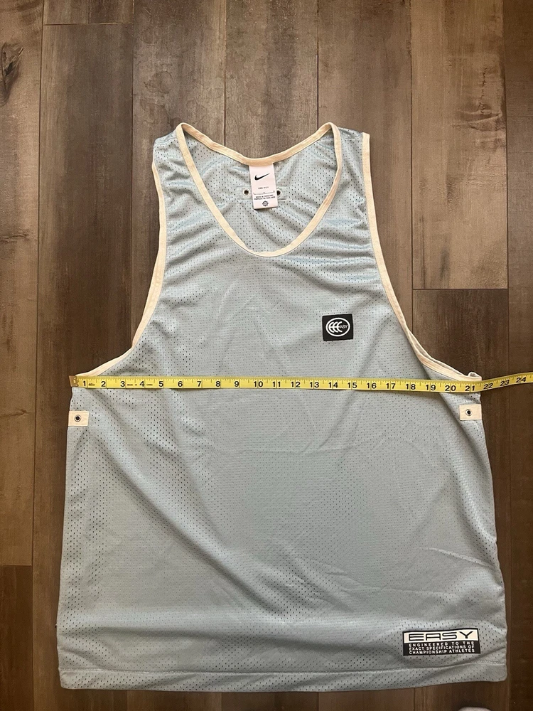 Elevate your game with the Nike Kevin Durant Dri-Fit Mesh Easy KD Basketball Tank in a striking blue hue. Designed for the basketball enthusiast, this men's size large singlet is crafted from 100% polyester mesh fabric, ensuring breathability and moisture-wicking capabilities to keep you cool on the court. The sleeveless design promotes freedom of movement, while the solid color and sleek Nike branding offer a stylish edge. Whether you're practicing your shots or competing in a match, this activewear top is tailored for both performance and comfort, making it a versatile addition to your athletic wardrobe.