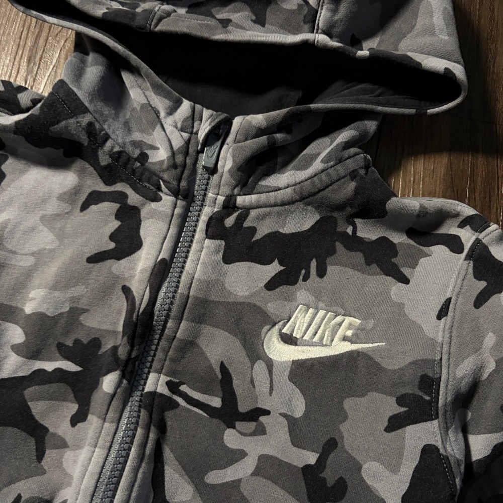 Measurements: • Chest (pit to pit): 17 in • Length (shoulder to hem): 21 in Nike Kids, Camo Hoodie, Full Zip, Gray Black, Youth, Activewear, Athletic, Casual, Comfortable, Sportswear, Streetwear, Outdoor