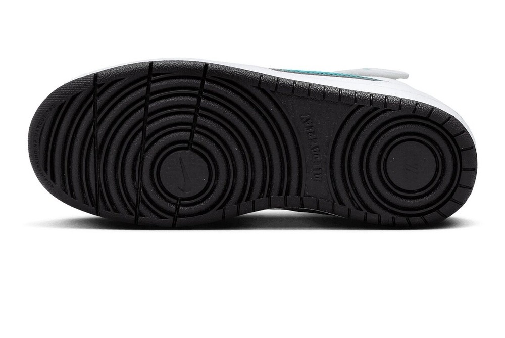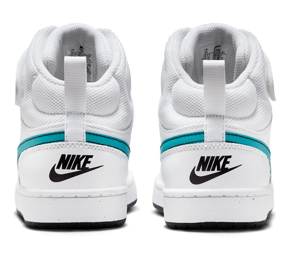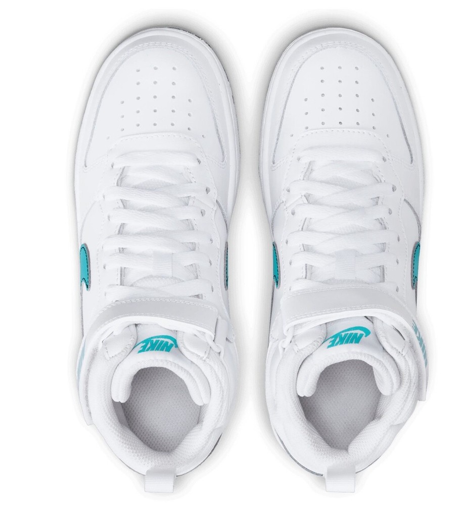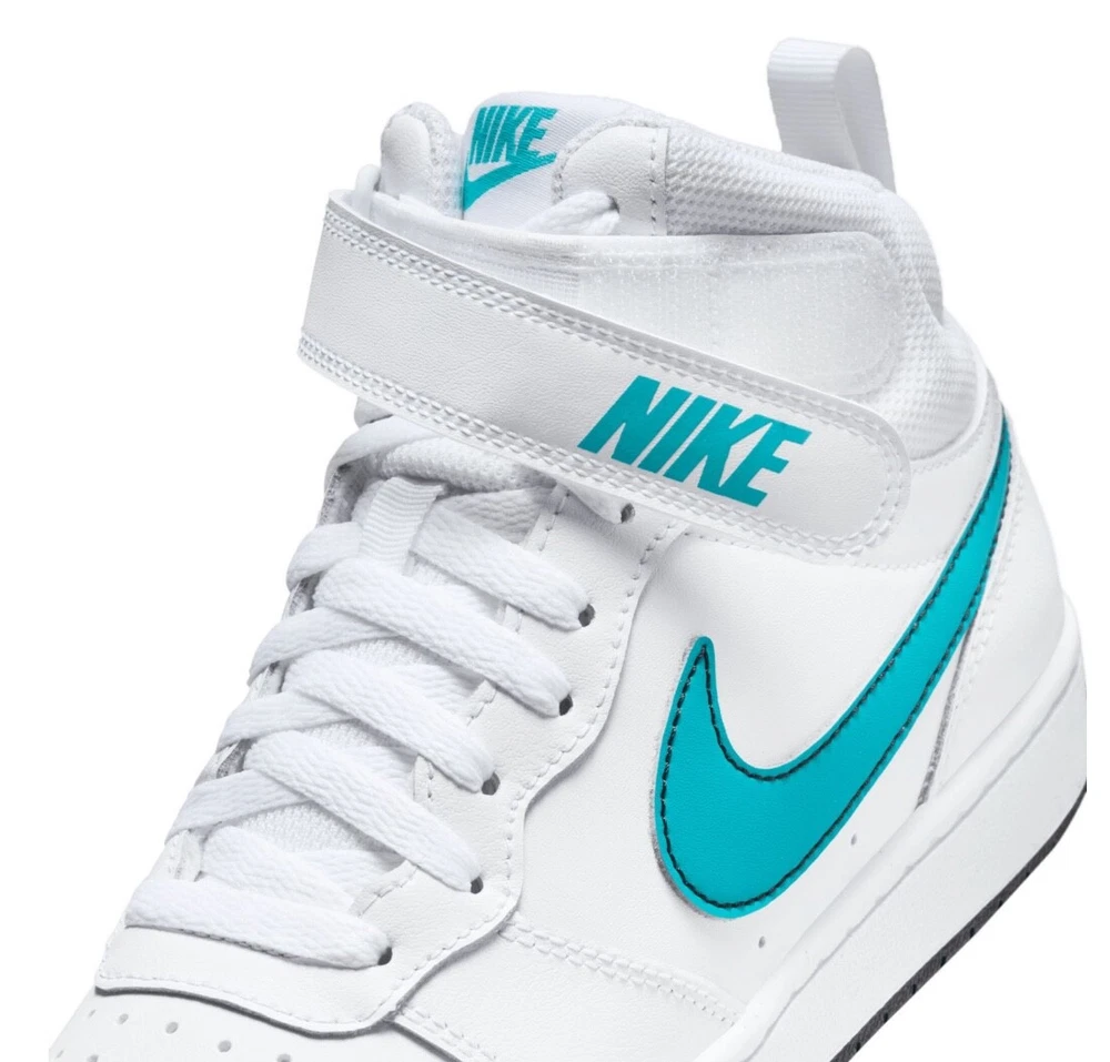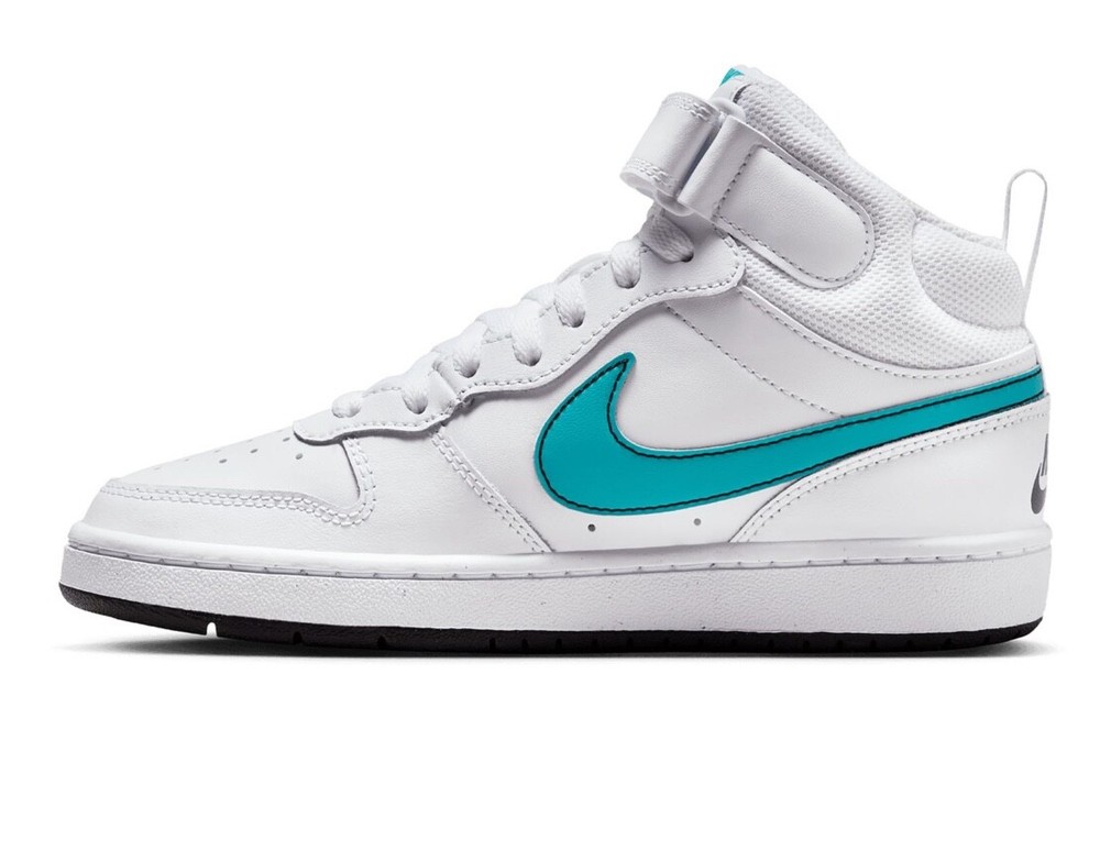 The Nike Kids Court Borough Mid 2 GS Shoes are stylish sneakers designed for unisex kids. They feature a white color with aquamarine and black accents, a lace-up closure, and a standard shoe width. These athletic shoes have a synthetic upper material and a Nike Court product line, providing both comfort and durability. With a US shoe size of 7y/4.5y/3.5y/5.5y, an EU shoe size of 38, and a sleek Nike design, these sneakers are perfect for active kids looking for a trendy and versatile footwear option.