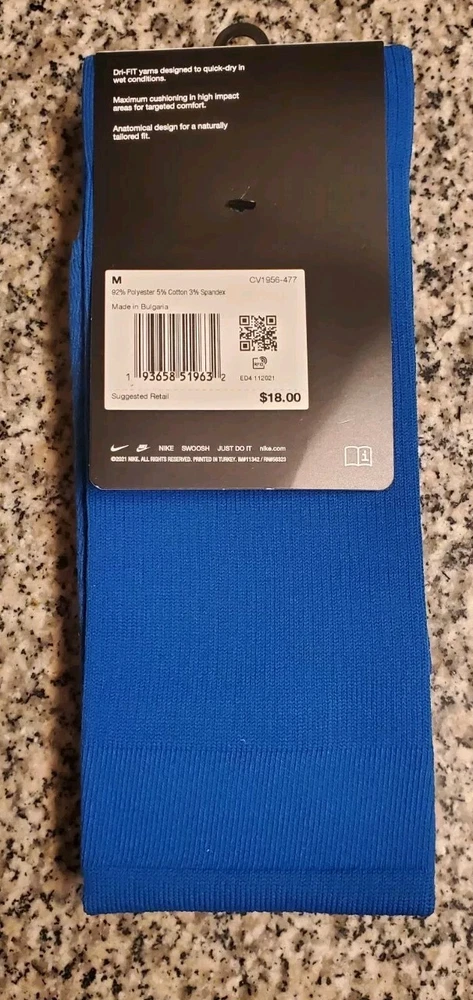 The Nike Matchfit Adult Blue Knee High Polyester Cushion Logo Soccer Socks are designed for men and feature Dri-Fit technology, arch support, cushioning, moisture-wicking, and breathability, making them ideal for soccer, running, and gym training. This pair of royal blue socks in size medium (6-8) is machine washable and made of a polyester blend material for comfort and durability. With the Nike logo on the socks, they offer performance and style for various seasons throughout the year. Pictures are of actual socks. Brand new never worn and no defects. Feel free to contact me with any questions .