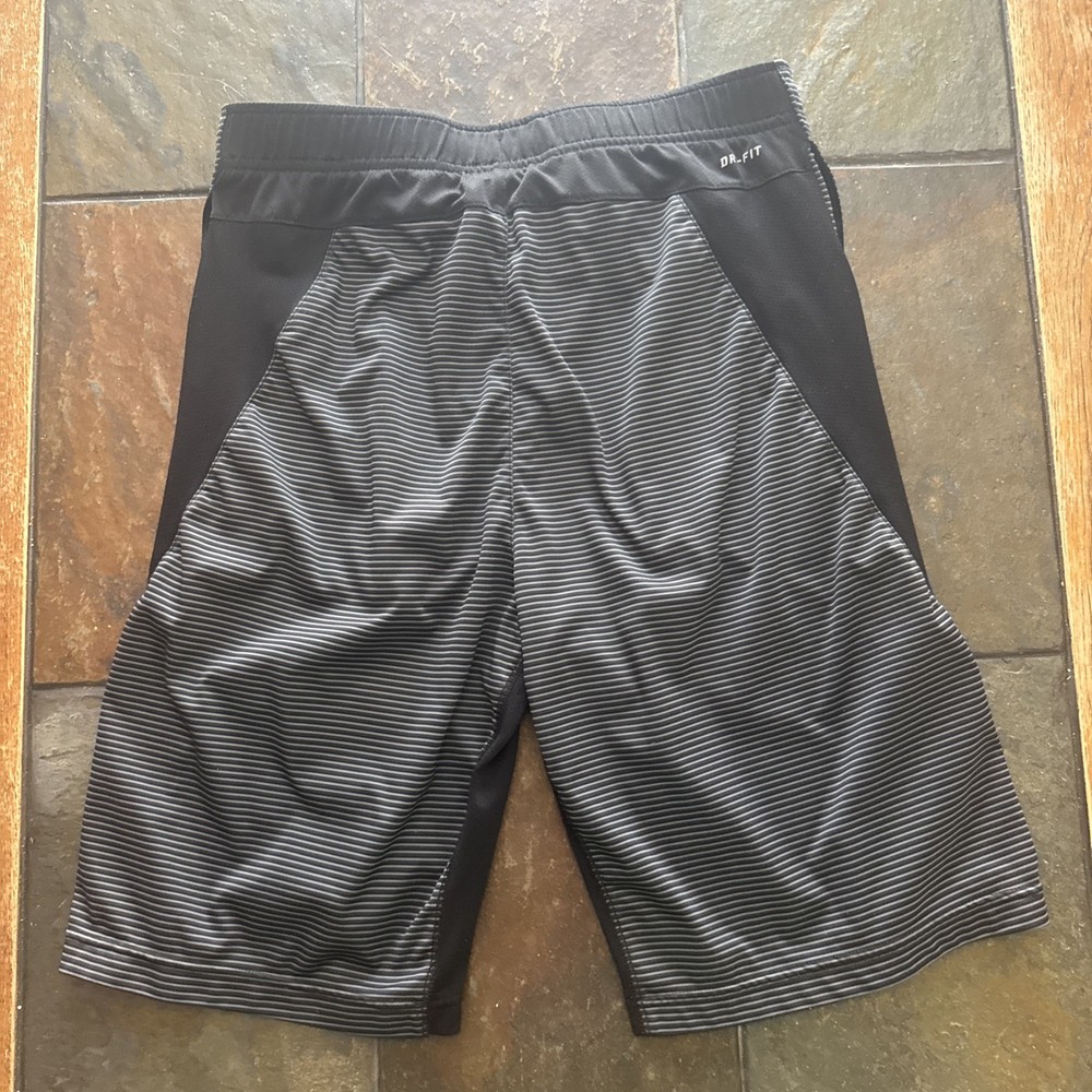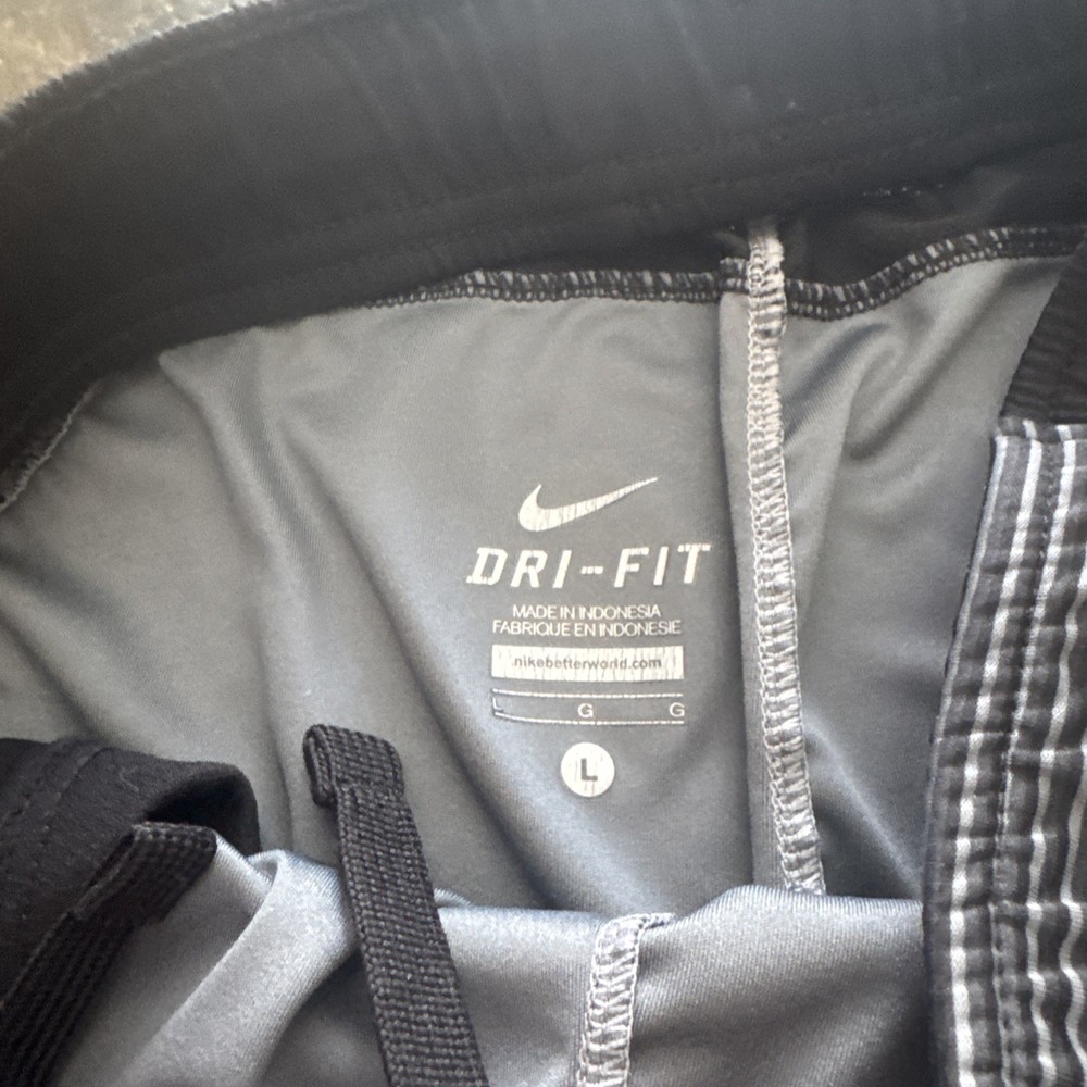 The Nike Men's Gray & Black Striped Dri-FIT Athletic Shorts in size Large feature a classic drawstring closure and a 9" inseam, making them perfect for activewear or casual occasions. Made of 100% polyester mesh fabric, these athletic shorts are not only breathable but also moisture-wicking, making them ideal for gym, basketball, and running activities. With an elastic waist, pockets, and a drawstring closure, these athletic shorts by Nike offer comfort and functionality for the modern man in all seasons.