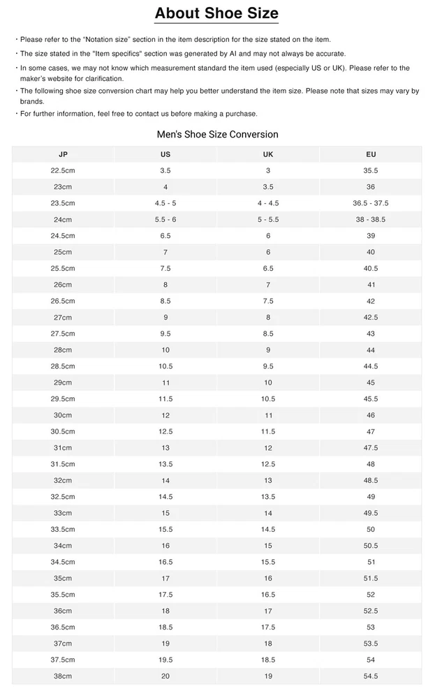 • Before purchasing, please read this page in conjunction with the notes at the bottom of the page, and by placing an order and making payment, you agree to be bound by the product conditions and notes. • International shipping will be facilitated through our central shipping center in Japan. Please allow approximately 10 business days for us to handle the item, from dispatching it from our local store to preparing it for international shipping in our central shipping center. • Tracking number will be provided only after the item reaches our central shipping center in Japan. • Item details and descriptions have been translated by AI, so occasional mistakes may occur. If you encounter any issues, please don't hesitate to reach out to us. PRODUCT INFORMATION Brand Nike Style Sneaker Department Men Type Athletic Color Orange Product Line Others Character Others Vintage No Customized No Theme Others Model Others Country/Region of Manufacture Unknown Shoe Shaft Style Mid Top Upper Material See images US Shoe Size 8 UK Shoe Size 7.5 EU Shoe Size 41.5 Others ■Damage Details ・Surface insole sole: dirt · Outsole: dirt and wear About Us BOOKOFF is one of Japan's leading second-hand chain, with more than 700 stores across the country. We offer a wide selection of premium branded items, including designer bags, wallets, jewelry, watches, fashion clothing, and more. All items will be thoroughly inspected, carefully packed, and shipped directly from Japan. BOOKOFF is also a member of the AACD (Association Against Counterfeit Product Distribution), an organization which aims to prevent the distribution of counterfeit and fraudulent products, hence buyers can purchase genuine brand items with confidence at our store. All of our items are selected and authenticated by professional authenticators to ensure their authenticity. About Payment • Only eBay managed payments are accepted. • We do not do transactions outside of eBay. Shipping & Taxes • Free Shipping Worldwide. • All items will be shipped via Japan Post with tracking service (EMS or ePacket). • All orders will be shipped from Japan to the registered address on the buyer's eBay account. • Shipments may be delayed due to bad weather, public holidays, customs office delays, and other conditions beyond our control. • All customs duties, import taxes or related fees occurred during shipping are the responsibilities of the buyer. If you have any concerns, please inquire directly with your local customs office before making a purchase. Return & Cancellation Policy • All listed items are also available at our retail store and multiple online platforms in Japan. In the event that an item is out of stock or sold, we will issue a cancellation along with a full refund. • If you wish to return an item for a refund, please contact us directly before initiating a return or opening a case. • For damaged items or discrepancies with the item description, please reach out to us directly within 10 days of receiving the item, providing pictures of the damaged area or issues. • Unless the item is damaged or does not match its description, buyers will be responsible for the return shipping fee. > All returns must be shipped to our address in Japan with a tracking number. > Refunds will be processed once the returned item has arrived safely. • Buyers who violate eBay policies or misuse eBay's Money Back Guarantee will be reported and blocked from future purchases. click here to see our store