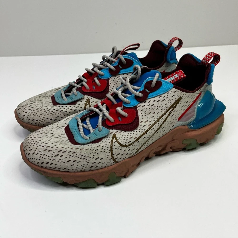 Nike Men's React Vision Desert Oasis sneakers multicolor - 11 Brand: Nike Size: 11 Type: Sneakers Color: Light Bone/Terra Blush/Photo Blue Closure: Lace Up Condition: Pre-owned. In Good Condition. The React Vision 'Desert Oasis' released as part of Nike's concept-drive D/MS/X line. Built with seamless mesh, the shoe's neutral base is highlighted by leather eyelets. Tongue and heel pull-loops provide easy on and off, while an external heel counter is included for stability. Underfoot, the React midsole provides cushioning, giving way to rubber pods on the outsole for traction. Comfortable, Walking, Outdoor, Workout, Athletic, Sporty, NIKE, Comfy, Everyday