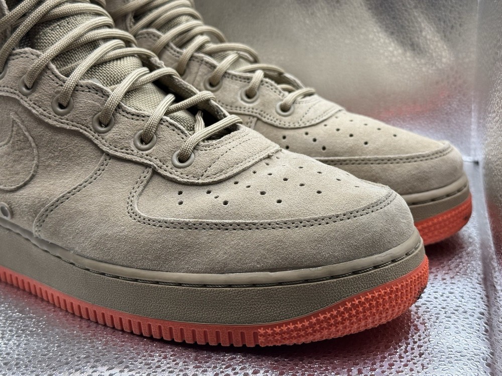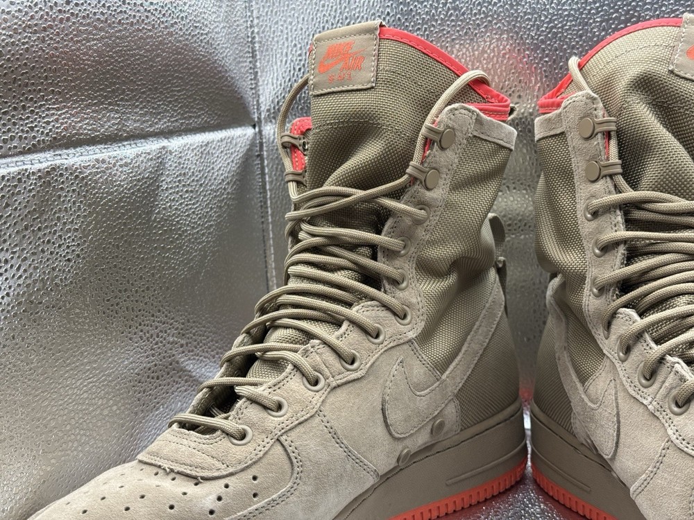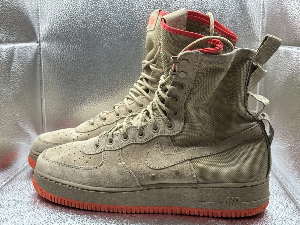 The product is a rare pair of size 11.5 Nike Men's Special Force AF1 sneaker boots in khaki color. These high-top lace-up boots are designed for activewear, casual wear, and workwear, featuring a rubber outsole for durability and comfort. The sneakers also include straps for added style and support, and are part of the Nike Air Force One product line. With a multicolor solid pattern and a standard shoe width, these boots are perfect for summer, fall, and spring seasons, making them a versatile addition to any wardrobe for those who enjoy walking, hiking, running, or jogging.