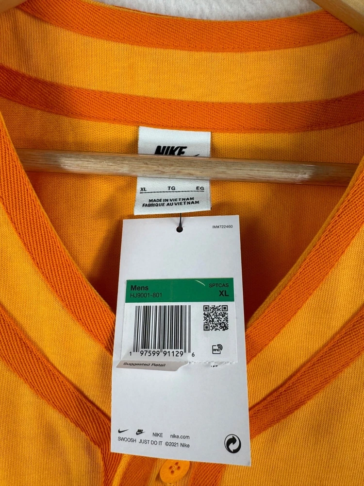New with Tag Nike Men's Sportswear Baseball Jersey - Orange This soft cotton Nike Men's Sportswear Baseball Jersey - Orange combines an athletic aesthetic with beach vibes for a look you can wear beyond game day. Featuring buttons, embroidered details and felt patches, it brings surf style to a classic baseball silhouette. 100% cotton Flat lay: pit to pit 23.5" Length 32' baseball, embroidered, 90s, classic, street wear, hipster, sports, vibrant, active, work out, hip hop, retro, colorful PLEASE check all flat lay measurements and listings carefully BEFORE PURCHASE!I put in a lot of work into hand measuring and researching each items as best as I can! Thank you so much for your consideration! Please note that: RETURN SHIP FEE IS PAID BY THE BUYER! If you are not too familiar with flat lay measurements, I recommend taking a measurement of your own clothes that you feel comfortable and compare with the measurement I provide. For returns: The items MUST BE IN SAME CONDITION AS SOLD for full refund! We all don't like returns and let's work together to minimize! Please note that RETURNS ARE NOT ACCEPTED FOR NEW WITH TAG OR NEW WITHOUT TAG ITEMS!