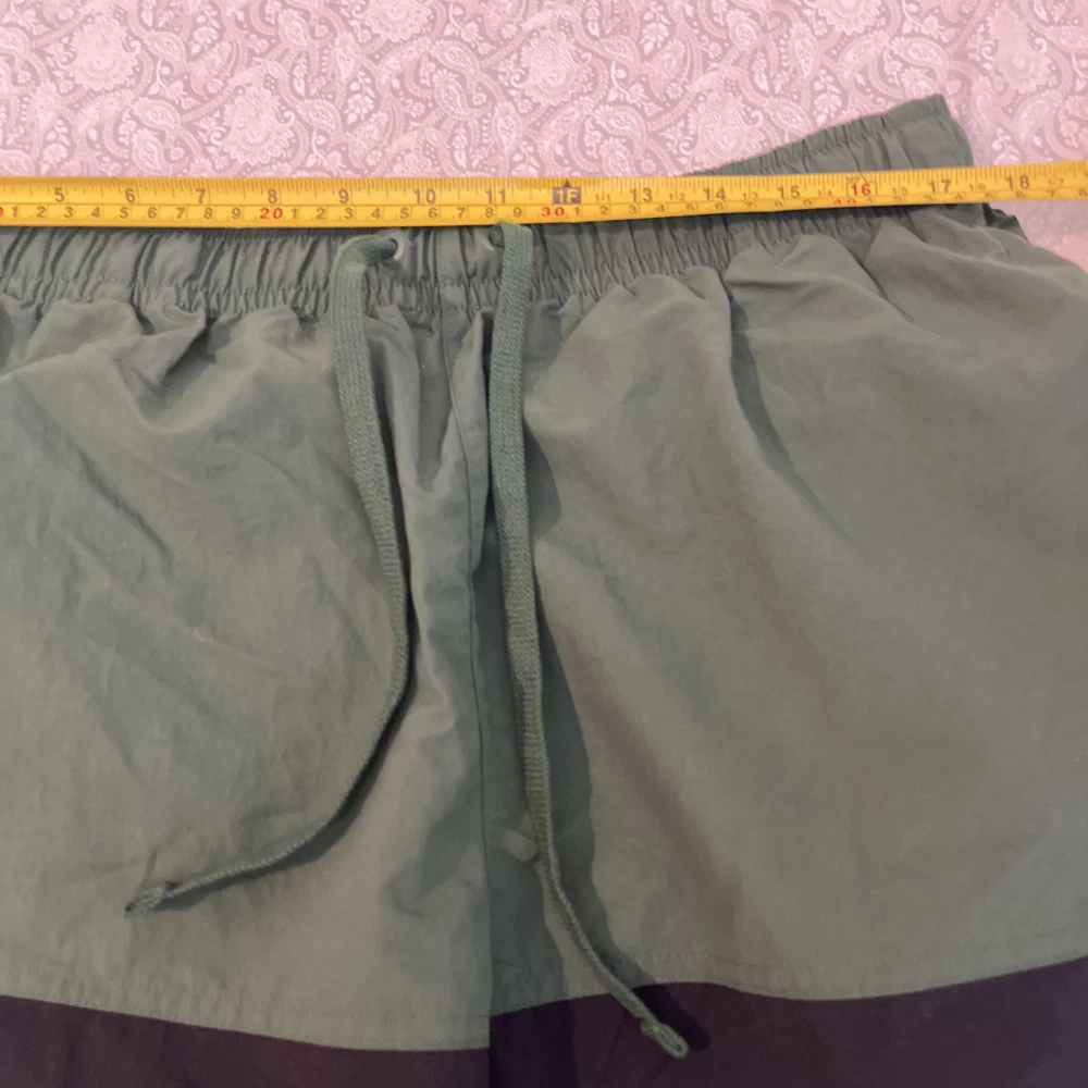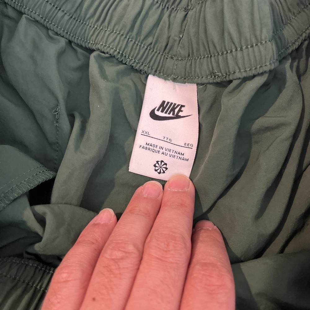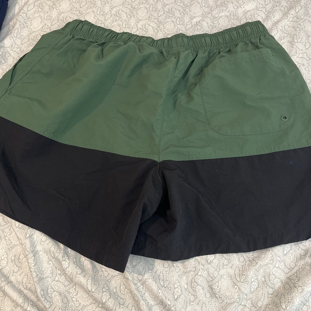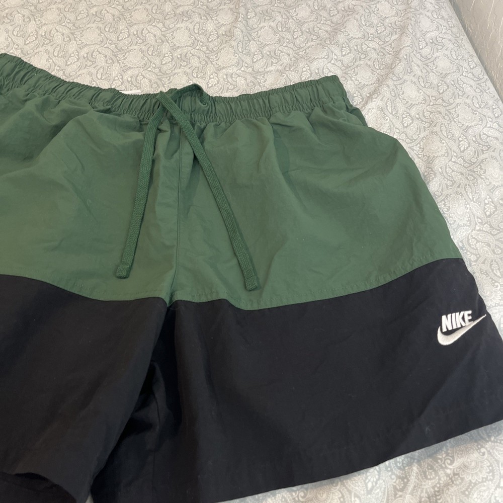 Nike men’s swim trunks featuring a green and black colorblock design with embroidered Nike swoosh. Lightweight and quick-dry with elastic waistband and adjustable drawstring for comfort. Includes side pockets and a back pocket with drainage grommet. Perfect for swimming, beach, pool, or casual summer wear. Details: • Brand: Nike • Size: XXL • Color: Green / Black • Style: Swim Trunks • Waist: Elastic w/ drawstring • Pockets: Side pockets + rear pocket • Made in Vietnam Please see photos for exact condition and measurements.