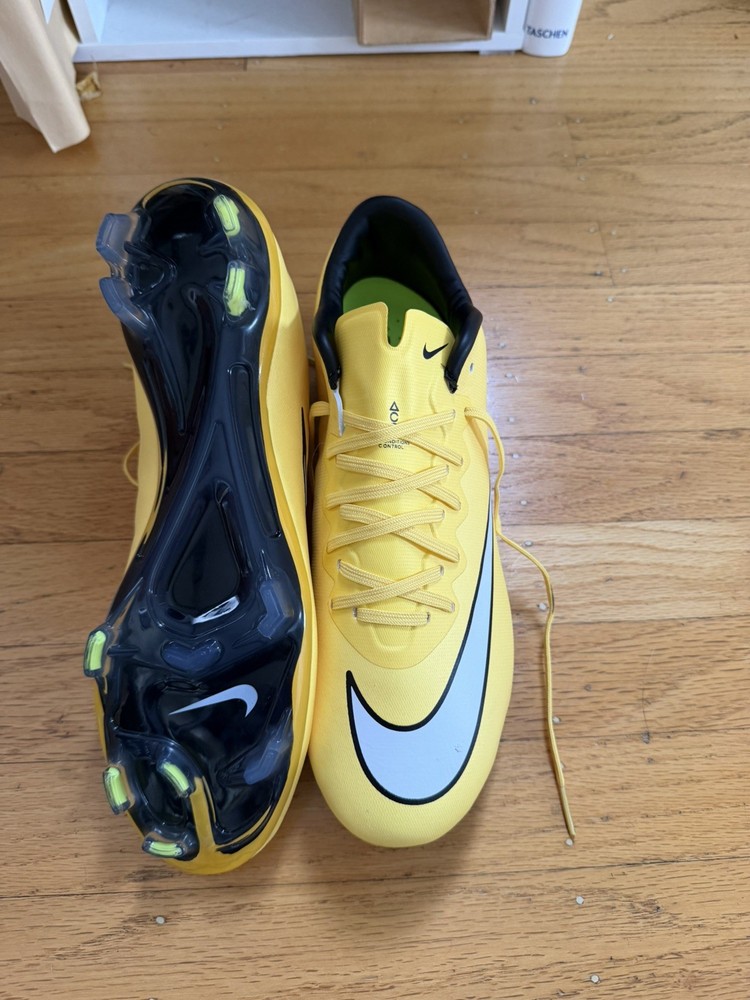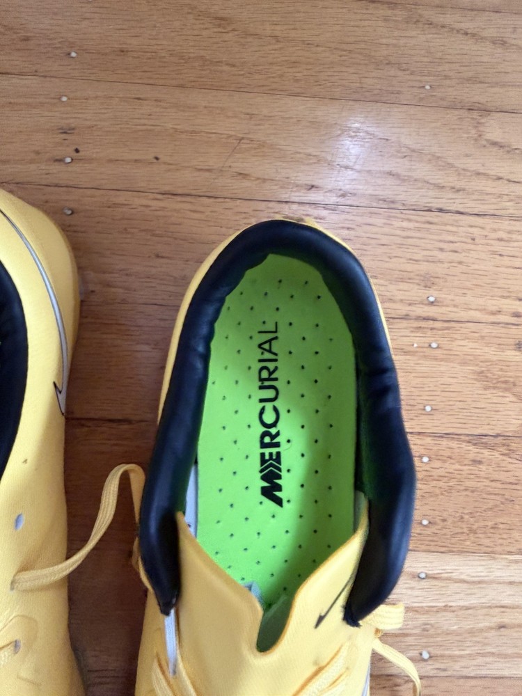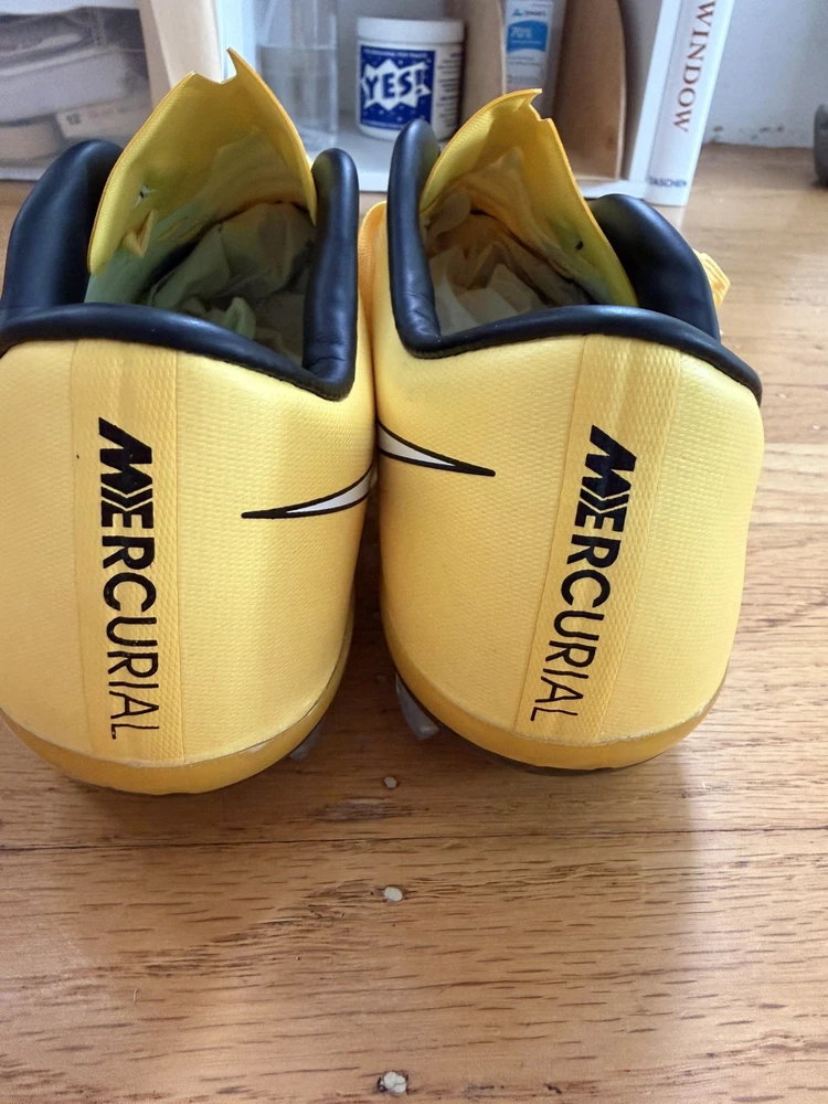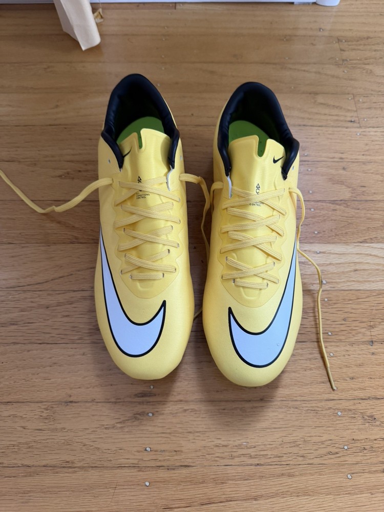 FREE SHIPPING JUST GOT THESE IN STOCK TODAY 12/23 The Nike Mercurial Vapor X FG cleats in yellow are top-notch football soccer boots designed for high performance on the field. With a sleek design and durable construction, these cleats offer excellent traction and support for quick movements and sharp turns. The pink accents add a pop of color to the traditional design, making them a stylish choice for any soccer player looking to make a statement. Ideal for players in the US size 9.5, these cleats are a must-have for any serious athlete.