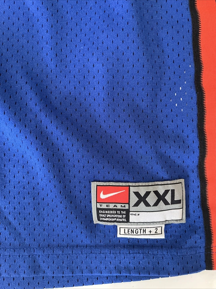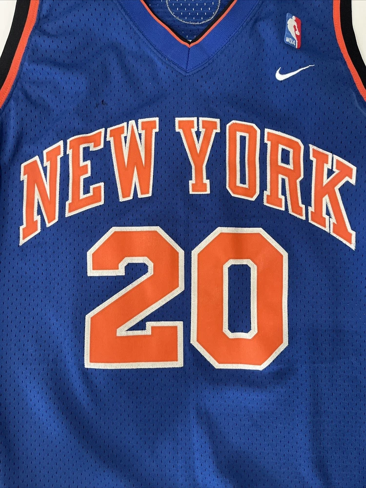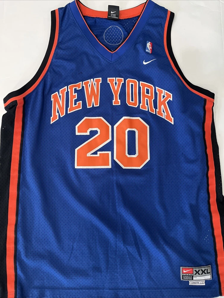 Show your support for the New York Knicks with this Nike NBA #20 Allan Houston Road Away Throwback Jersey. This officially licensed jersey is perfect for any basketball fan and features the iconic blue color of the team. The 2XL size is designed for men and is made with high-quality materials for maximum comfort and durability. This jersey is perfect for wearing to games or just around town to show off your team spirit. It features the name and number of Allan Houston, a former player for the New York Knicks who played in the NBA. This product is made in Korea, Republic of and is a must-have for any Knicks fan. There is a tiny hole in the Jersey, please see pictures.