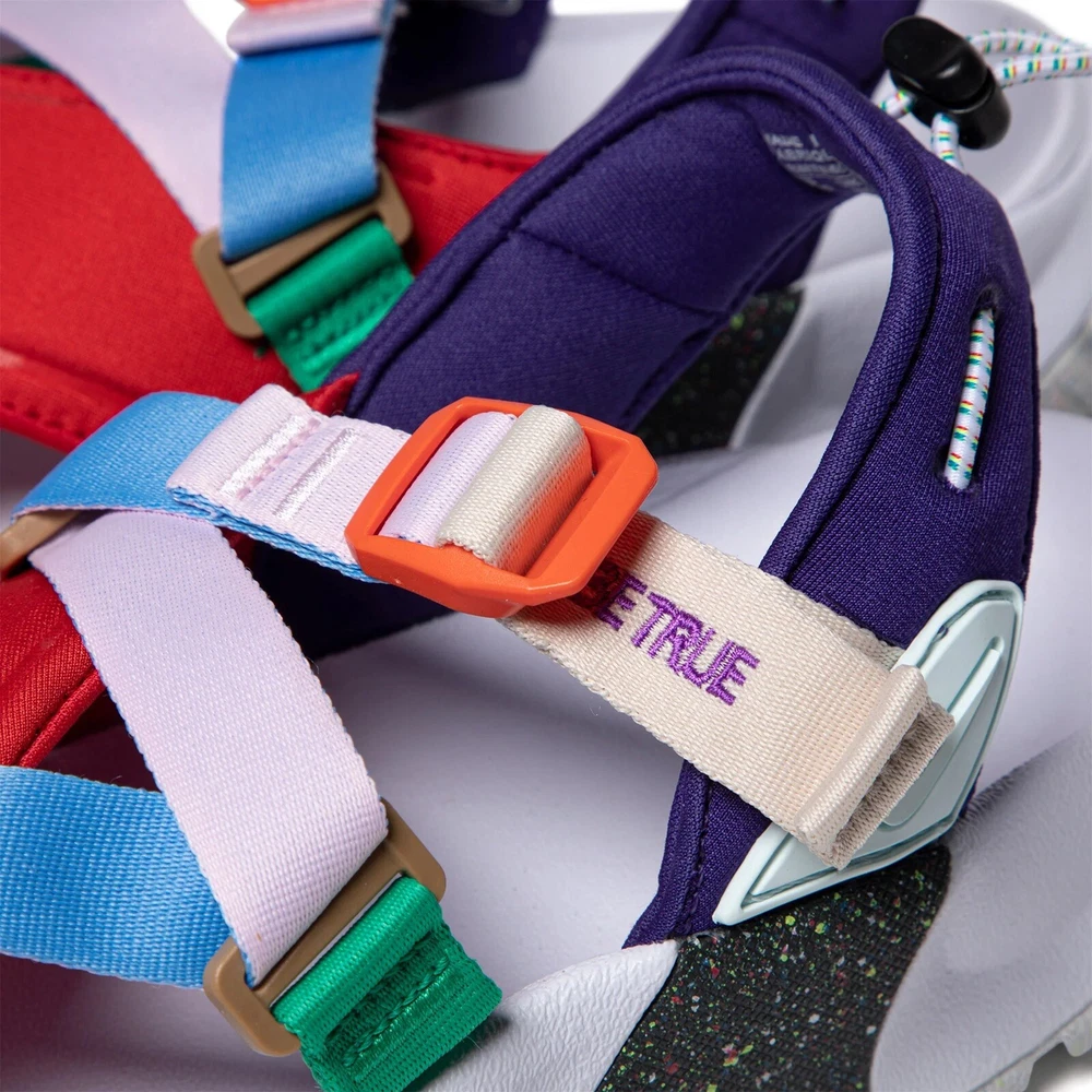 Nike Oneonta Betrue Sandals Mens Size 12 Be True Rainbow Carabiner DR4870-600. Condition is New with tags and box. Nike's Oneonta "Be True" sandals take their name from the Columbia River falls that flow through the labels home state. The sandals feature a rainbow of interlacing webbing and neoprene straps and embroidered lettering. Adjustable fastenings, cinch cord at the heel, a contoured footbed and flecked lug soles provide comfort and superior grip on uneven surfaces. Strap in-the city, sand, and mountains are calling. Highlights: • multicolor webbing neoprene • lightweight and durable construction • embroidered motif • crossover strap detail • open toe • ankle strap • toggle fastening • chunky rubber sole • paint-speckled rugged outsole Color Way: University Red, Glacier Blue, Pink Foam Composition: 100% Rubber Sole with Fabric Outer and Lining