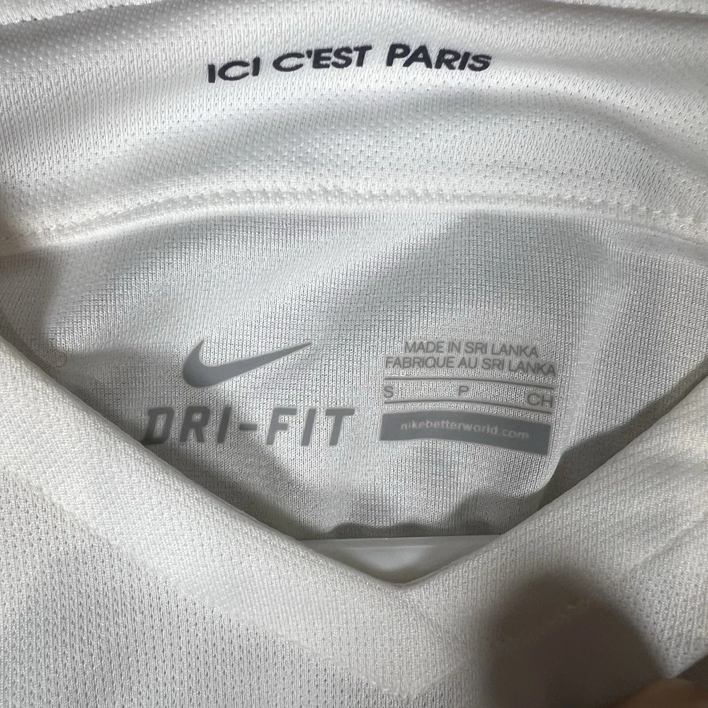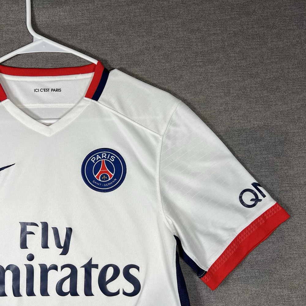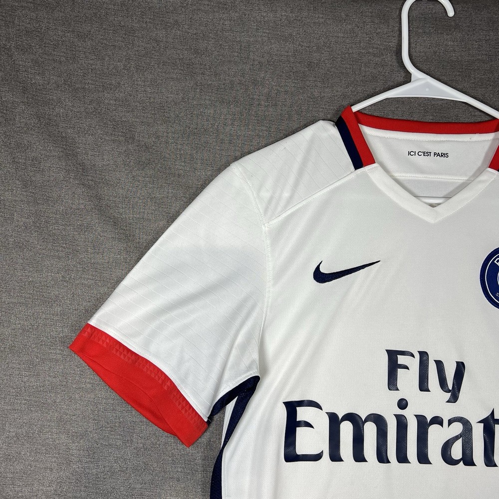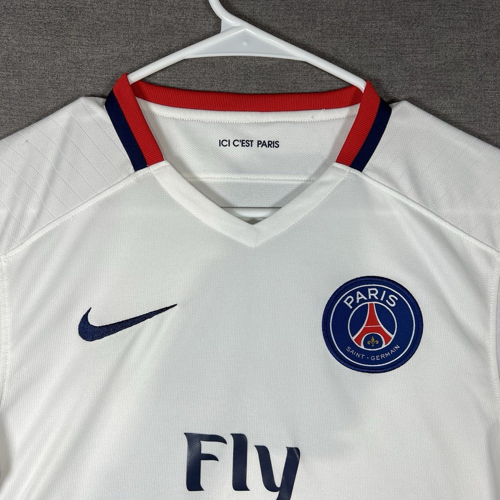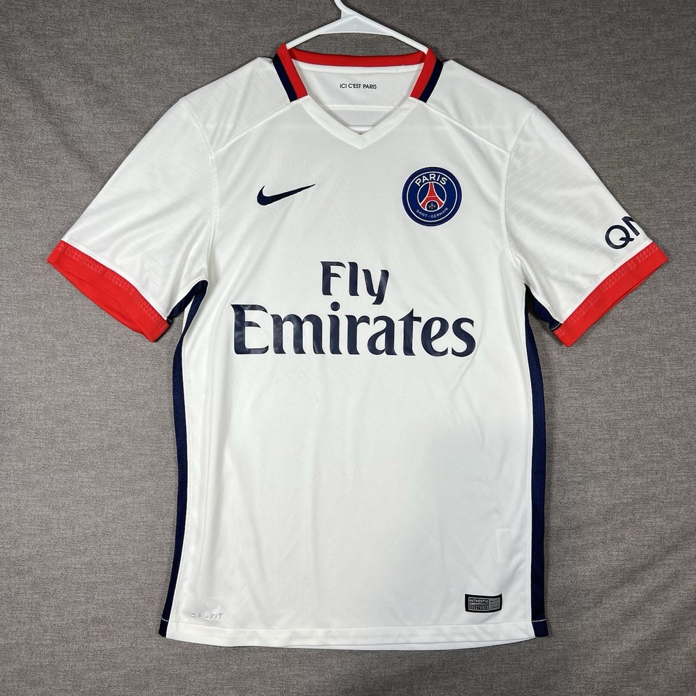 A couple of stains. Please see photos for reference. The Nike Paris Saint-Germain Away Jersey 2015-2016 in Men's Size L is a white officially licensed soccer jersey that represents the iconic Paris Saint-Germain team. Made by Nike, this jersey is designed for fans to show their support for their favorite team during matches or casual wear. With its 12 oz capacity, this jersey is perfect for any PSG supporter looking to represent their team in style.