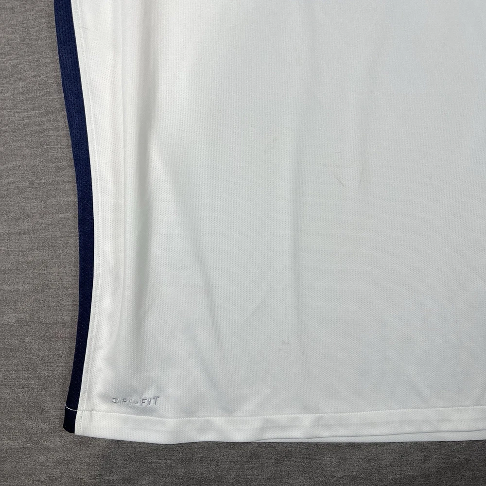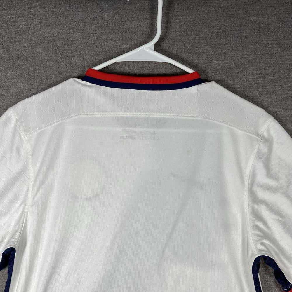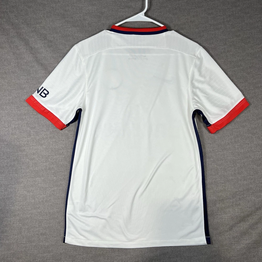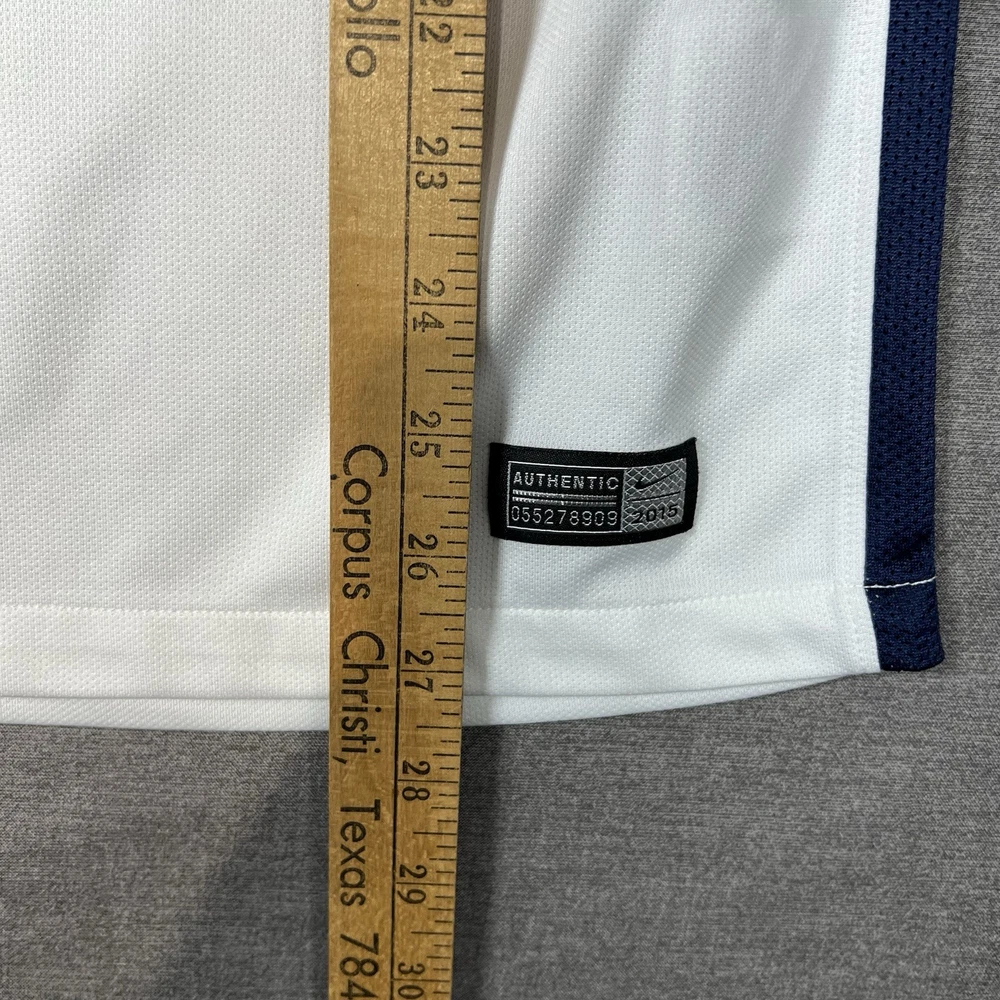 A couple of stains. Please see photos for reference. The Nike Paris Saint-Germain Away Jersey 2015-2016 in Men's Size L is a white officially licensed soccer jersey that represents the iconic Paris Saint-Germain team. Made by Nike, this jersey is designed for fans to show their support for their favorite team during matches or casual wear. With its 12 oz capacity, this jersey is perfect for any PSG supporter looking to represent their team in style.