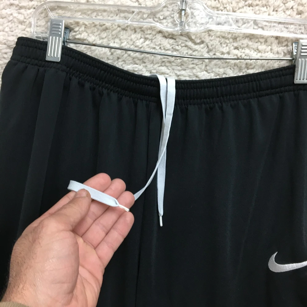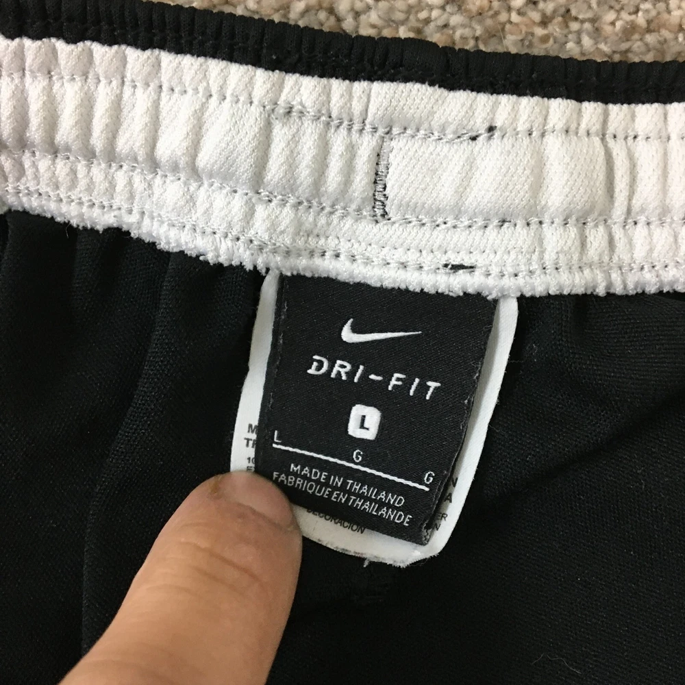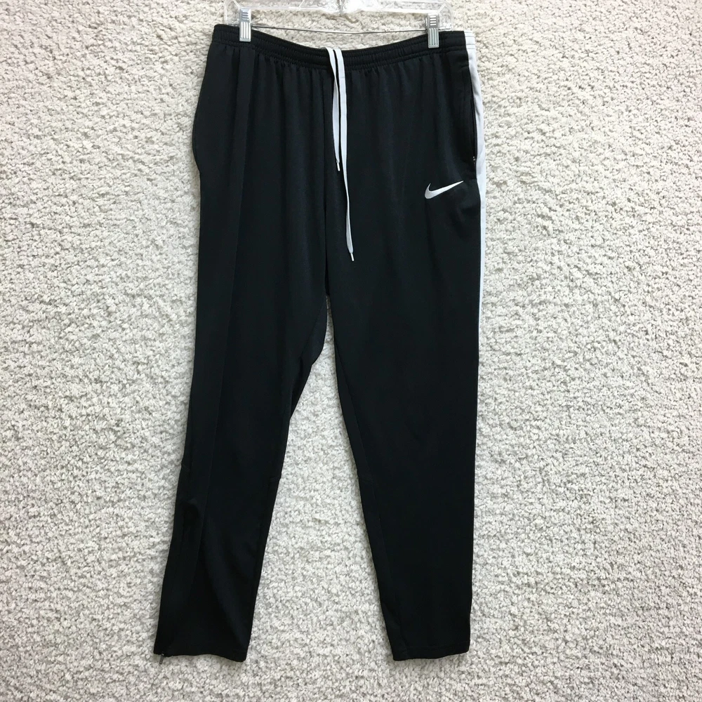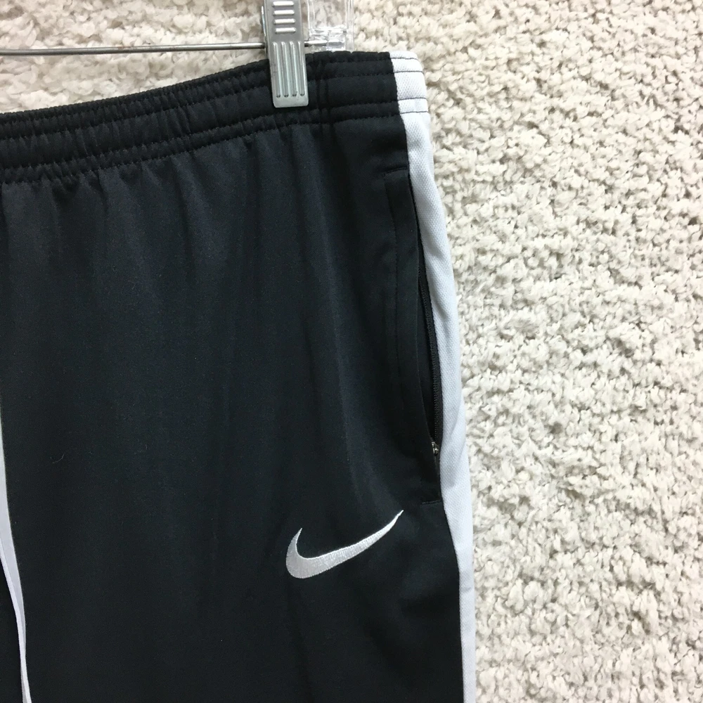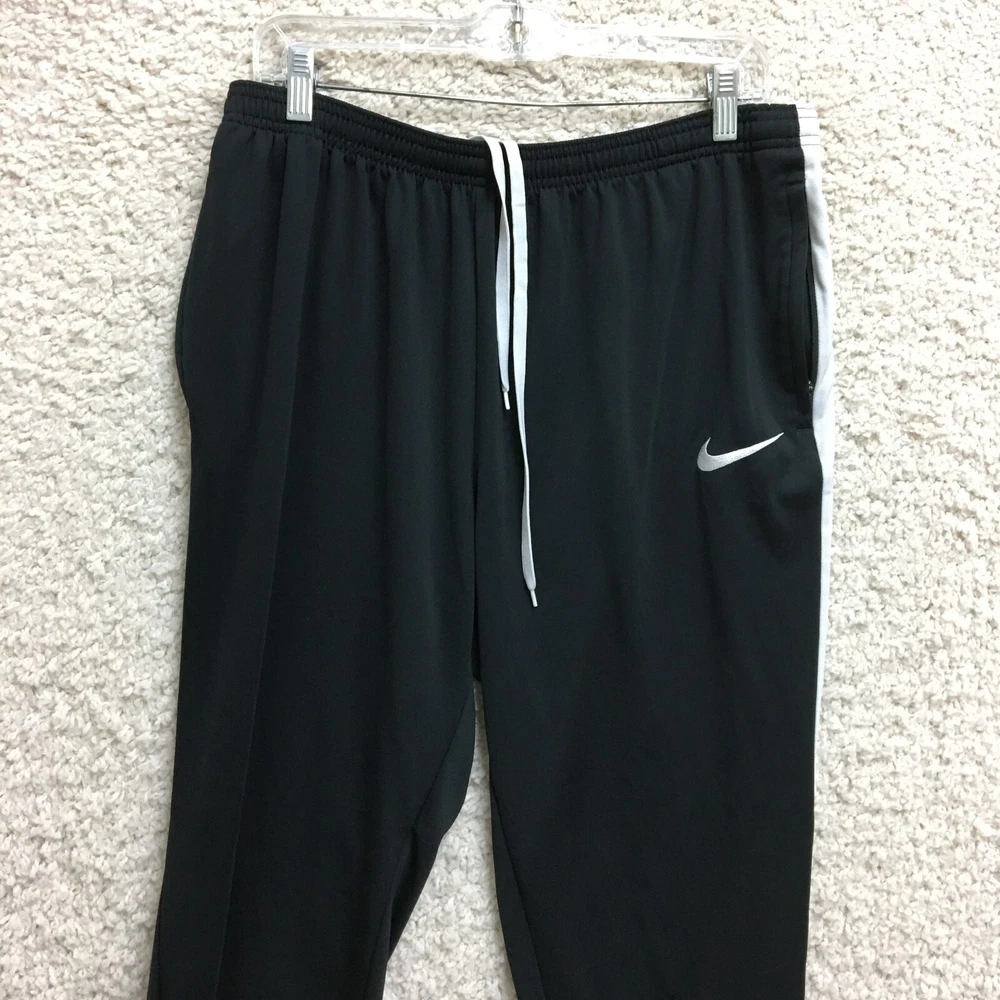 Brand: Nike Garment Care: Machine Washable Season: Fall, Spring, Summer, Winter Color: Black Theme: Athleisure, Logo, Sports Country/Region of Manufacture: Thailand Waist Size: 32 in Type: Pants Closure: Drawstring Leg Style: Tapered Performance/Activity: Basketball, Gym & Training, Running & Jogging Fit: Regular Department: Men Size: L Size Type: Regular Occasion: Activewear, Casual Style: Track Pants Compression Area: Leg, Waist Seller Notes: “Good Used Condition. Please, See Pictures for Full Condition and Measurements.” Material: 100% Polyester, Polyester Product Line: Nike Dri-FIT Pattern: Solid Fabric Type: Blended Fabric Features: Breathable, Comfort, Easy Care, Elastic Waist, Pockets, Zip Pocket Inseam: 28 in
