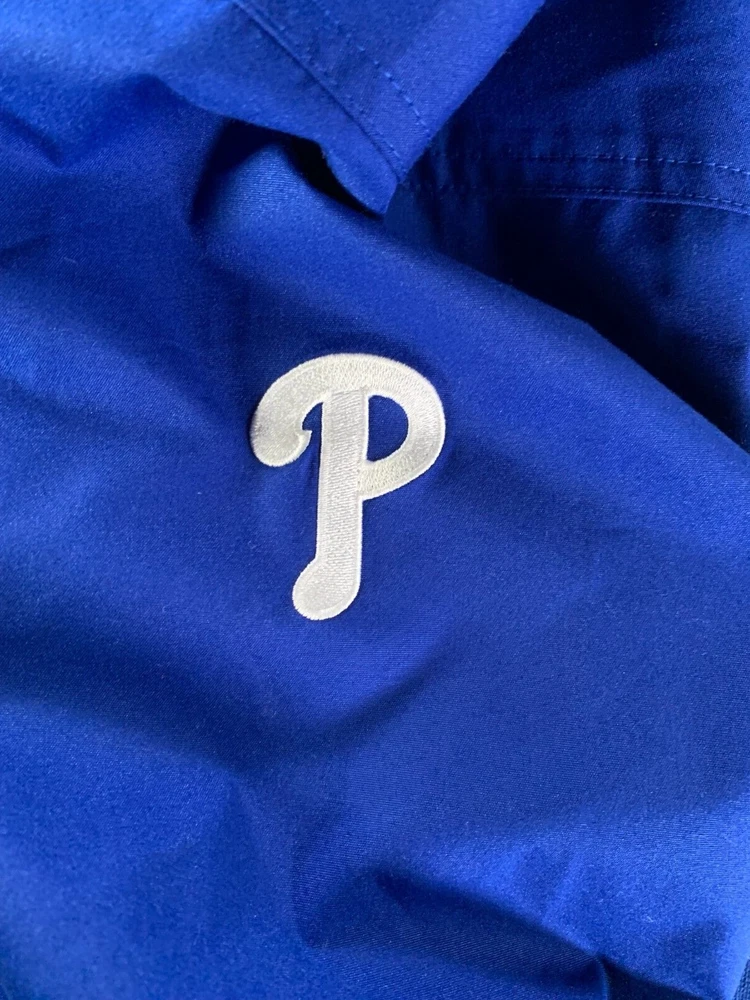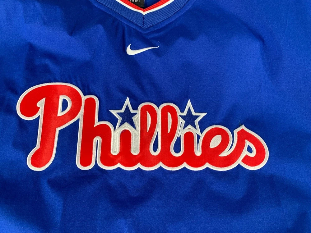 eBay Listing Template Our Listings Add to Favorites Feedback About Us Contact Us Philadelphia baseball! This royal blue Nike pullover Features: Classic Phillies script logo with stars V-neck design with red/white striped trim Lightweight windbreaker material Side pockets for convenience Elastic waist and cuffs Genuine MLB merchandise tag Condition: Pre-owned with normal wear. No major flaws or stains - just ready for more game days! This versatile jacket is perfect for those spring training games or cool evening matchups at Citizens Bank Park. Rock your Phillies pride in authentic Nike style! 💫 Follow our store for weekly MLB gear drops and exclusive subscriber deals! We're constantly adding more vintage and current sports collectibles. SKU: 4218 Please check out my other items for sale! Shop by Categories Women's Clothing Women's Shoes Handbags Jewelry Men's Clothing Men's Shoes Hats Watches Useful Links Our Listings Add to Favorites Feedback About Us Contact Us Store Newsletter Add Store to your Favorites and receive email newsletters about new items and special promotions! Subscribe Now