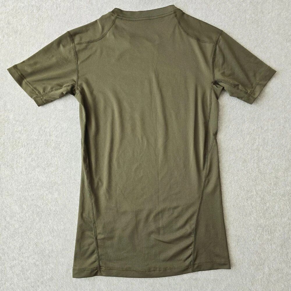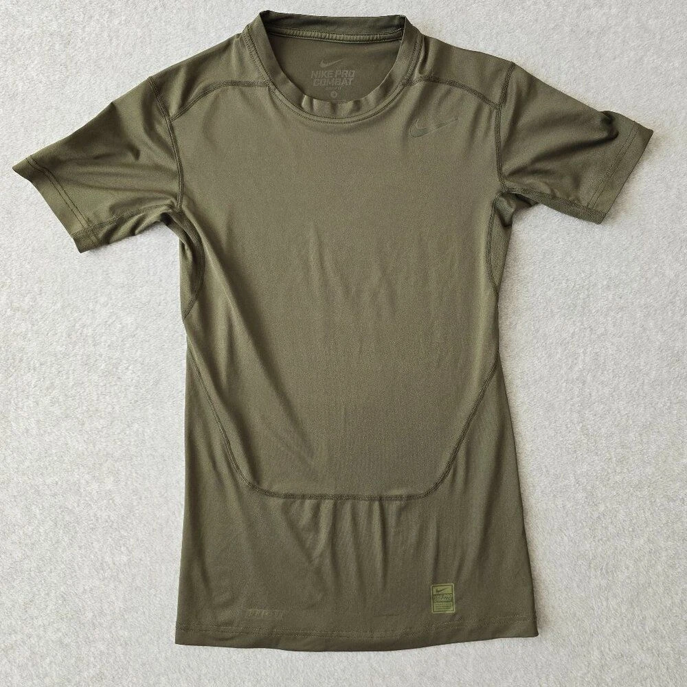 Nike Pro Combat Mens Green Olive Fitted Dri-Fit Compression Short Sleeve Shirt Pullover Active Performance CONDITION: Gently Used, No rips or stains (See Pictures) Size: Medium Material: Polyester/Spandex Approximate Measurements: Arm pit to Arm Pit: 14 1/2 " Length 26 1/2" Thanks for Visiting!