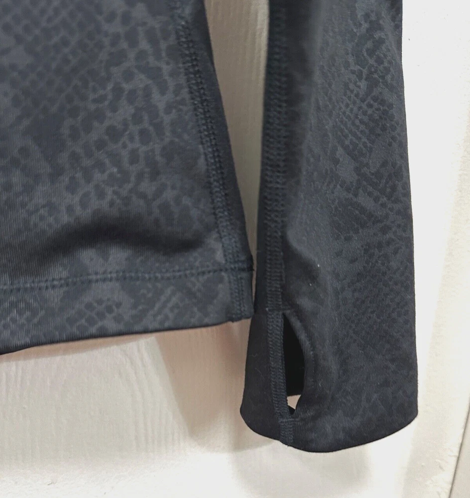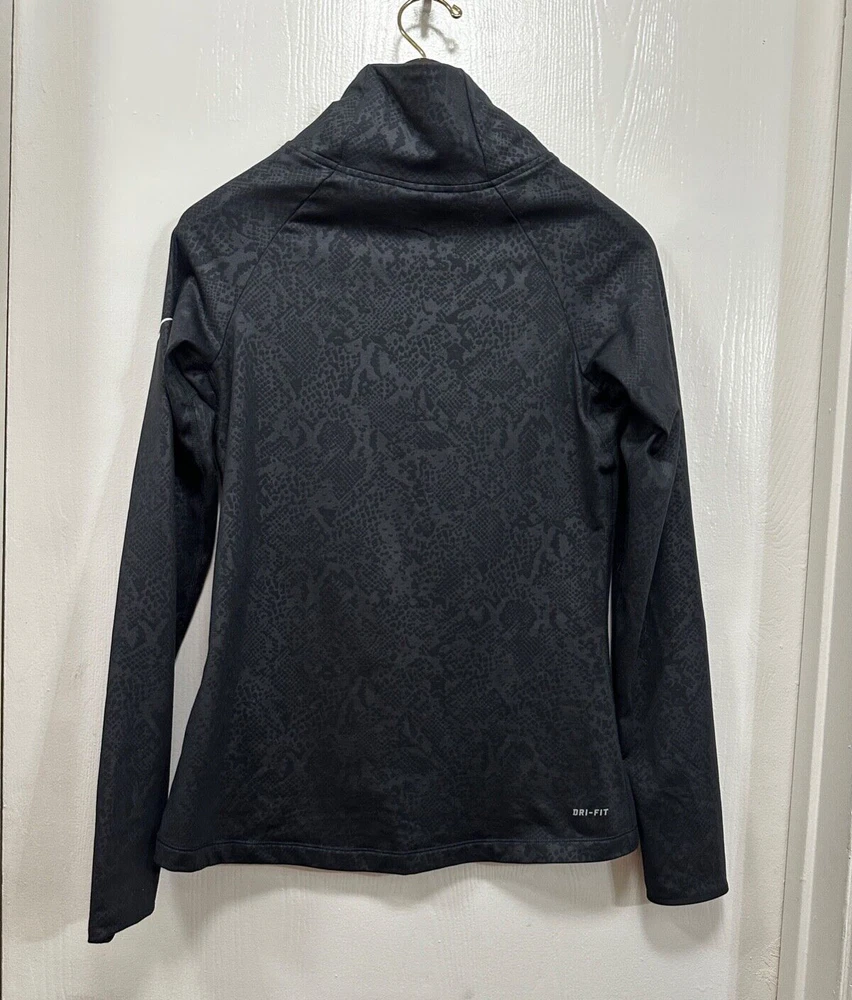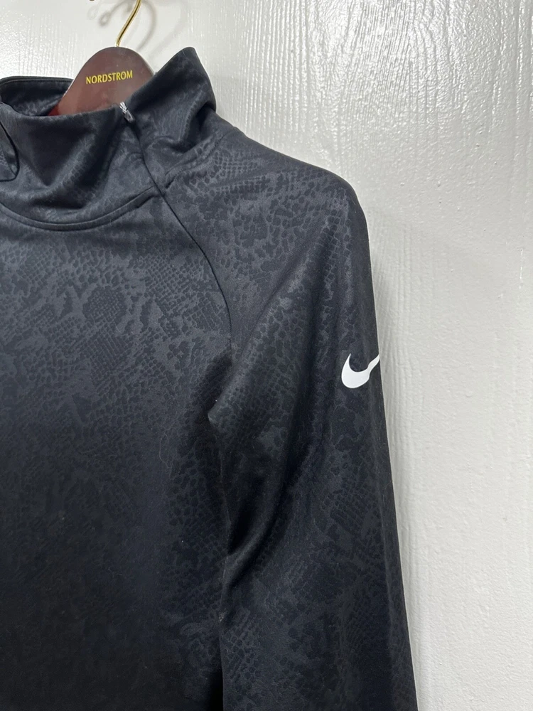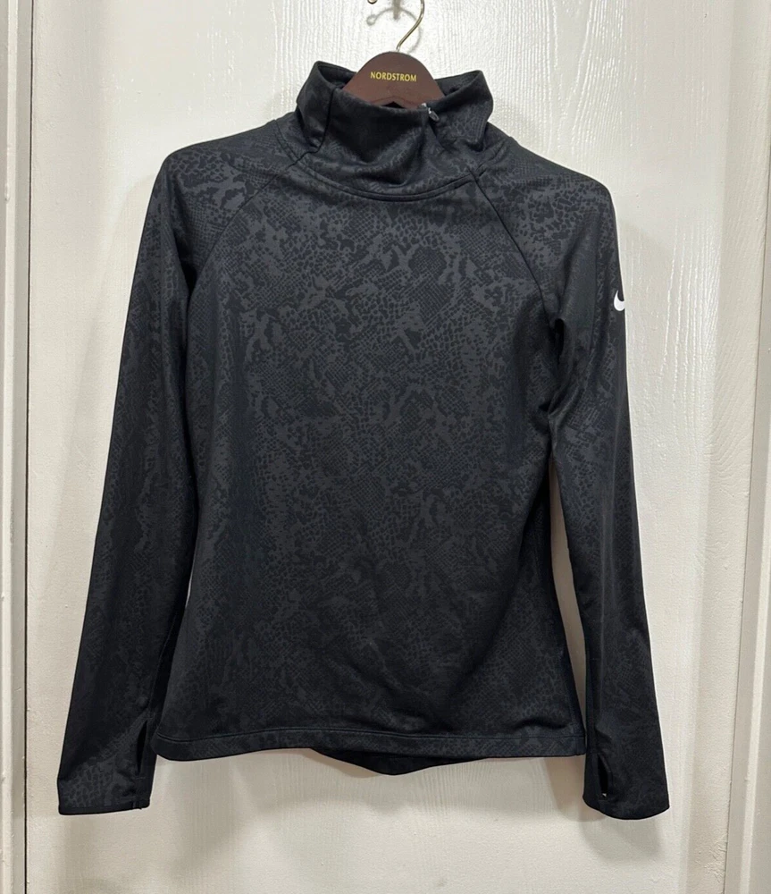 This Nike Pro sweatshirt in size M features a black snake print design, a mock neck with a zip closure, long sleeves with thumb holes, and is made of polyester and spandex. It is a pullover style with the Nike logo accents, suitable for activewear like gym training and running. The sweatshirt is lined with polyester and part of the Nike Pro product line.