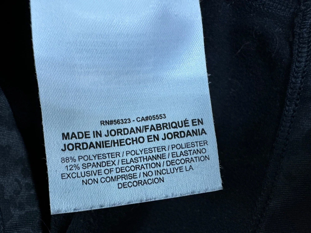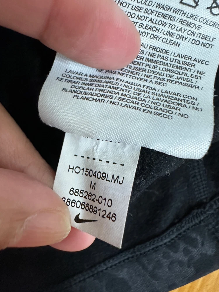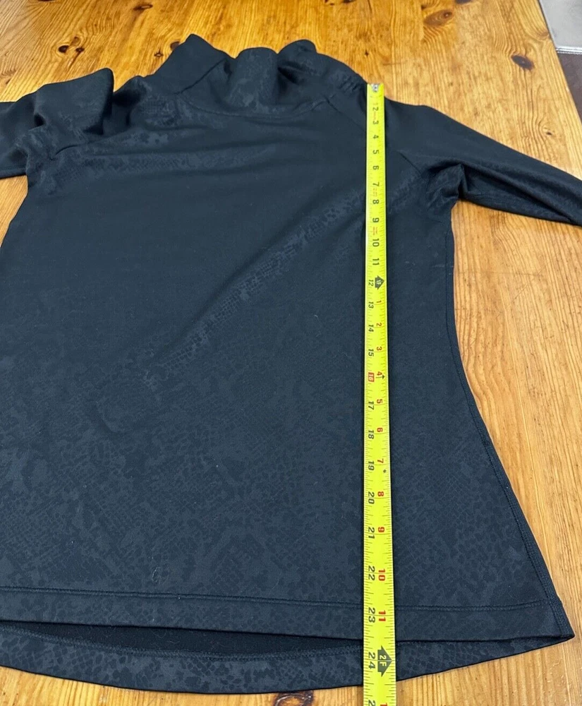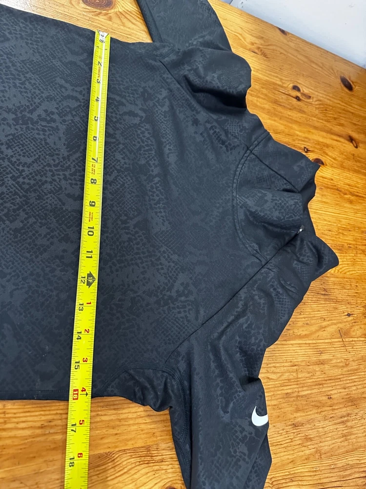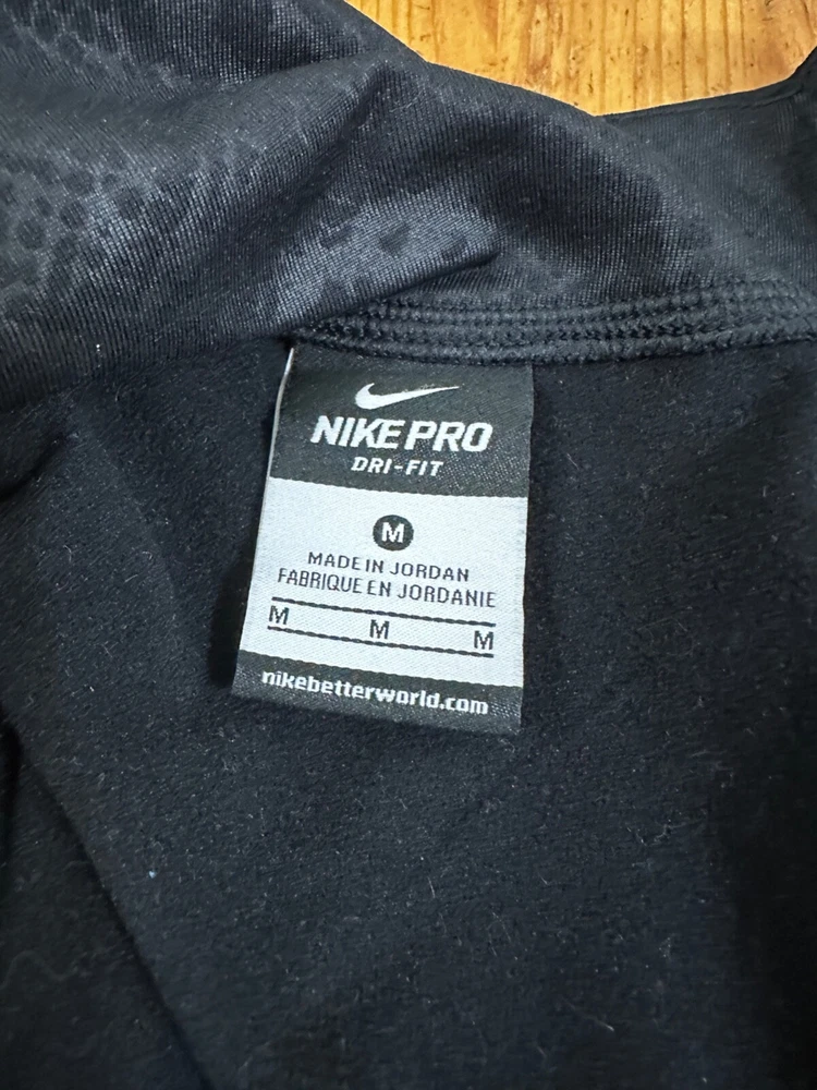 This Nike Pro sweatshirt in size M features a black snake print design, a mock neck with a zip closure, long sleeves with thumb holes, and is made of polyester and spandex. It is a pullover style with the Nike logo accents, suitable for activewear like gym training and running. The sweatshirt is lined with polyester and part of the Nike Pro product line.