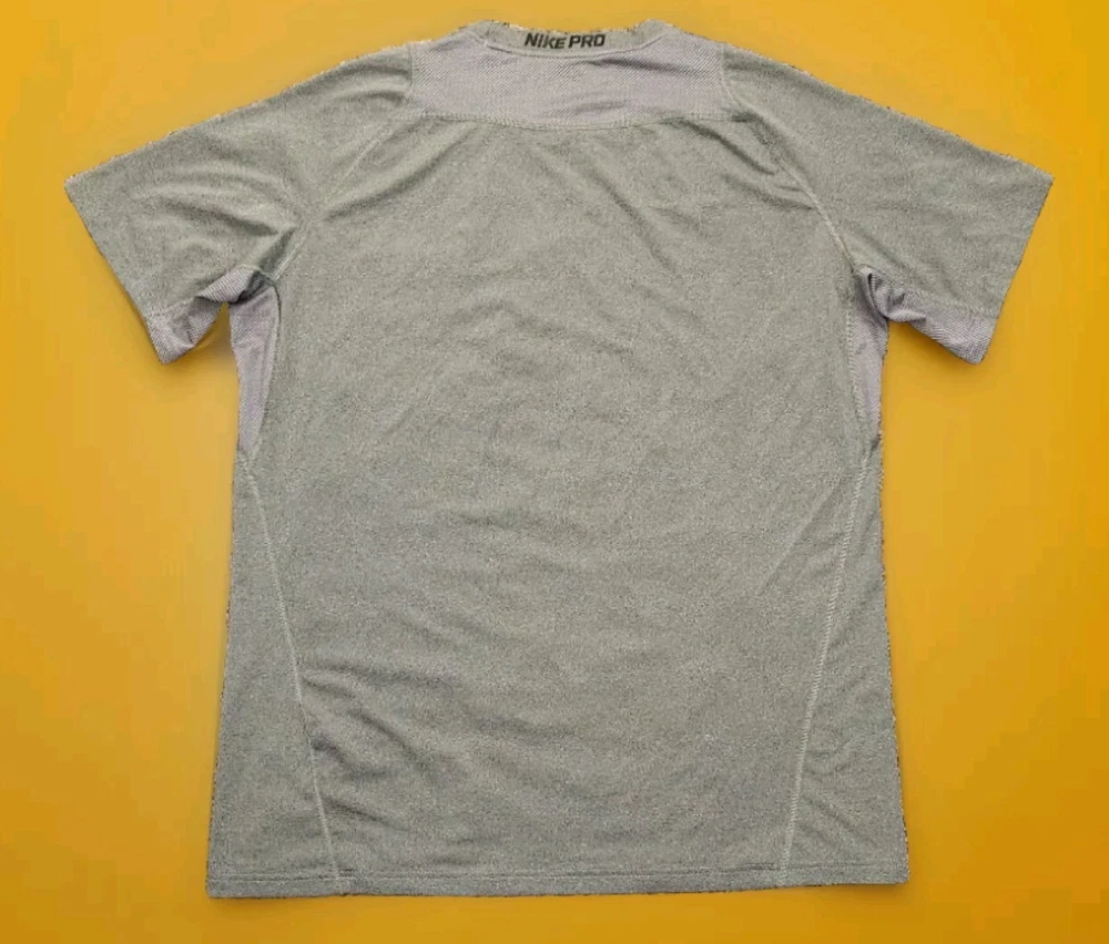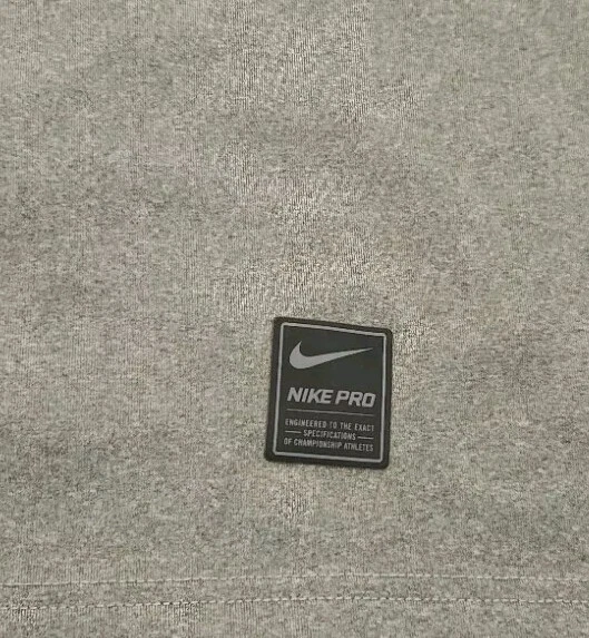 This Nike Pro Dri-Fit Men's Tee is a solid gray short sleeve shirt designed for athletic performance. Made of a polyester-spandex blended fabric, it features a crew neck and pullover closure. The shirt is lightweight, moisture-wicking, and breathable, making it ideal for activities like gym training, cross-training, bodybuilding, and running. With its athletic fit and Nike Pro branding, this XL tee is a versatile choice for sports and workouts. In good condition!