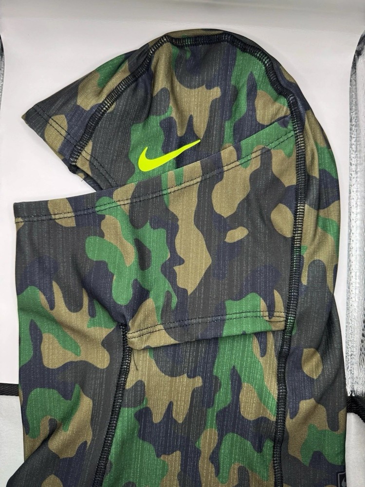 The Nike Pro Therma-Fit Hyperwarm Hood Ski Mask is a brand new in box balaclava designed for skiing. This green camo mask by Nike is made for unisex adults and features a one size fits all design. With a focus on performance and activity, this ski mask is perfect for cold weather conditions and outdoor sports. Made in Vietnam, this high-quality headwear offers both style and functionality for any skiing enthusiast.