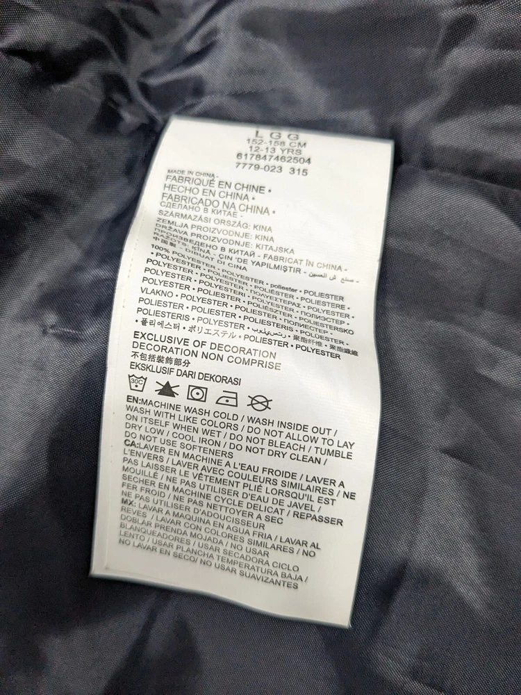Really cool jacket. See photos. Doesn't come with the inner lining. Boys size large 12-13 years. C1