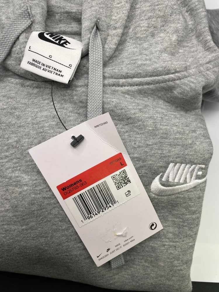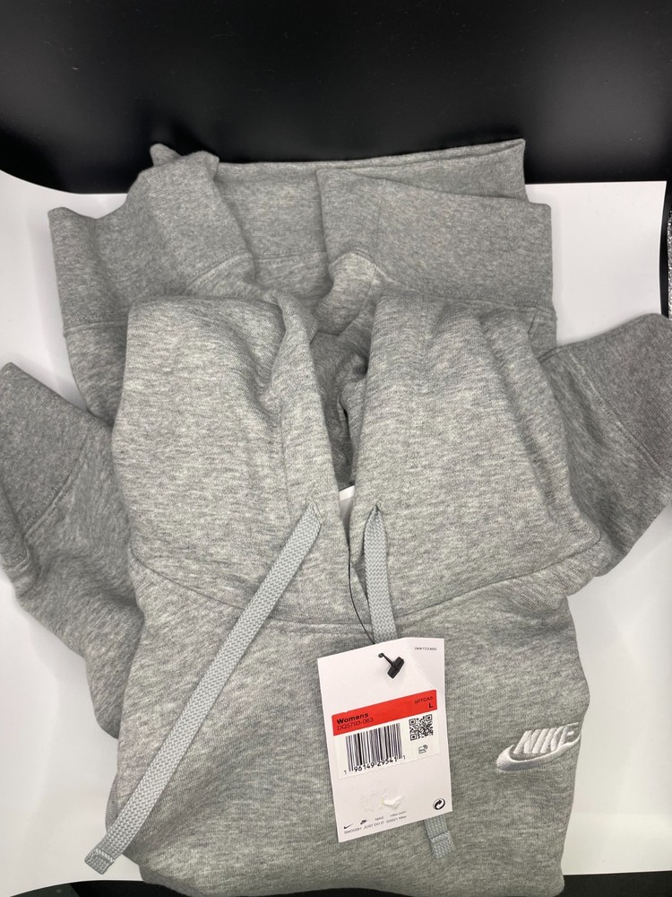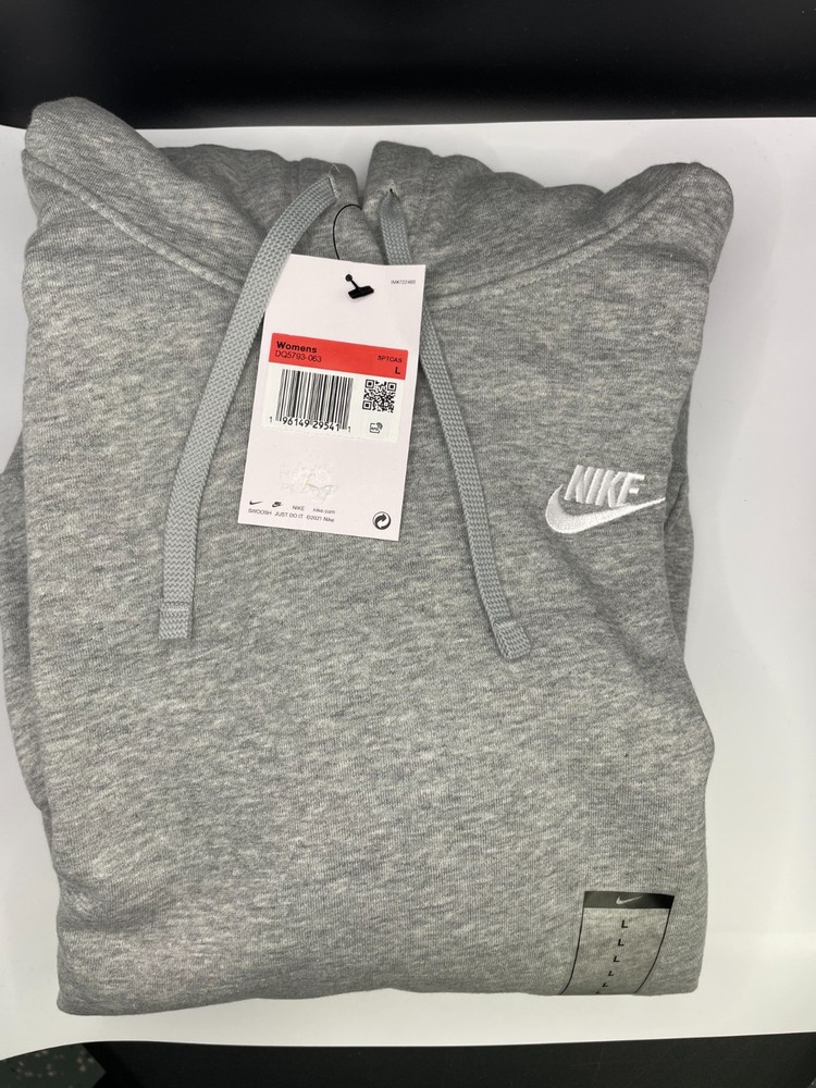 The Nike Sportswear Club Fleece Women's Pullover Hoodie in Heather Grey, size large, is a stylish and comfortable activewear piece perfect for any casual occasion. Made from cozy fleece fabric, this hoodie features the iconic Nike Sportswear logo and a classic pullover style, making it a versatile addition to any wardrobe. This hoodie is designed for women who appreciate both fashion and functionality, ensuring they stay warm and chic during their workouts or everyday activities.